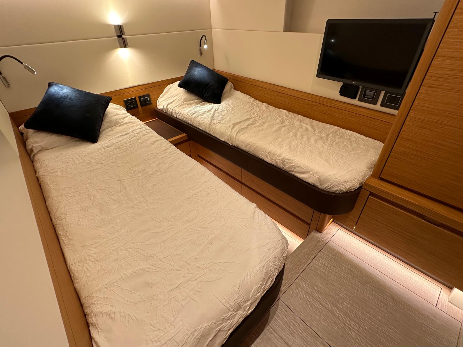 Guest cabin to port side with twin berths and en suite head with wc, washbasin and separate shower