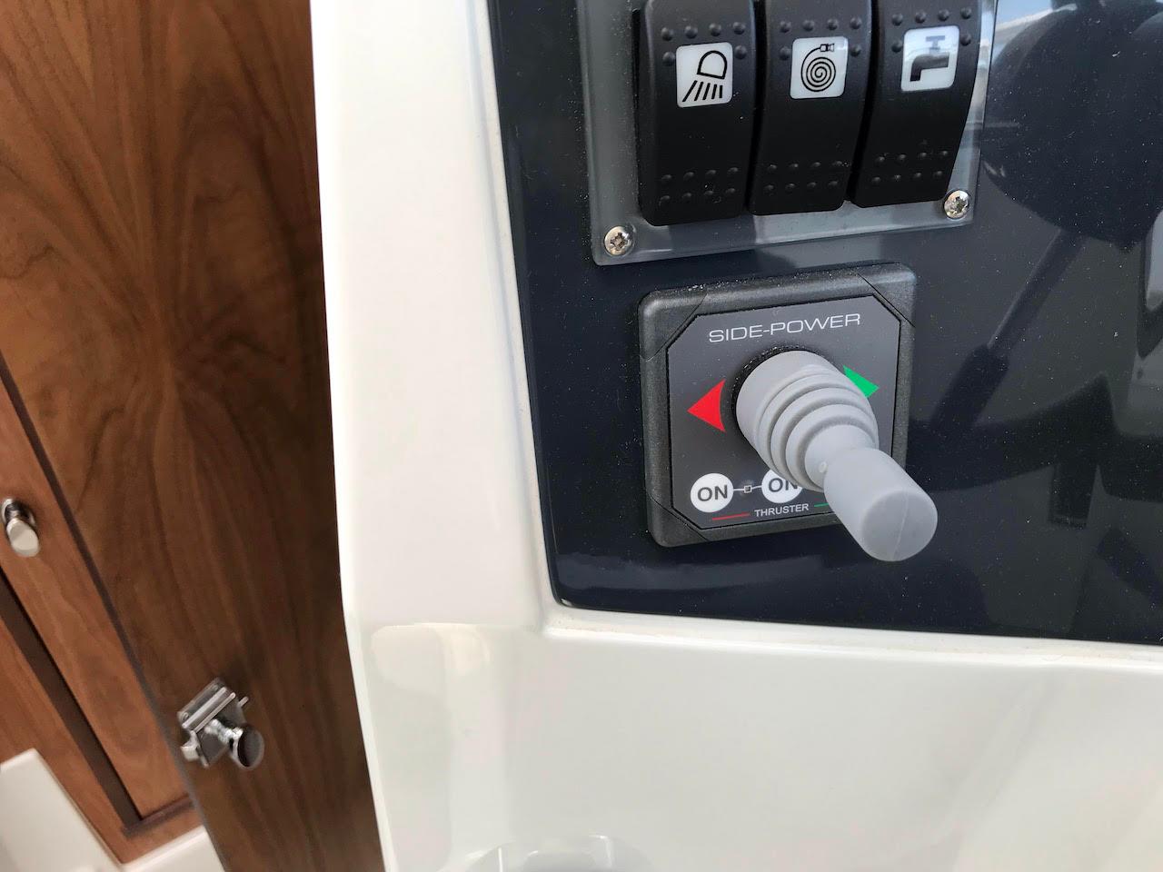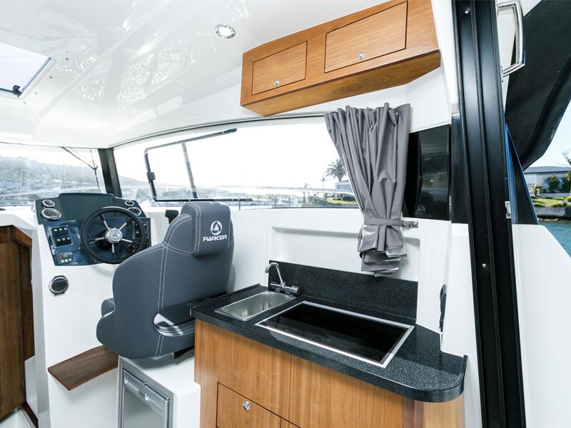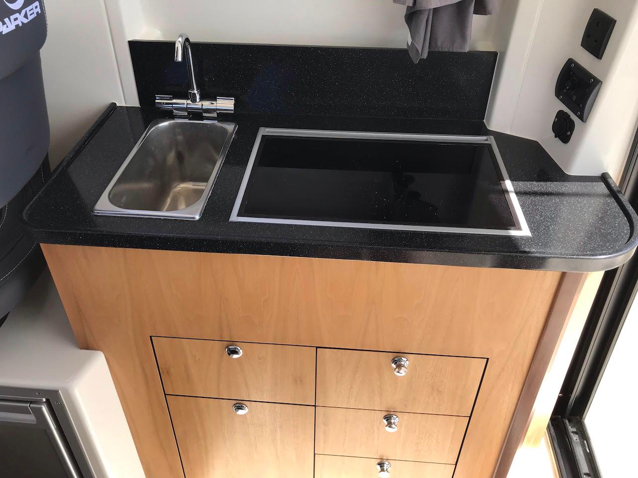 Galley positioned behind helm is equipped with twin hob ceramic stove, sink and fridge with storage