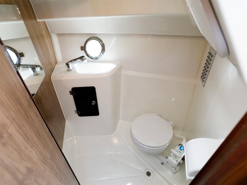 Heads compartment to starboard with marine toilet and holding tank, shower and sink