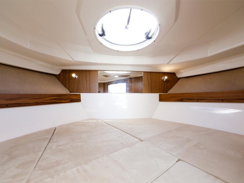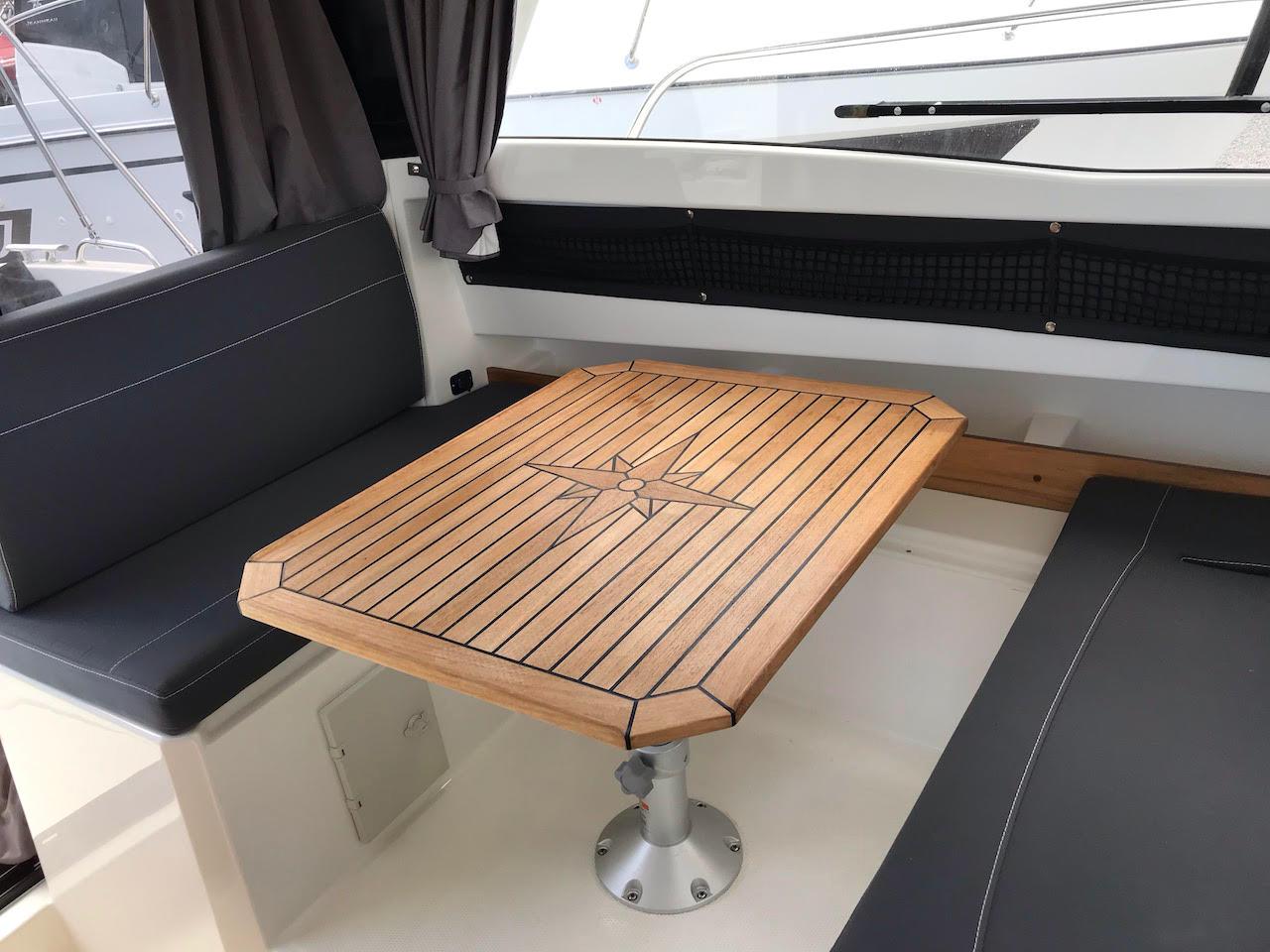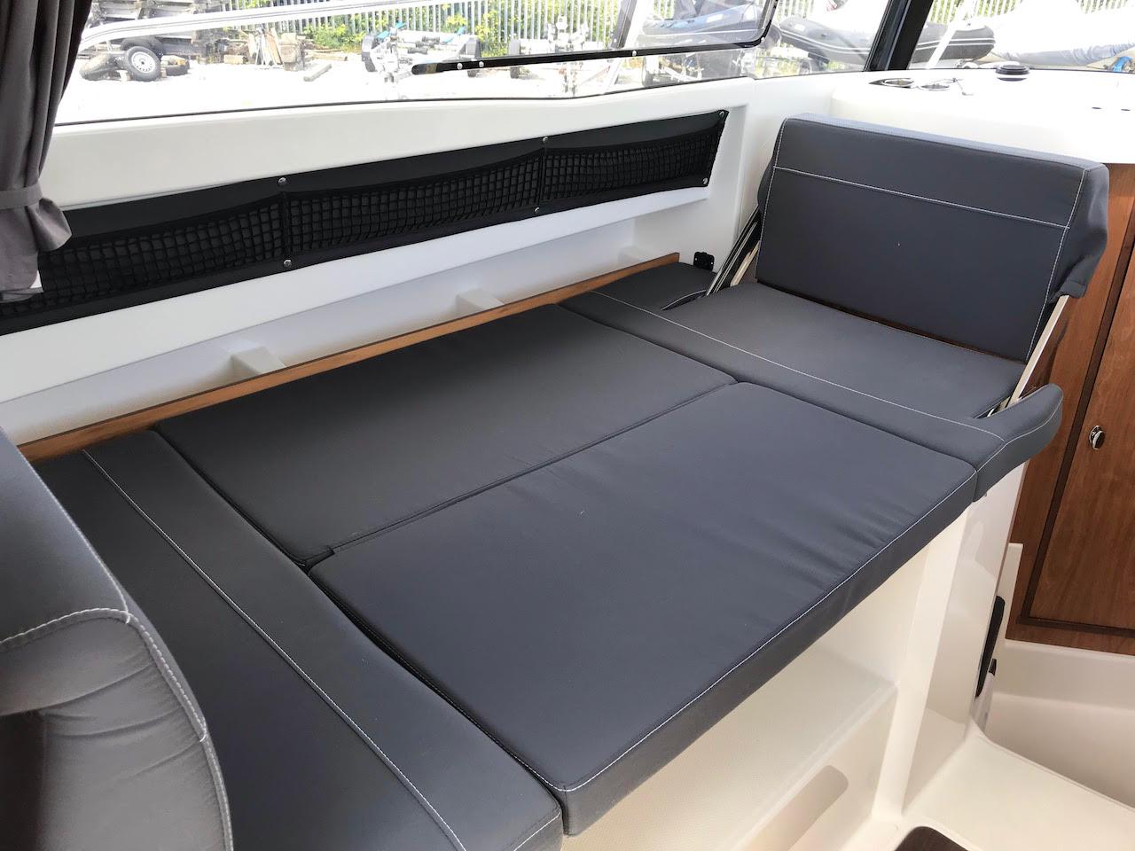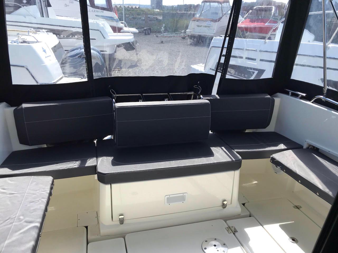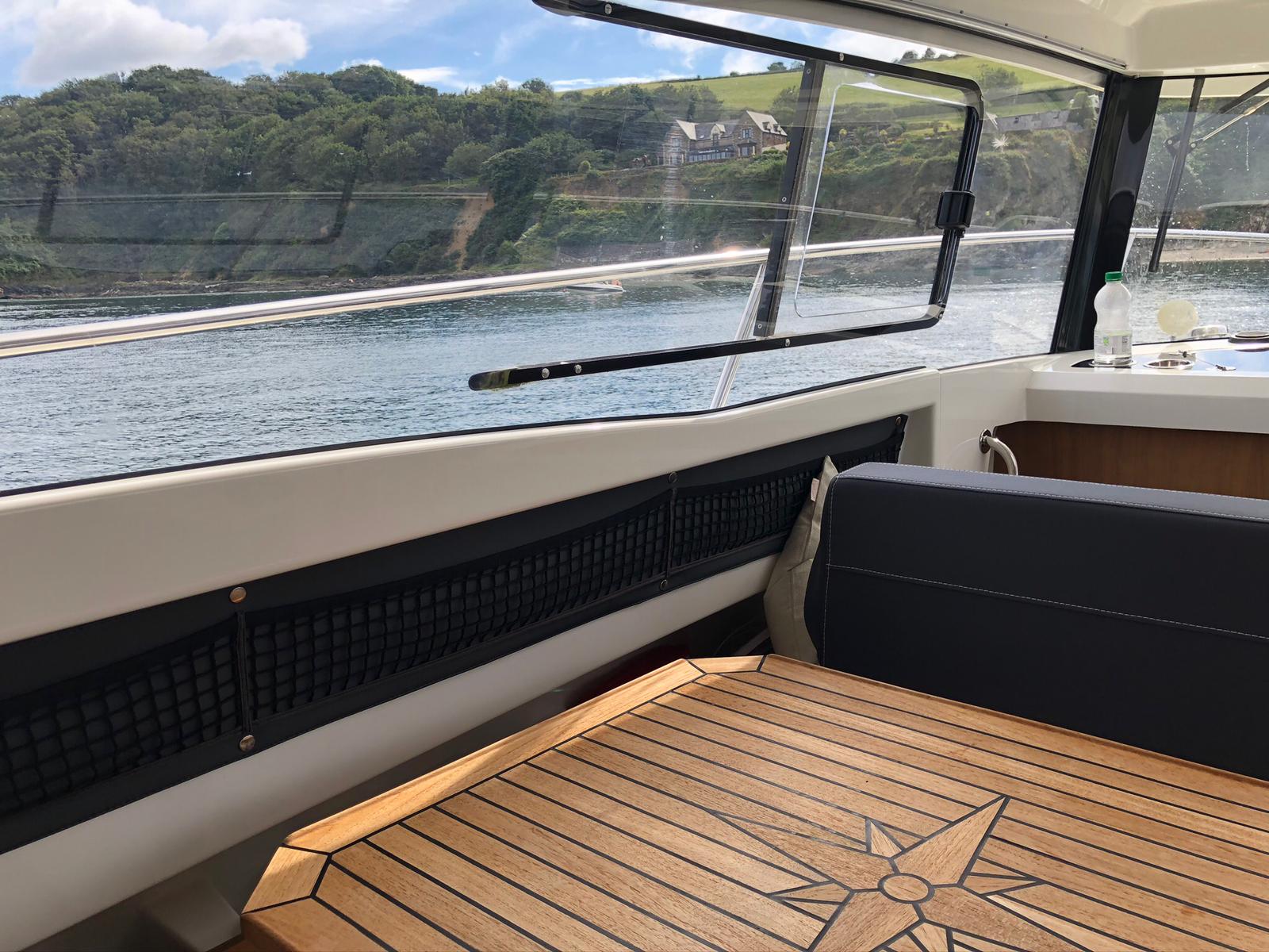 Large cockpit with cushioned seating, leading on to bathing platform.