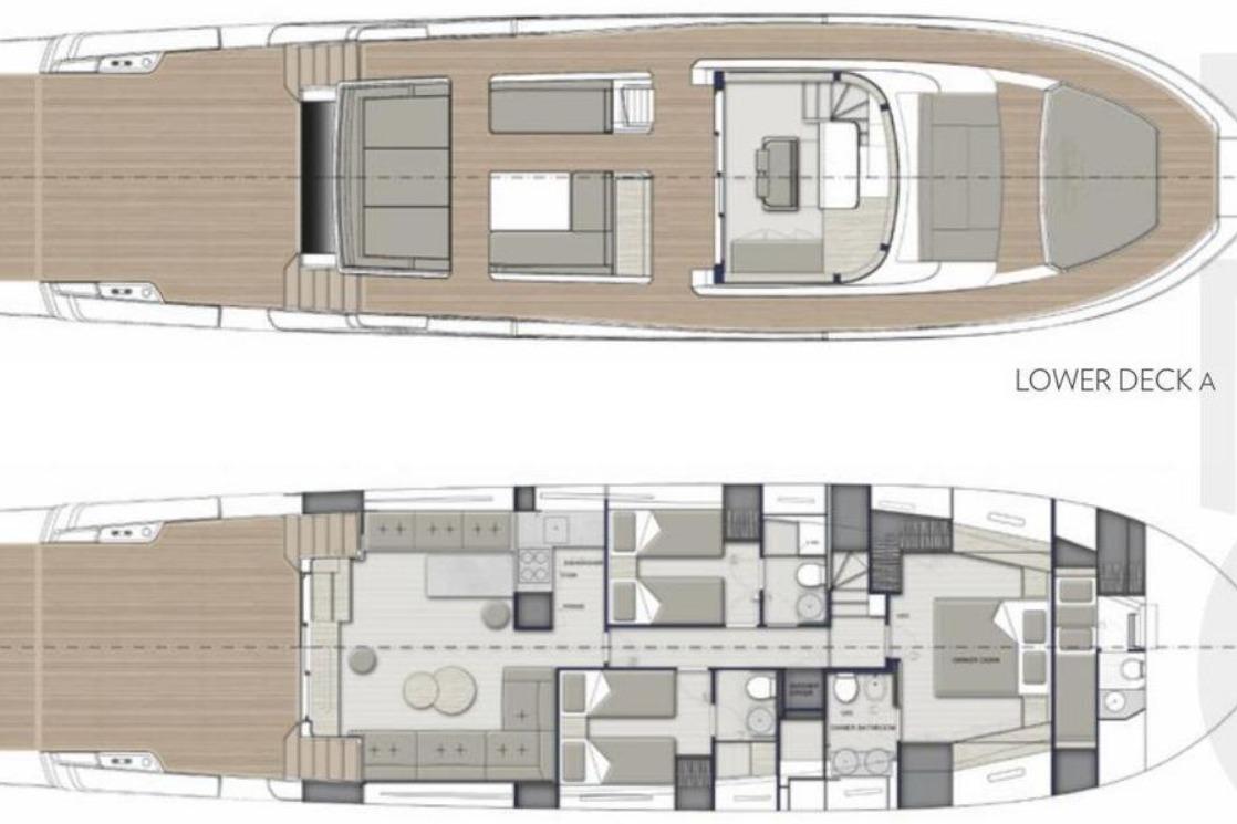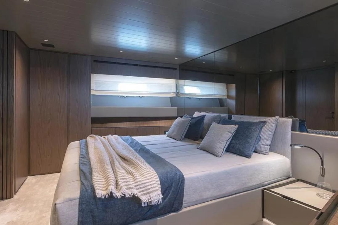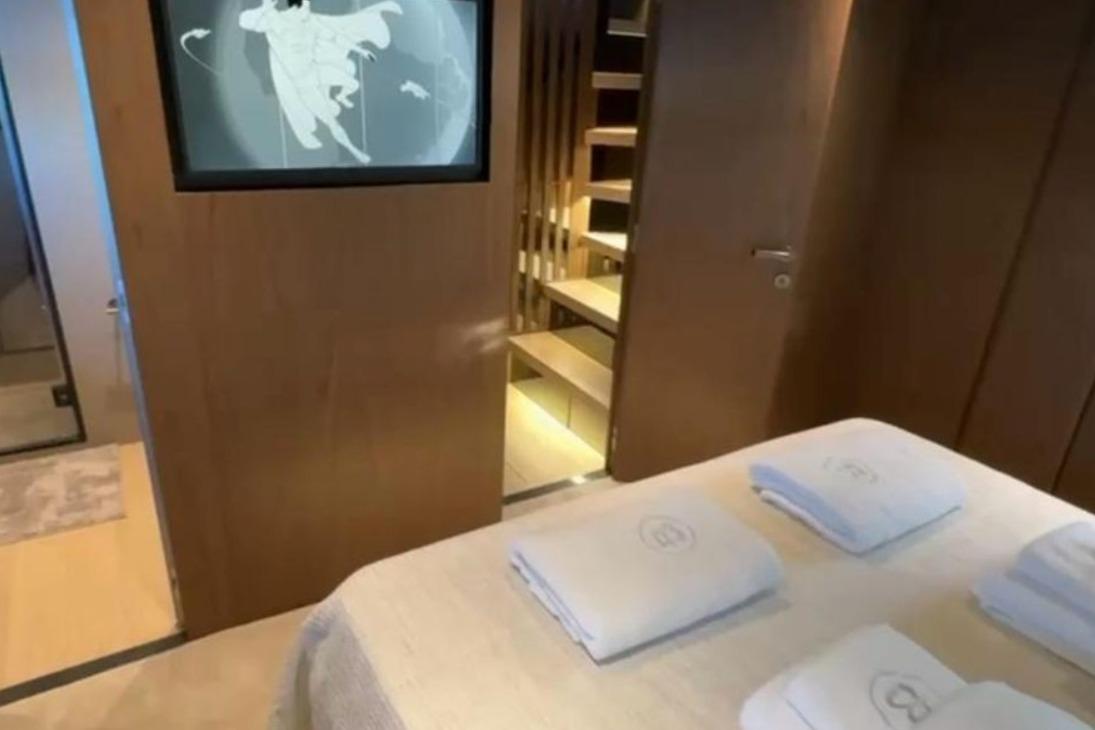 Accommodation is arranged for seamless comfort, with a starboard guest cabin featuring sliding beds, a luxurious L-shaped Flexform sofa in the saloon, and bespoke decorative elements throughout. The main saloon’s 8 transformable table seats , and the lower deck offers additional entertainment features, including an up-down TV system. The yacht’s layout ensures privacy for owners while offering versatile spaces for guests, making her perfect for family cruising or entertaining small groups.