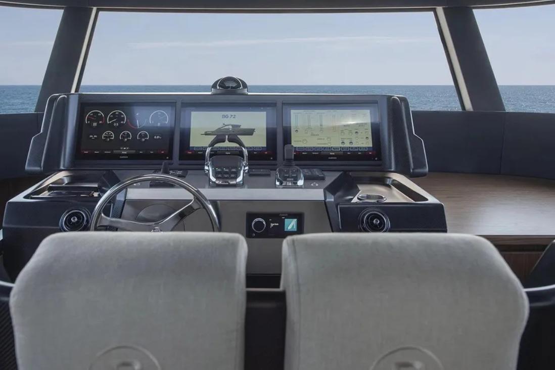 The BG74 excels in outdoor lifestyle, with bow and stern sunlounges, full wet bar equipped with electric Teppanyaki, and ample seating with premium cushions. The starboard hydraulic crane facilitates tender and water toy handling, while underwater lights enhance evening ambiance. The flybridge and cockpit areas provide generous entertaining spaces, including shaded dining and sunbathing options for guests, seamlessly blending functionality and luxury.
