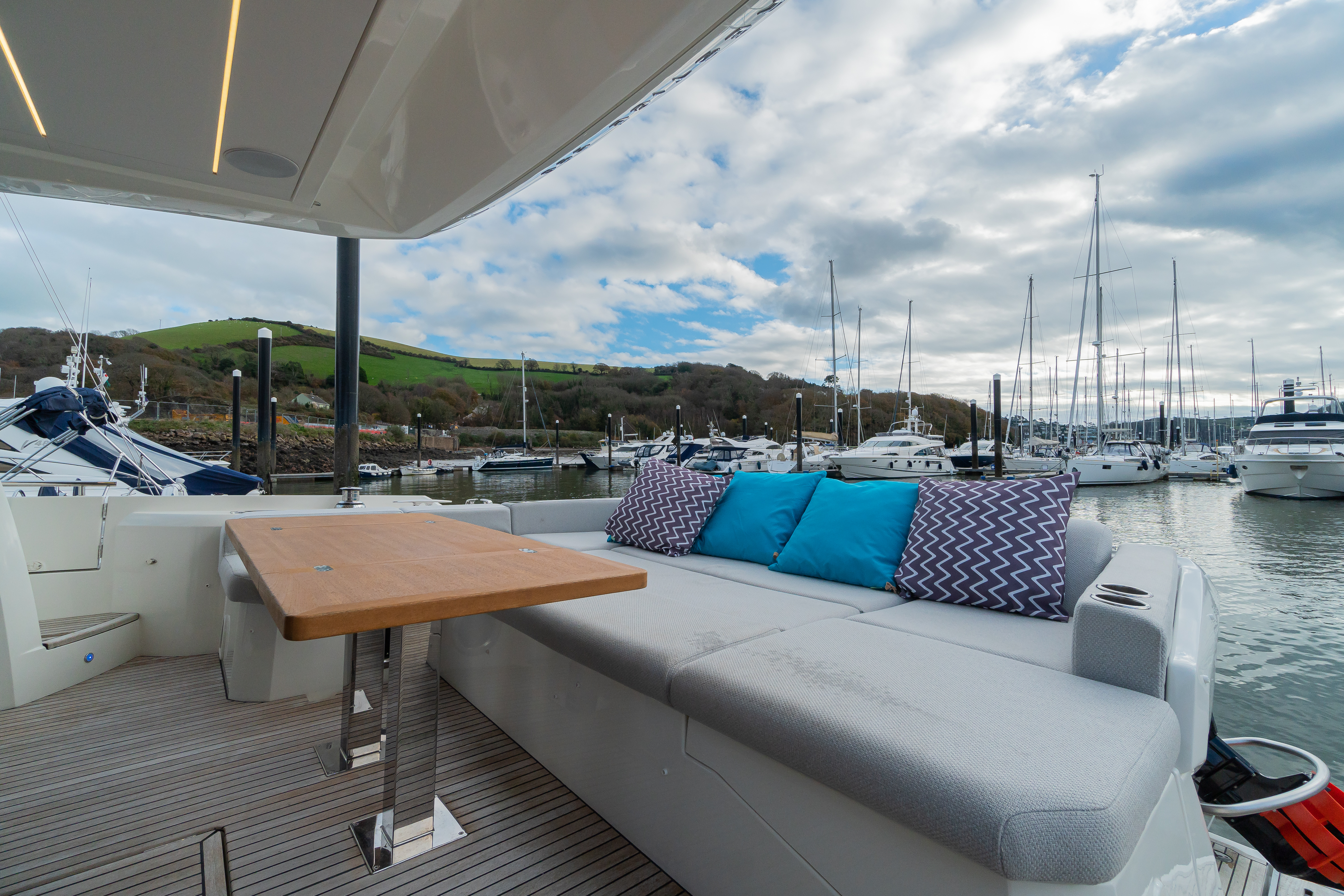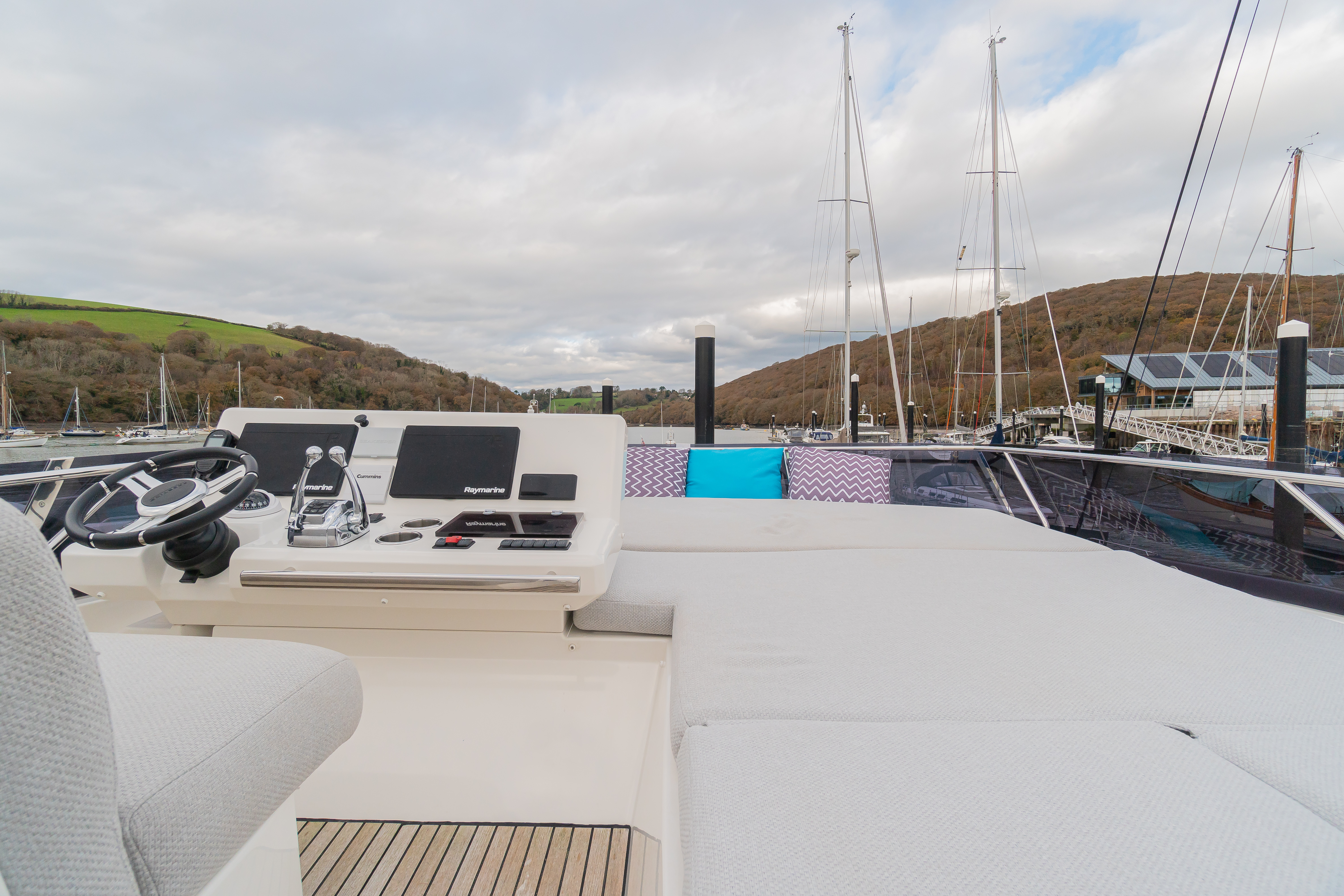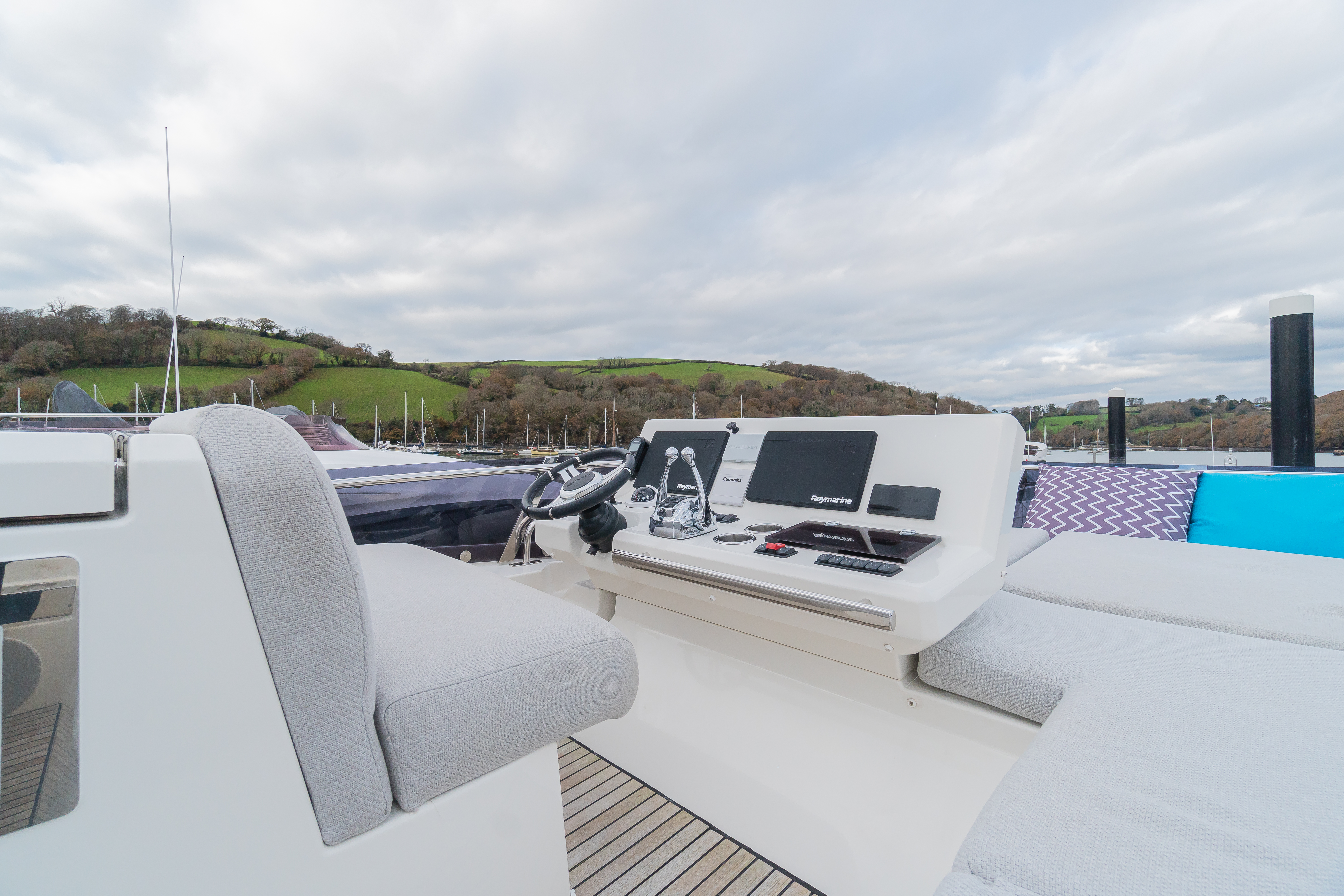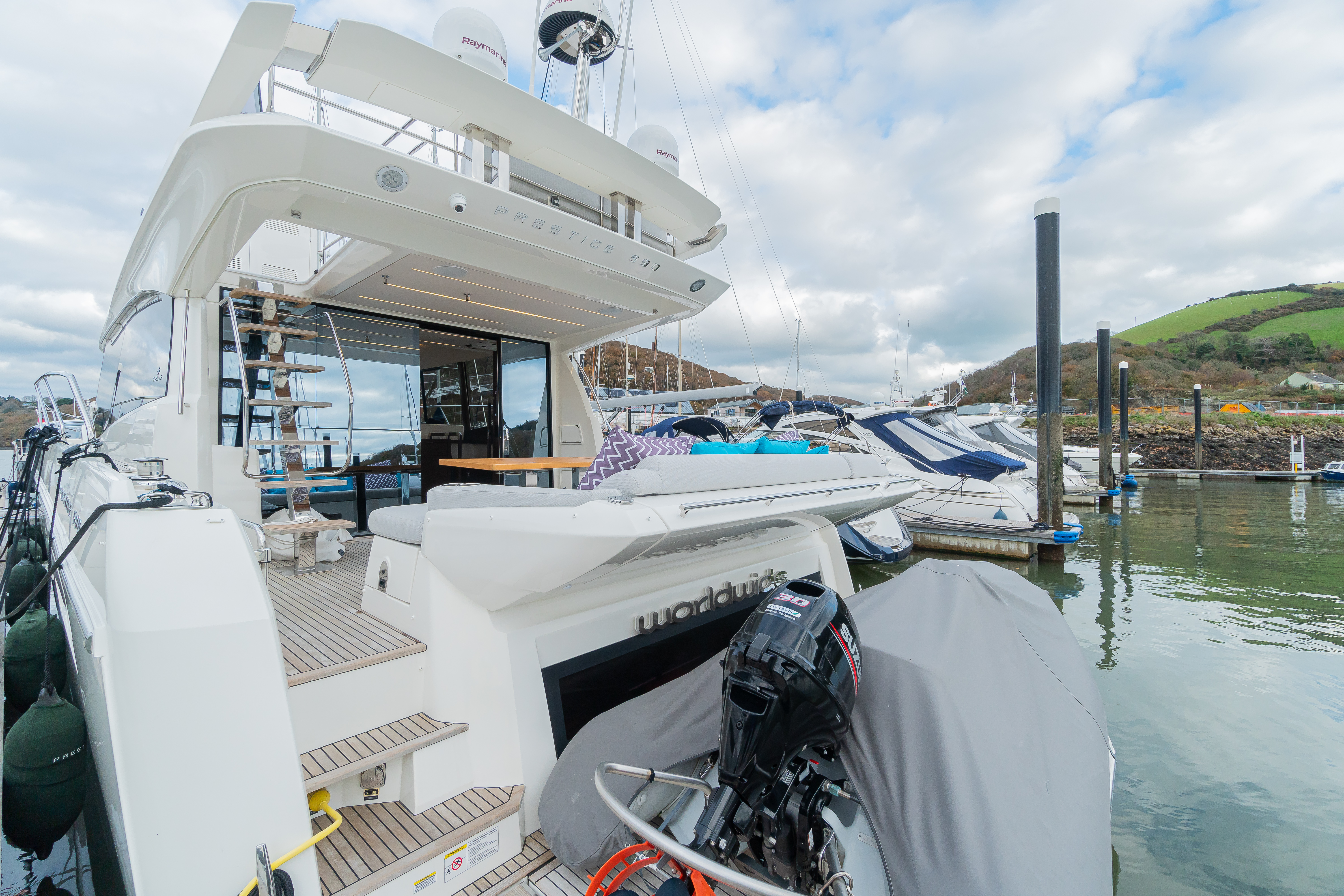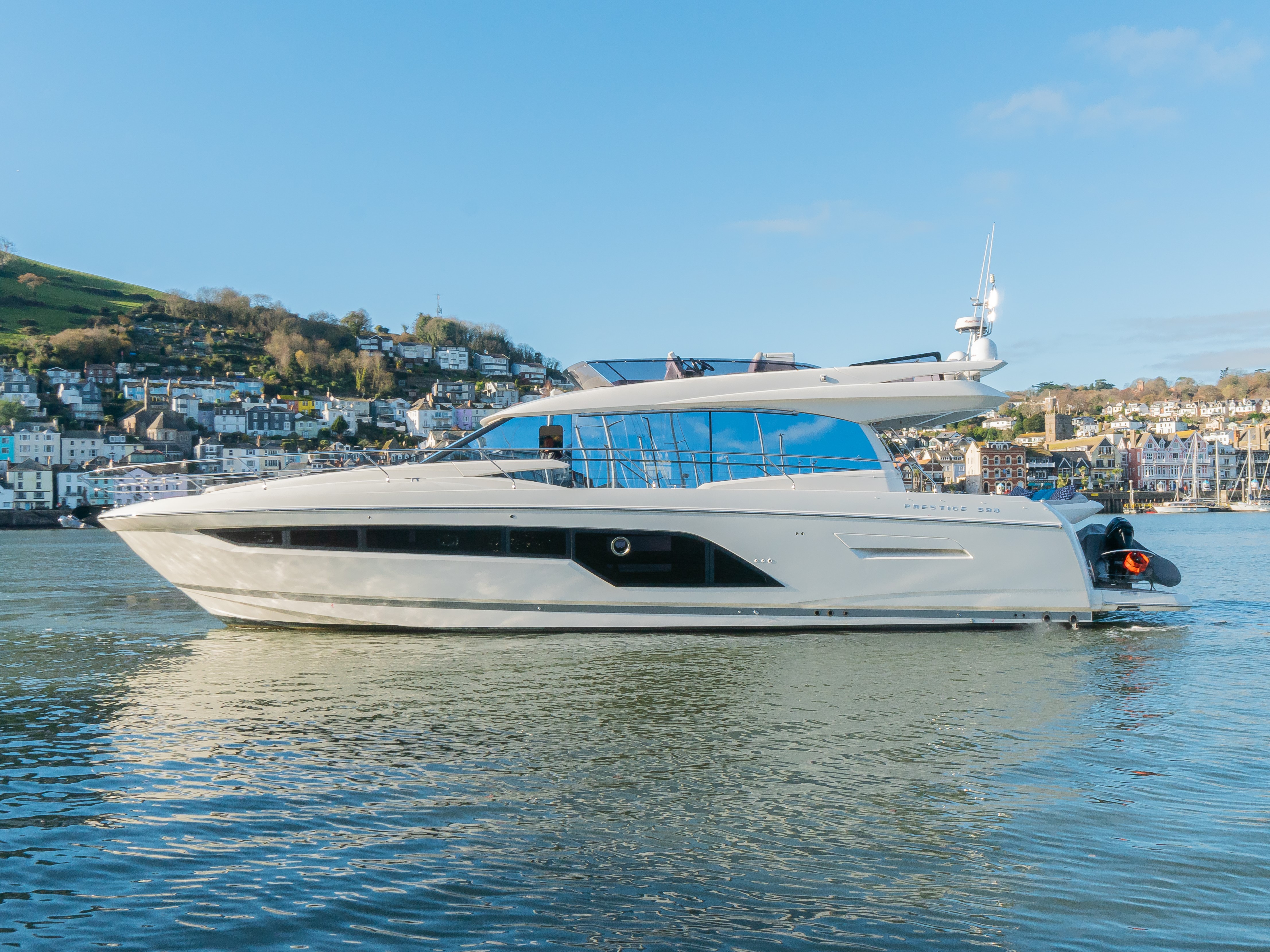 Powered by twin Cummins QSC 8.3 600hp diesel engines on Zeus pod drives. This option also includes joystick control which makes close-quarter handling a breeze, and with the addition of Skyhook dynamic positioning, the Prestige 590 can be easily be crewed shorthanded. Lying afloat at Noss Marina, Dartmouth and available to view by appointment.