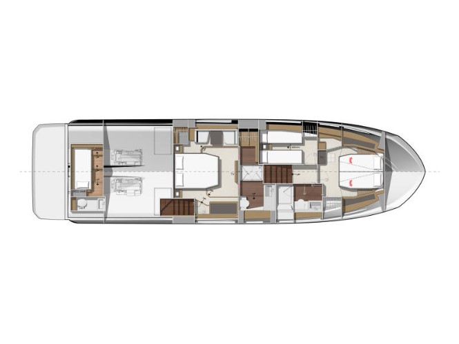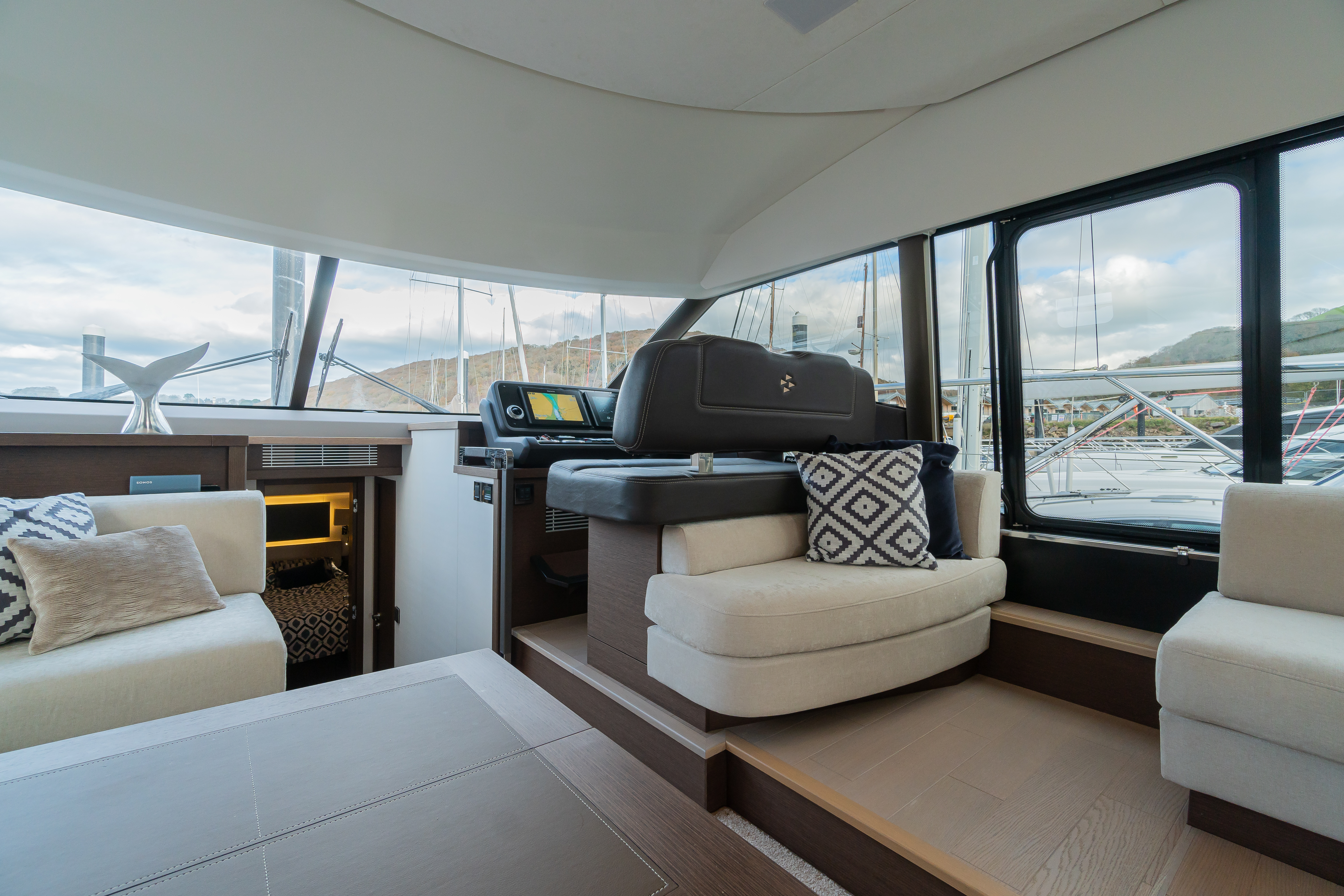 Light and spacious saloon with a deluxe electric table (upgrade), a large U-shaped seating area to port with helm position, settee and seat opposite offering fantastic views out, sliding side access door to starboard. Steps down to the forward cabins also house the washer-dryer. Blinds to all side windows. additional USB sockets