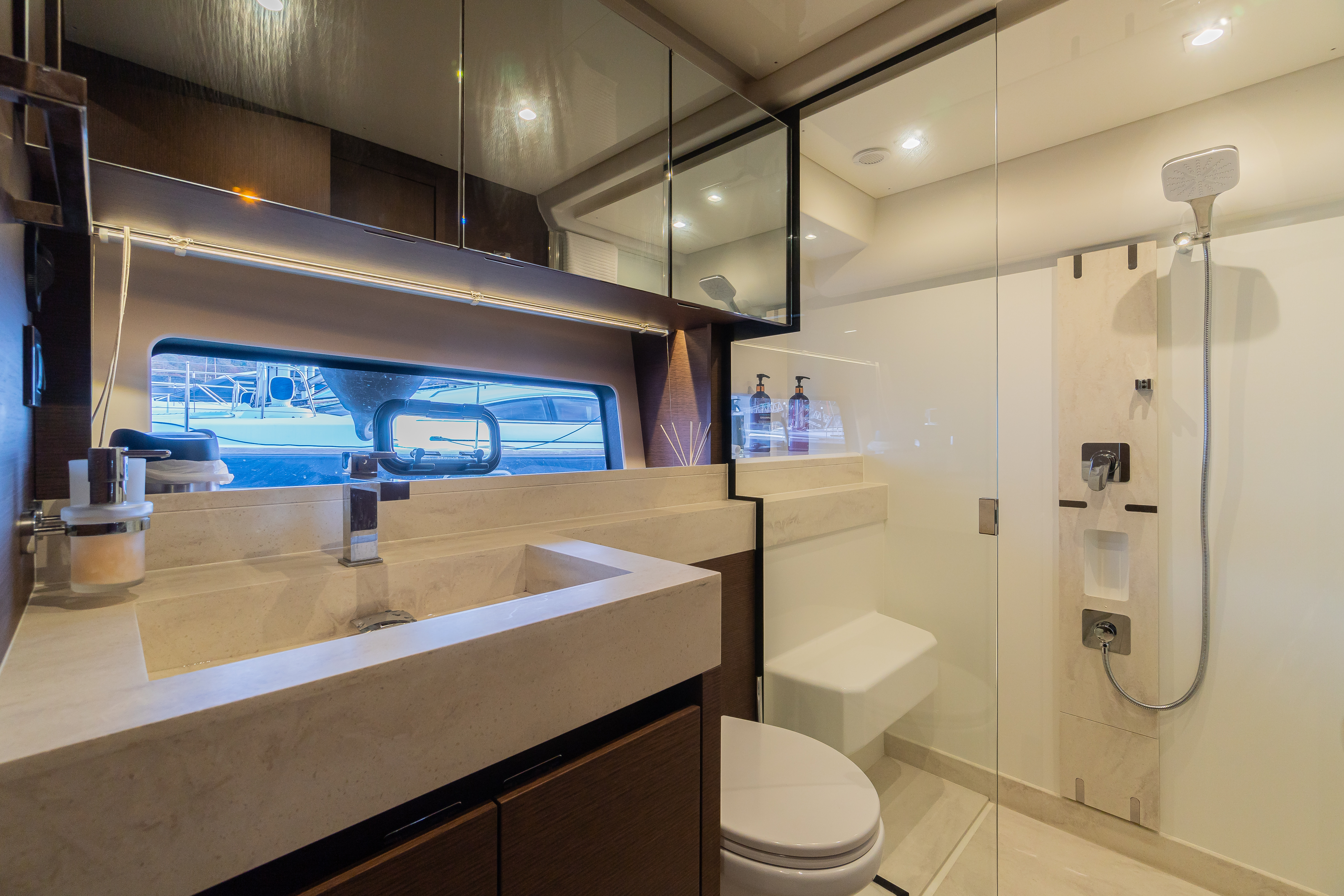En-suite heads compartment with walk-through shower with sliding door, electric freshwater flush toilet, storage unit, mirror and sink