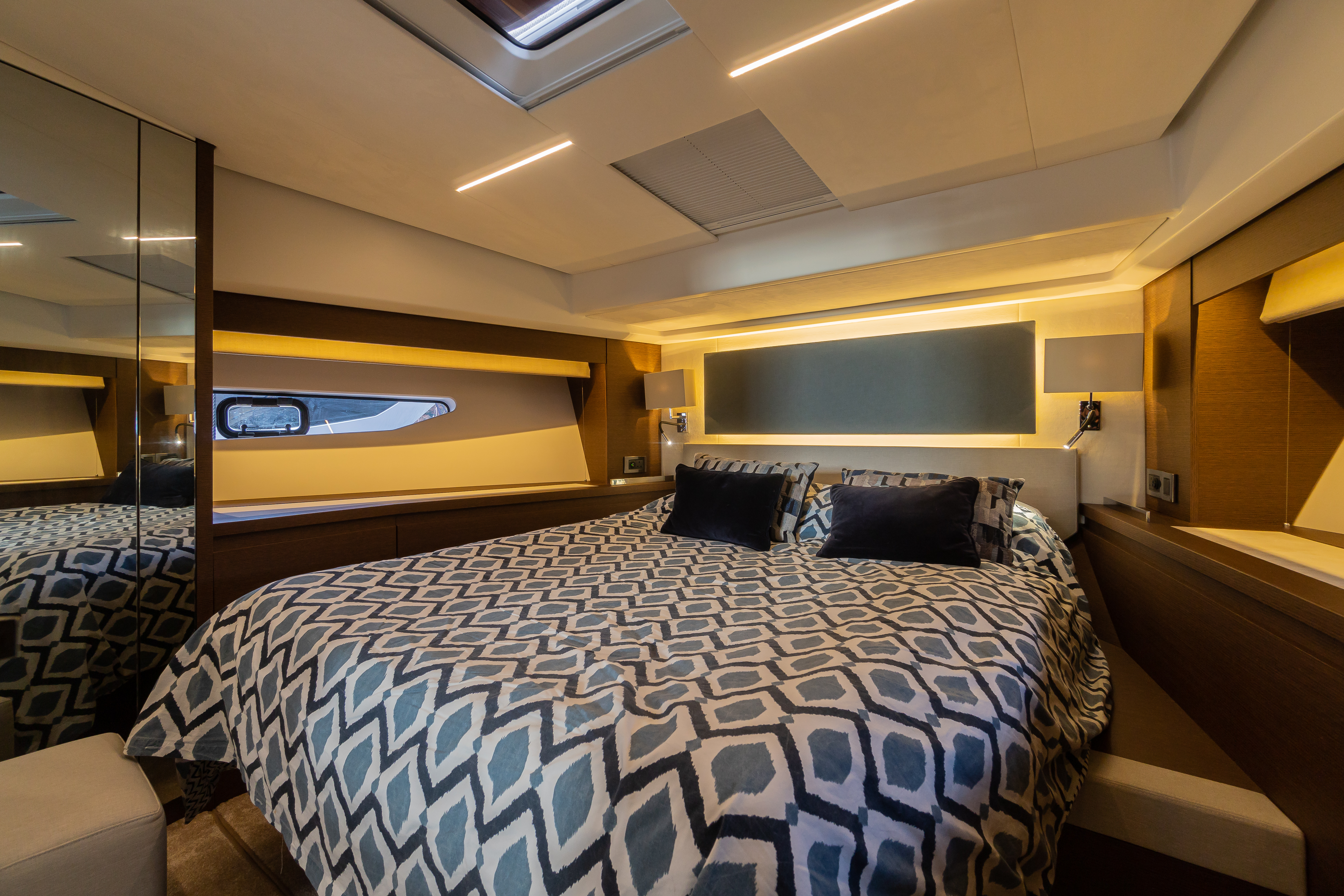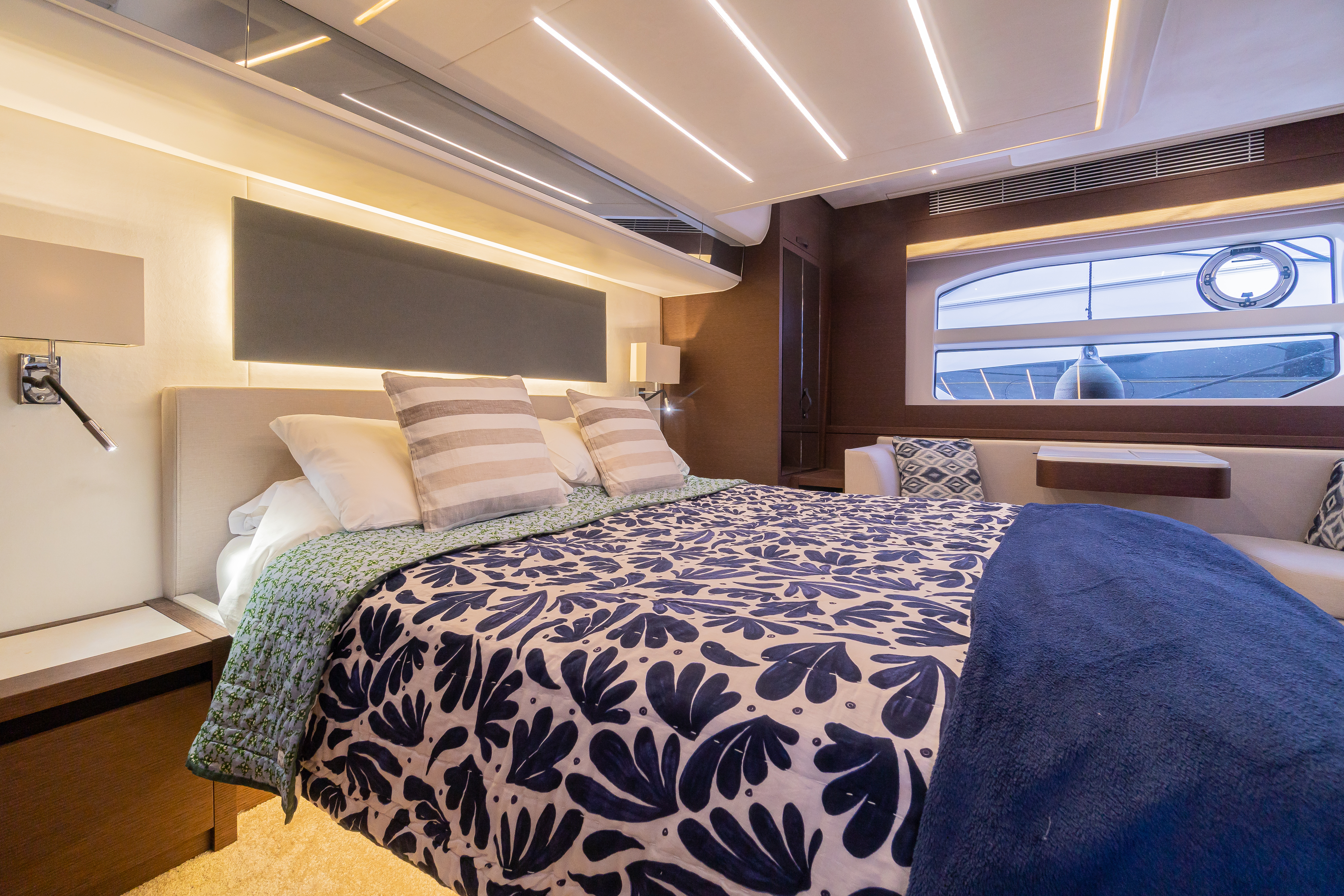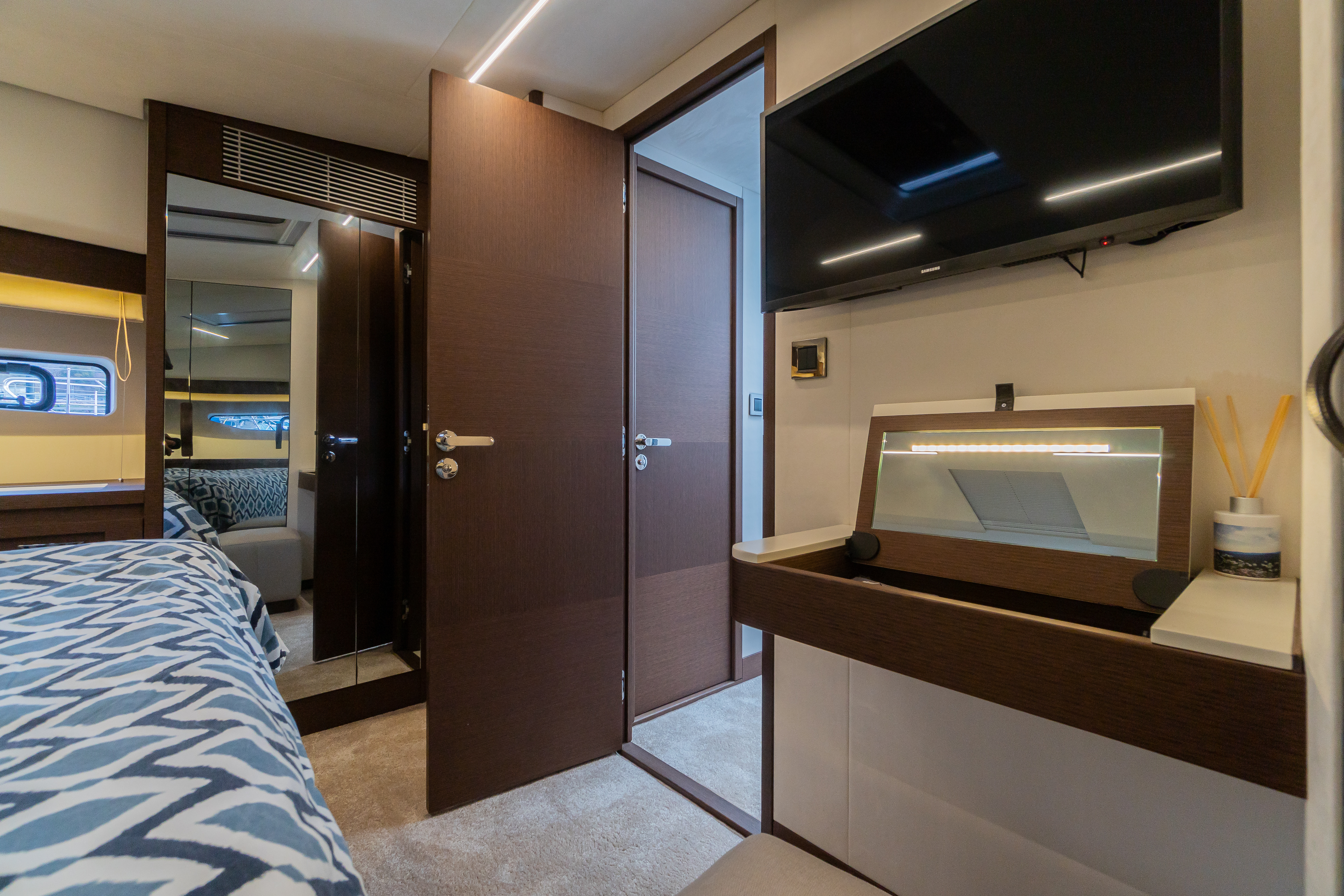 Separate access to a full-beam master stateroom amidships with double berth with sprung mattress, storage cupboards and drawers, desk/dressing table to port, separate access to walk-through wardrobe and TV.