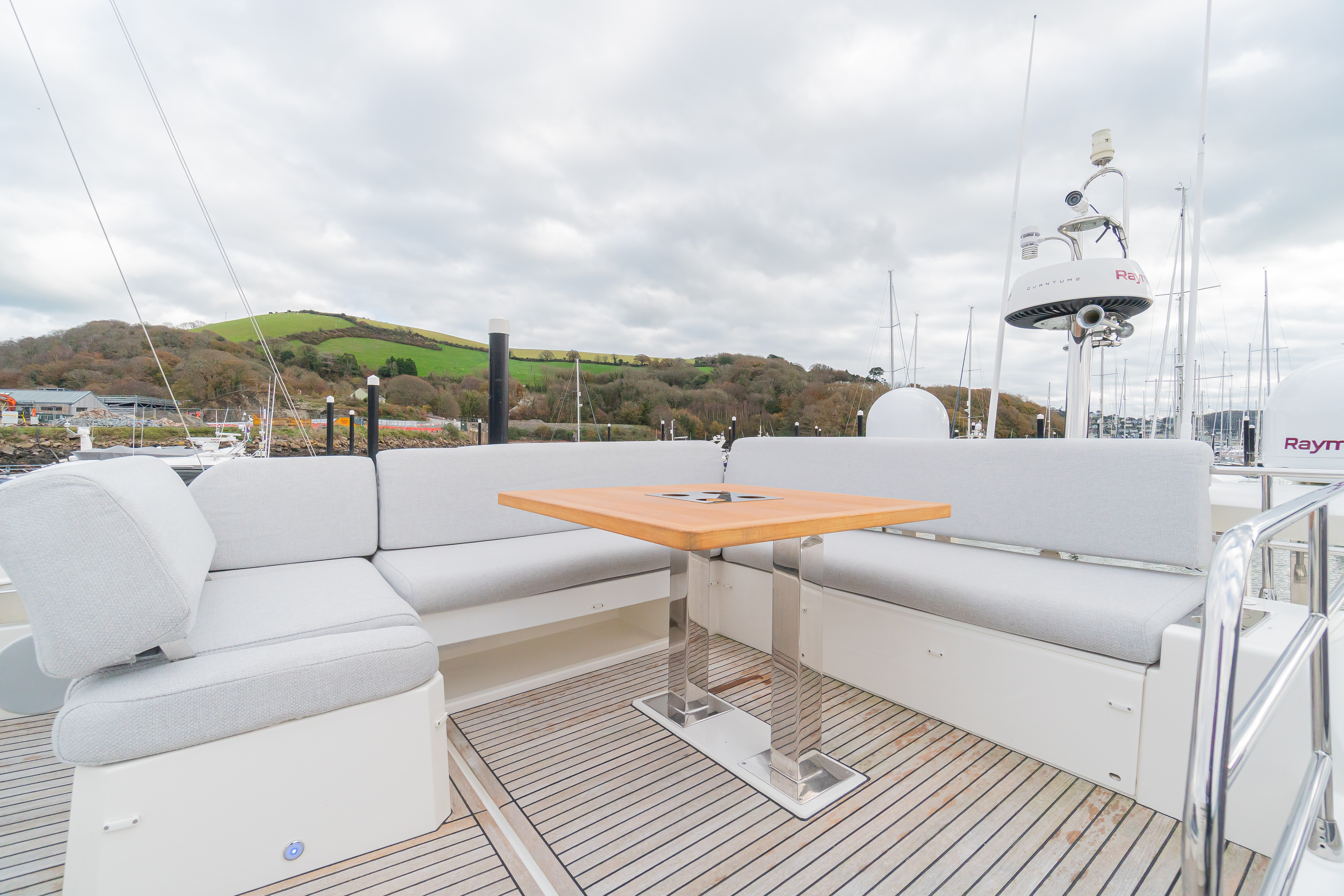 Large L-shaped seating with relaxed bench across aft section, teak table, sunshade with carbon fibre poles for relaxed bench, steps to flybridge and Isotherm icemaker