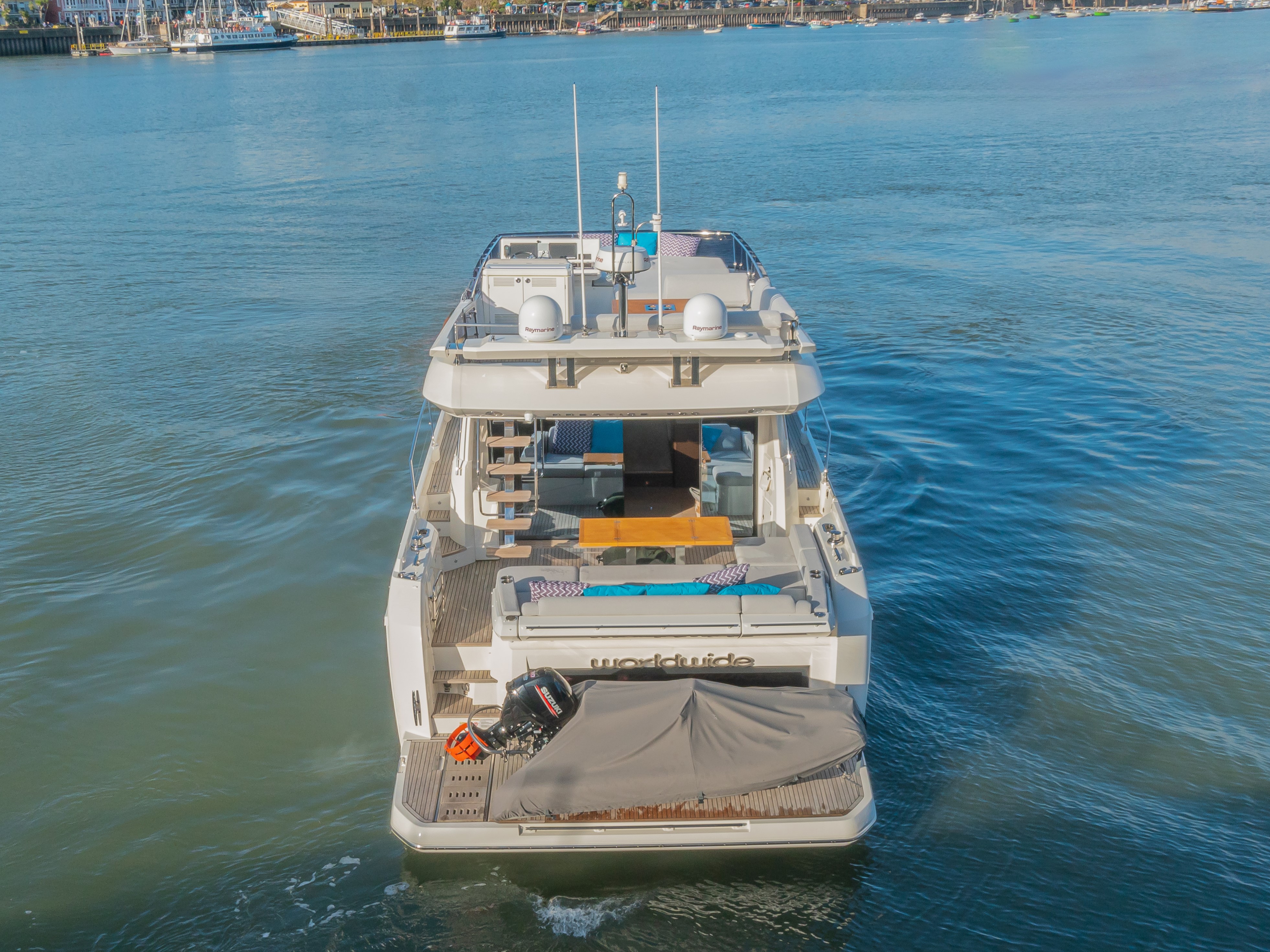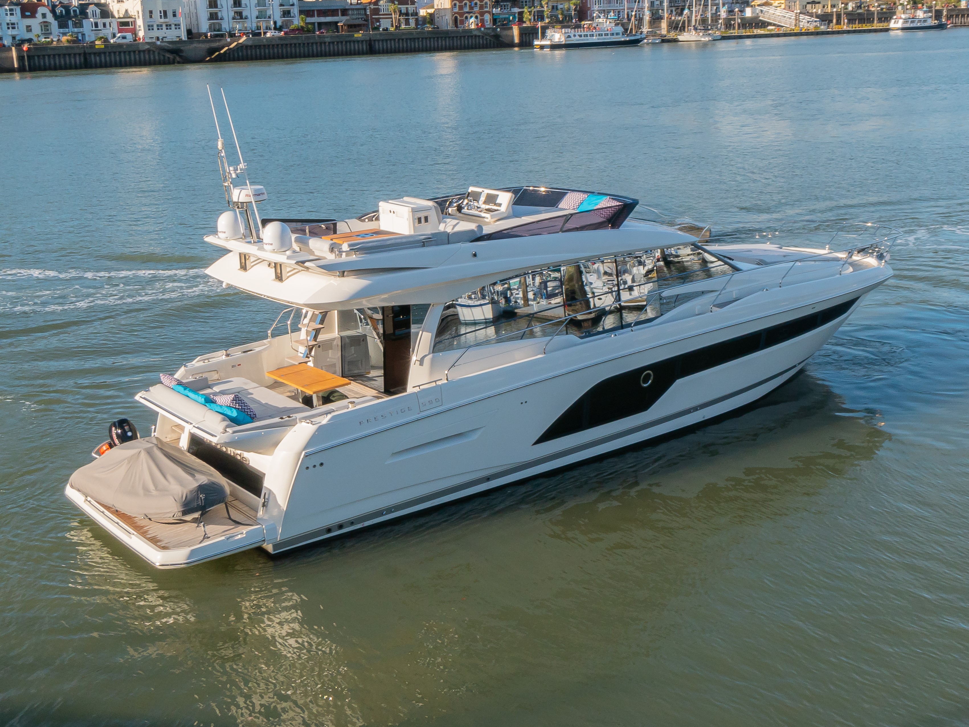 This 2020 model Prestige 590 'Worldwide' offers three double cabins plus one crew cabin. PART EXCHANGE AVAILABLE. She comes fully equipped with air conditioning, Seakeeper stabiliser, 17.5 Kva generator, upgraded upholstery inside and out and hi/lo hydraulic platform.