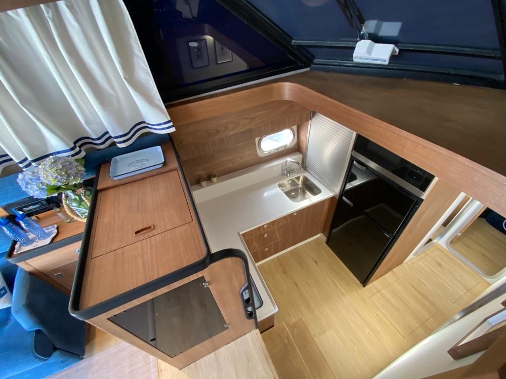 Galley in main saloon to port with direct access to cockpit through sliding window