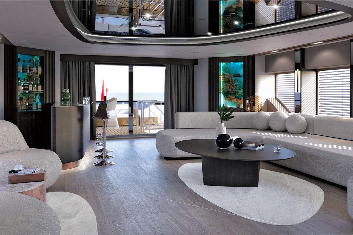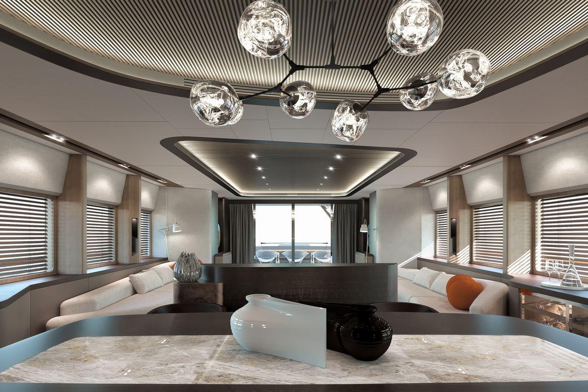 The main salon of the Kando 110 offers a comfortable lounge and dining area connected to the aft deck, where built-in seating and a large table provide an inviting space for outdoor dining. A day head is located forward to starboard, and the enclosed galley to port ensures practical service and crew circulation.