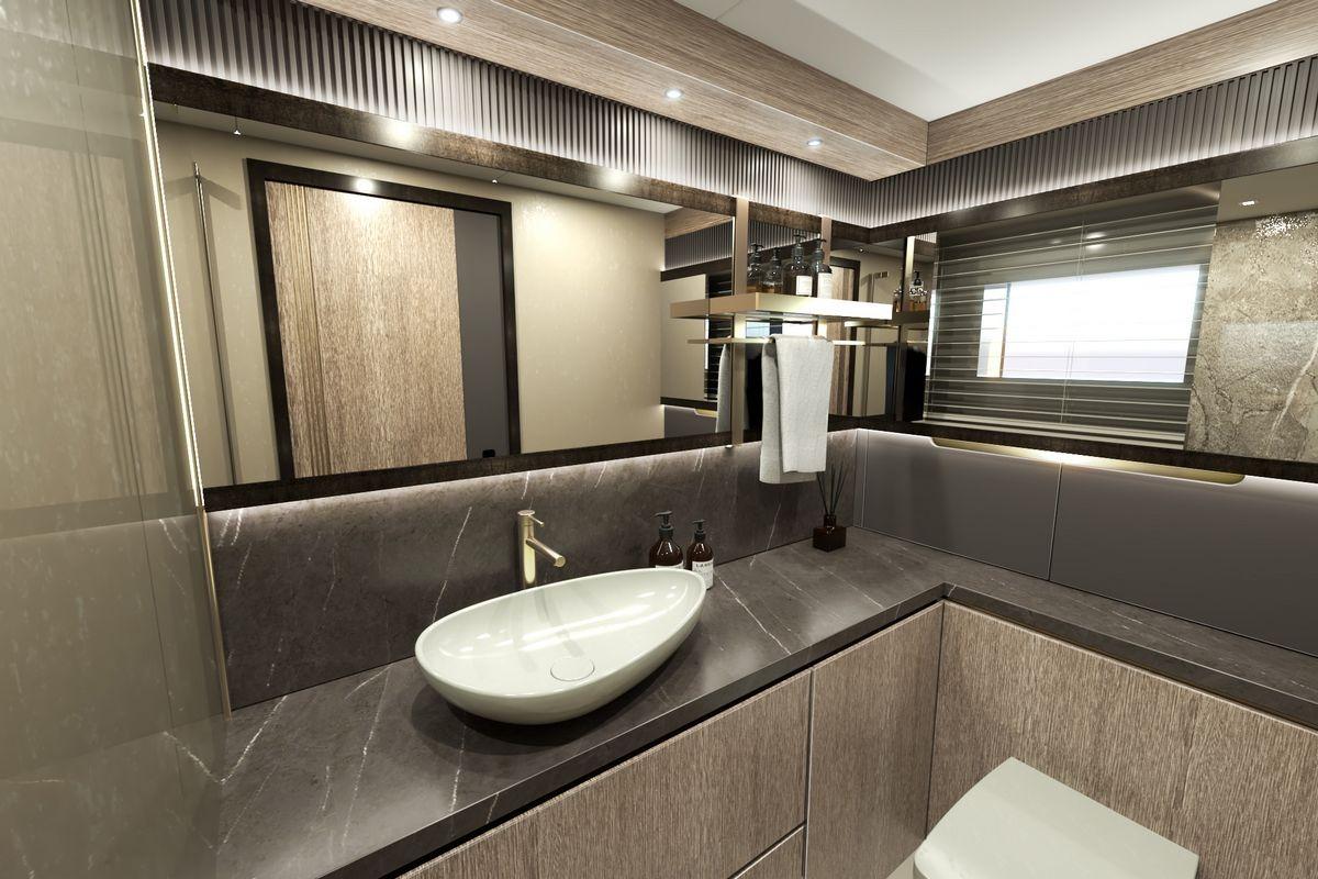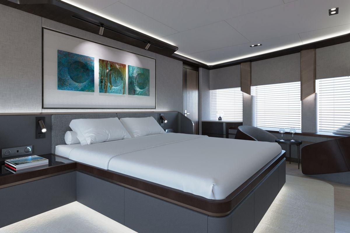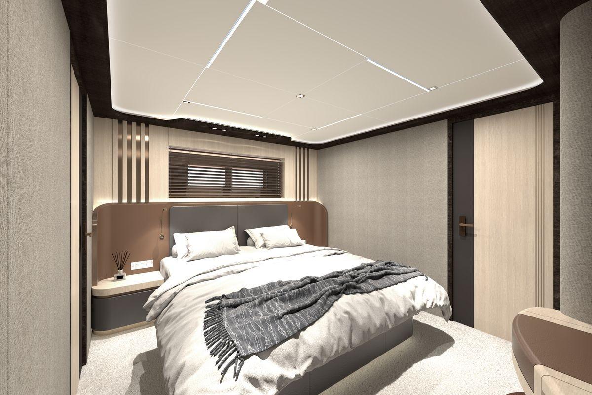 Her 299 GT allows for a six-stateroom configuration, including a full-beam master suite on the main deck forward. The suite features an owner’s office, a dressing area, and a spacious bathroom.