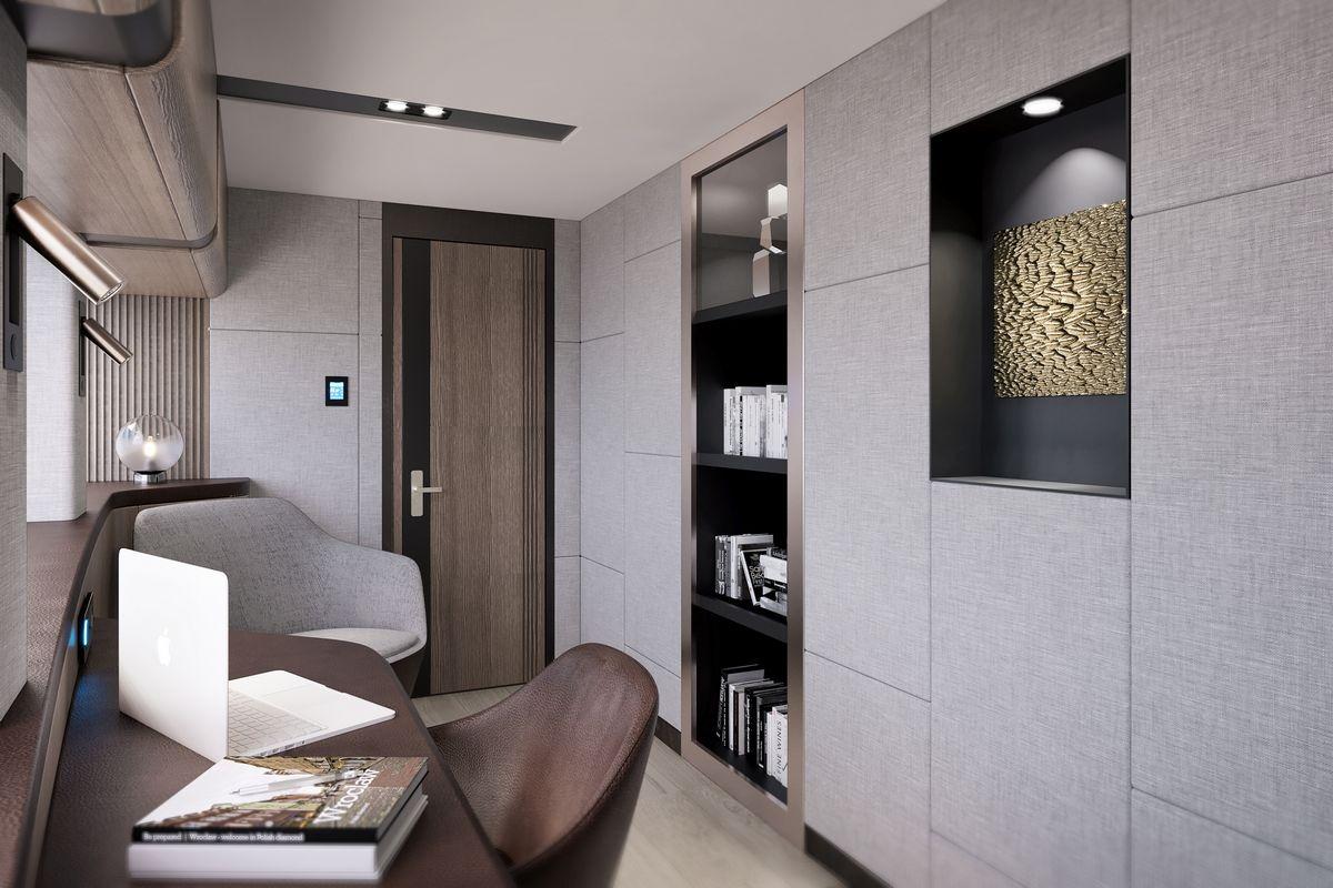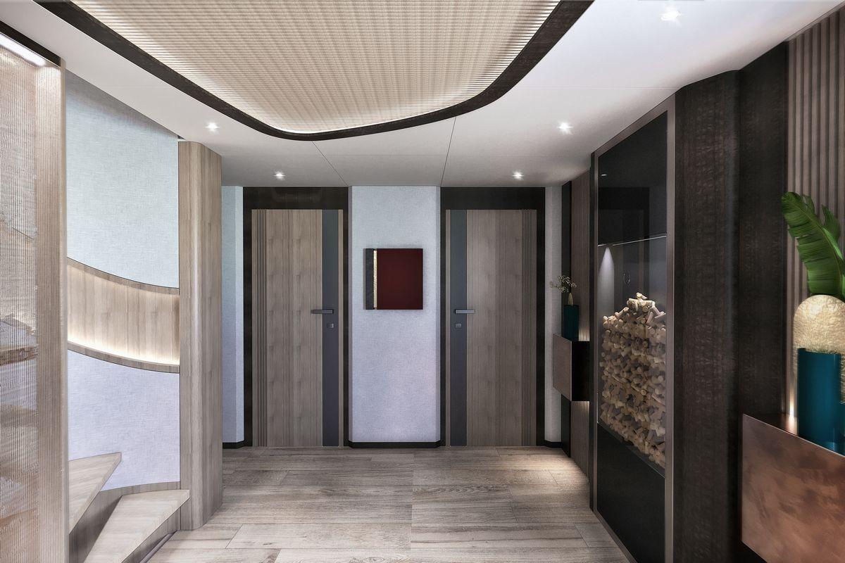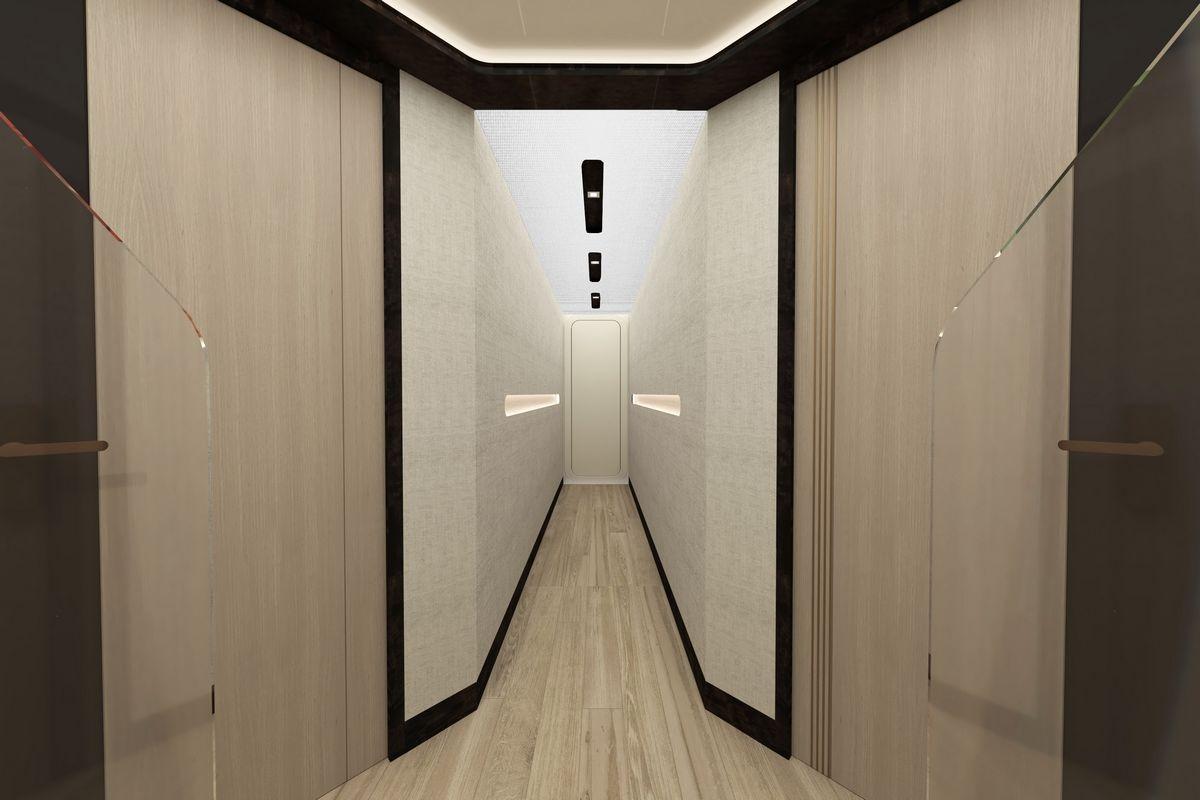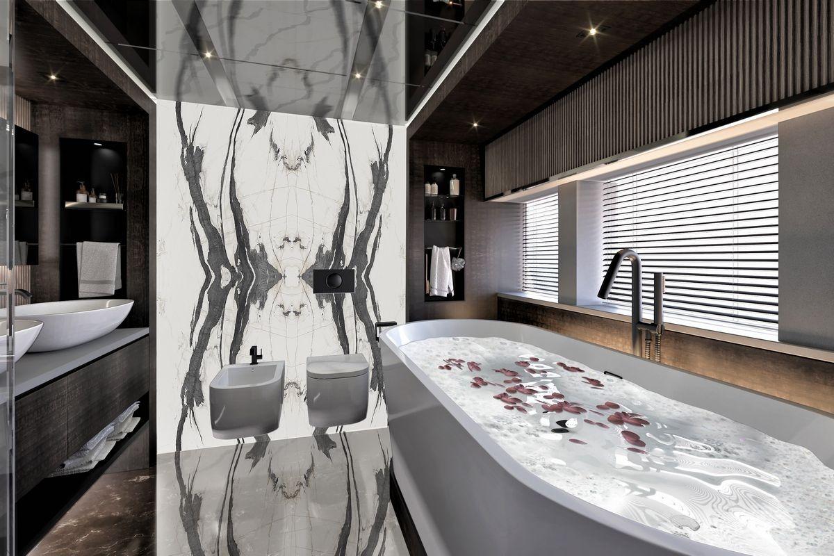 Her 299 GT allows for a six-stateroom configuration, including a full-beam master suite on the main deck forward. The suite features an owner’s office, a dressing area, and a spacious bathroom.