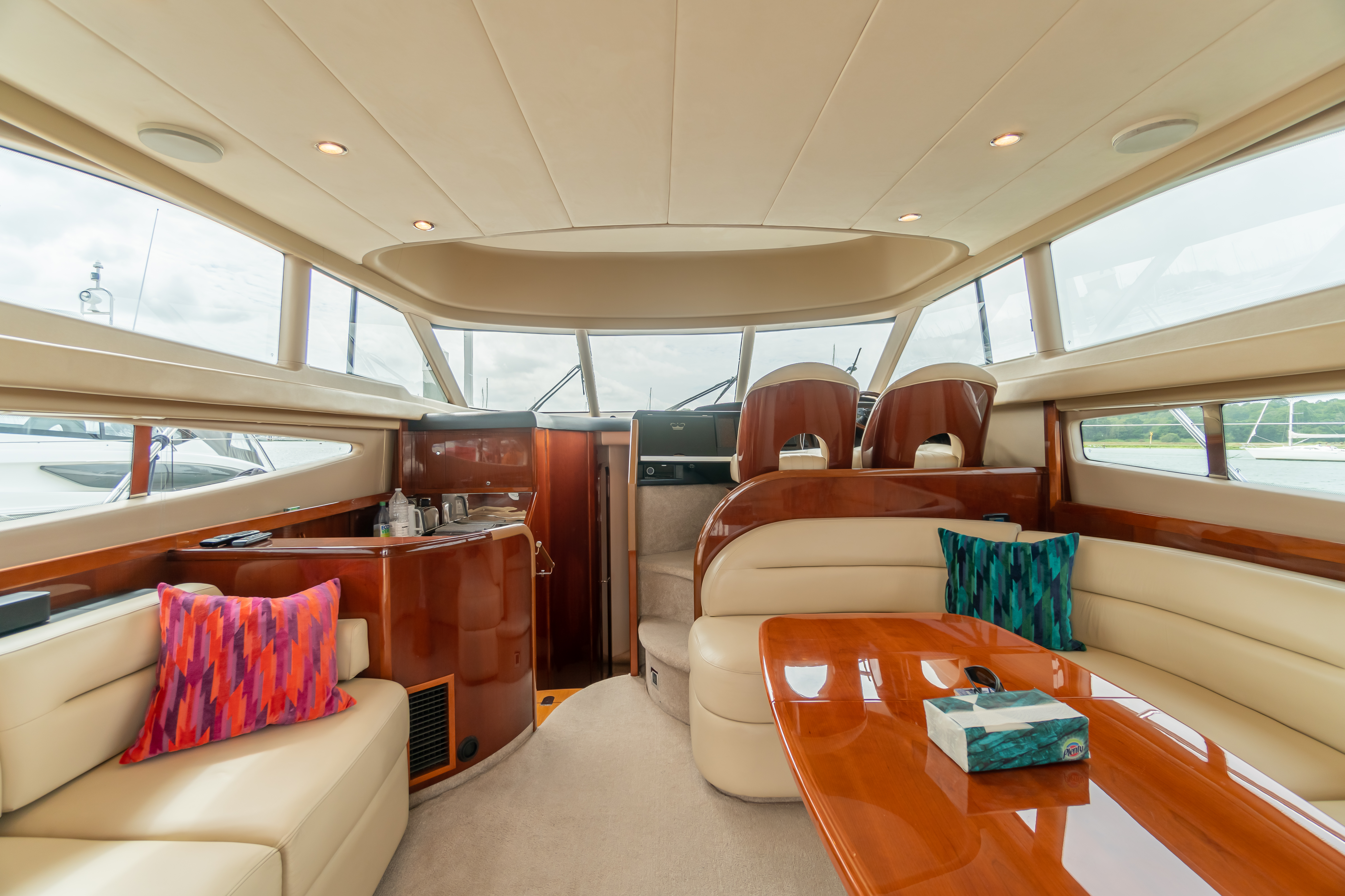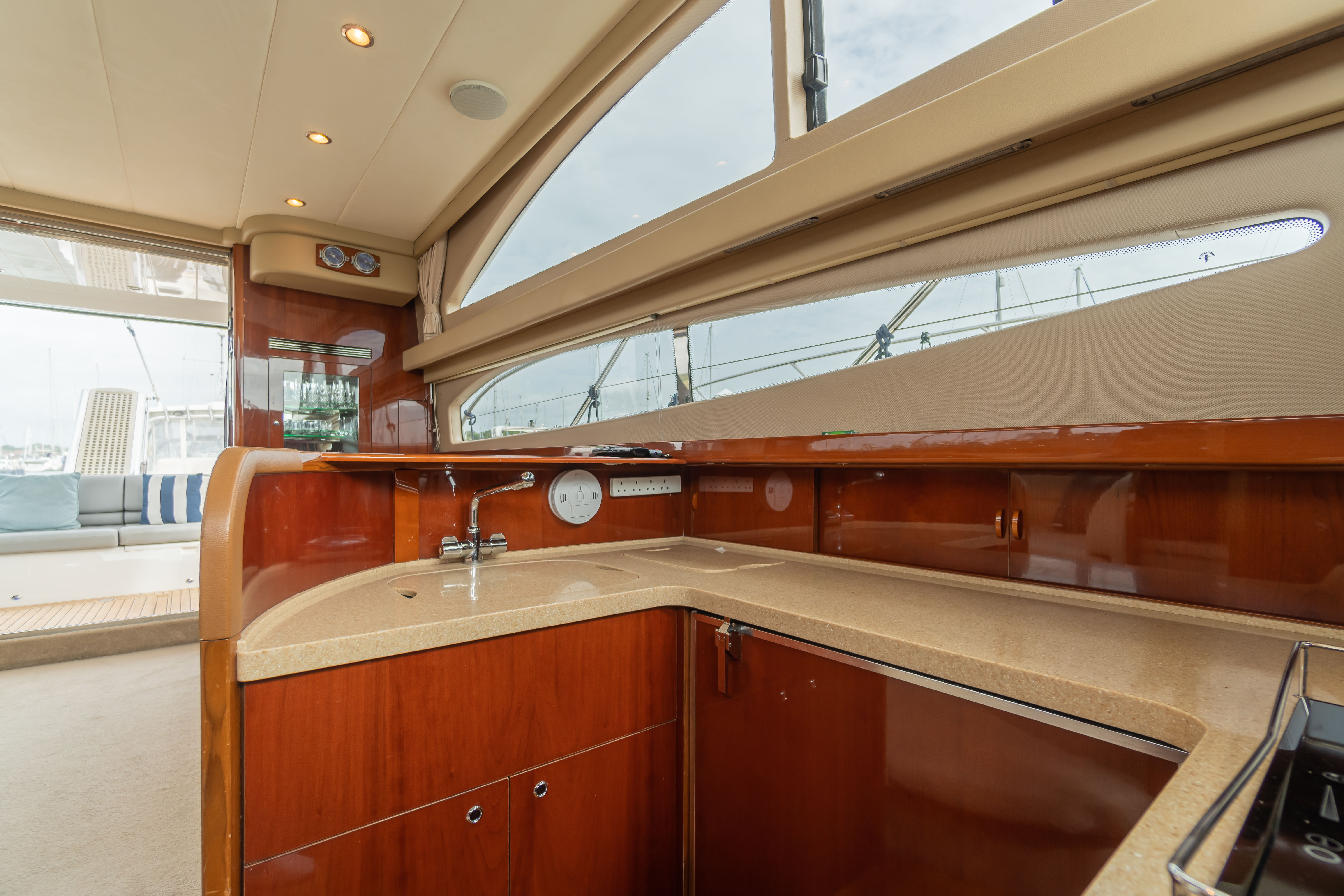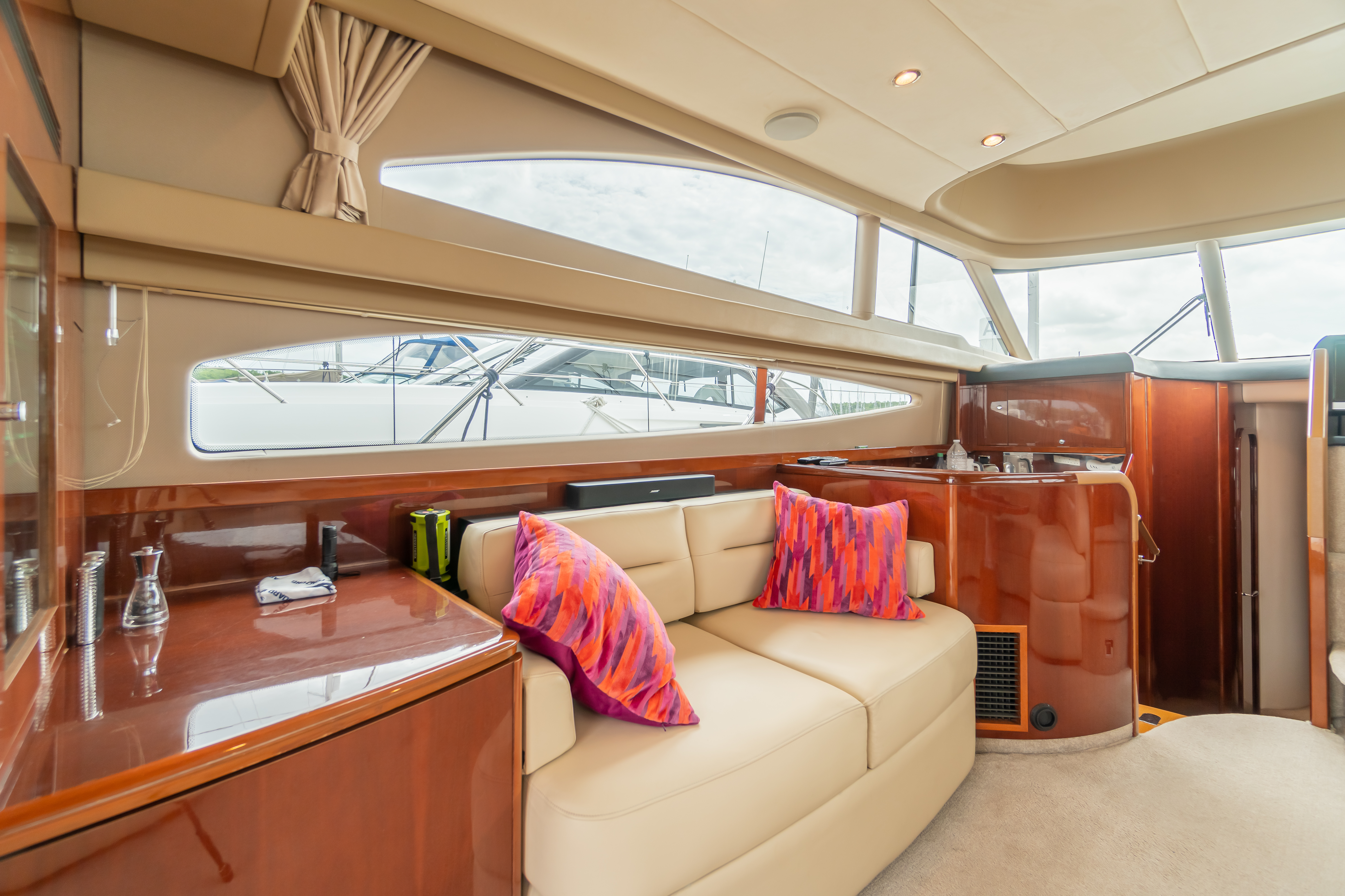 Additional settee seating, fridge and drink cabinet to port