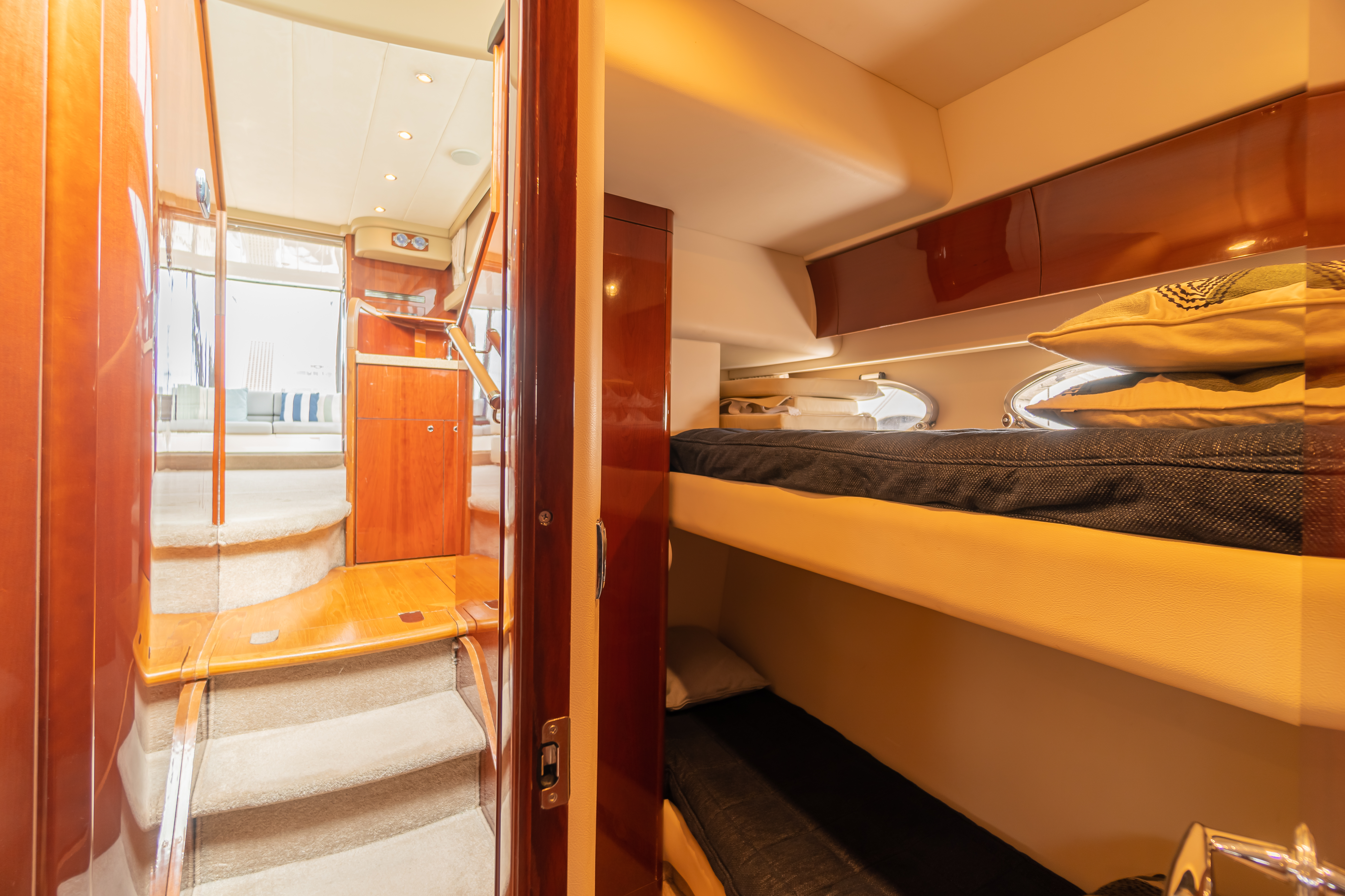 Guest cabin to port with twin bunks and storage