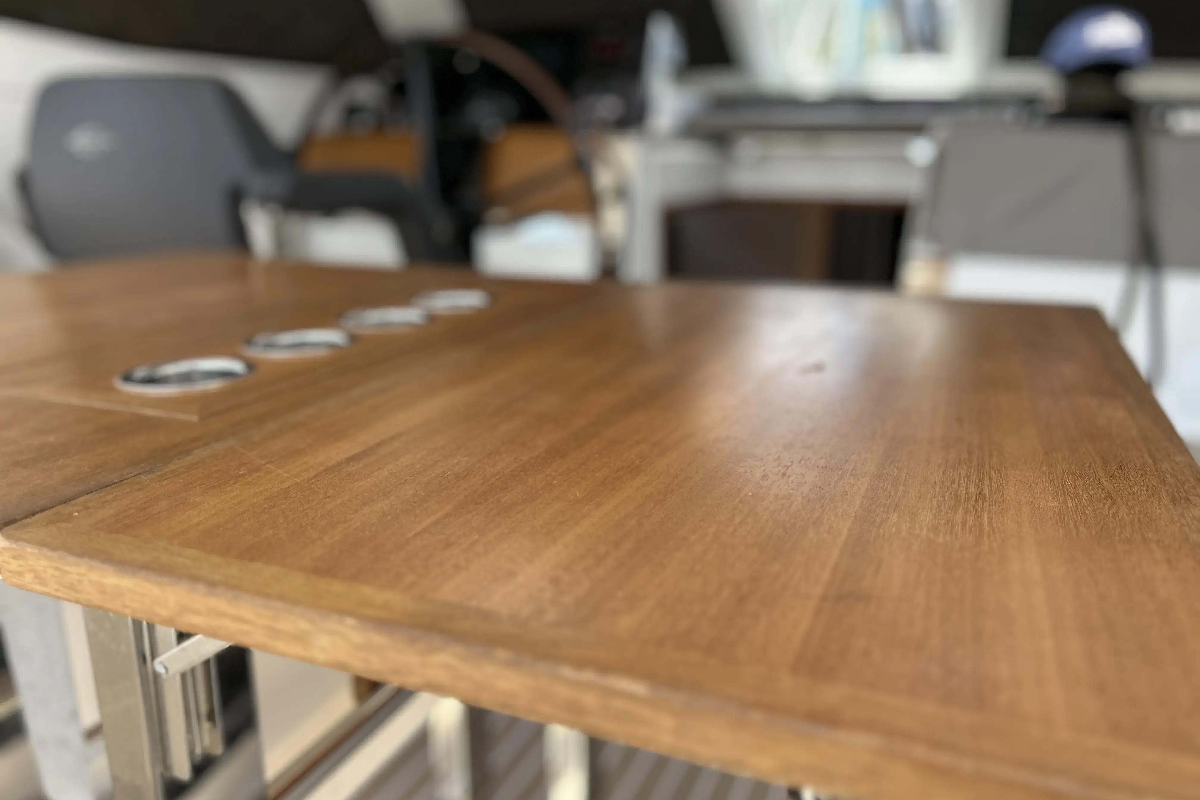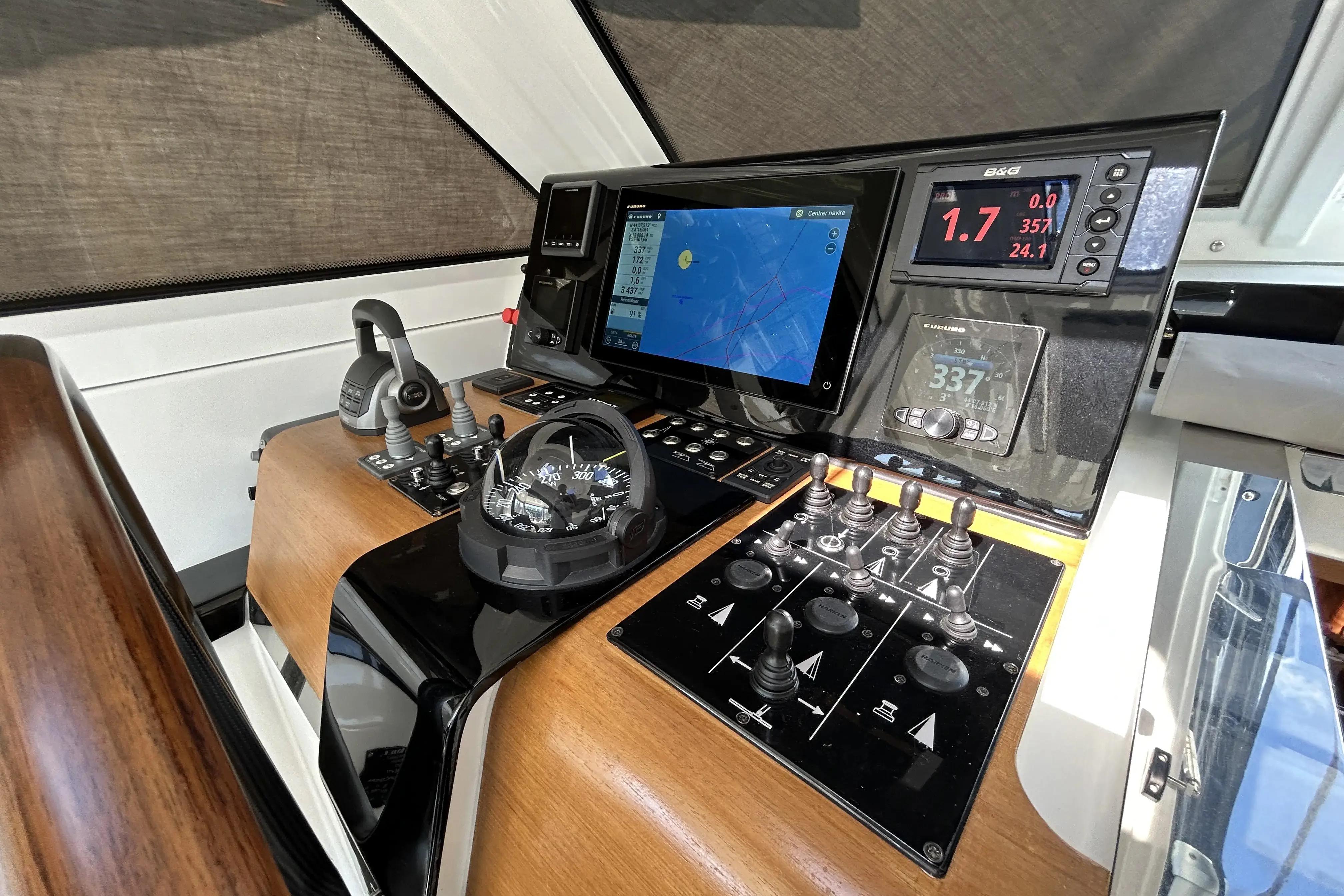 Pack électronique : radar-traceur Furuno Navnet TZT3 avec 2 écrans tactiles 16? (table à cartes et cockpit), 1 carte Wide Atlantique, AIS FA 70 et Hub 101 2 GFD couleur B&G Hydra 5000 supplémentaires dans le cockpit Téléphone satellite Iridium GO, installé et branché 2e pilote autonome complet, Furuno Navipilot, monté et branché Pepwave Monde : système Wi-Fi / 3G / 4G, récepteur et amplificateur 2e combiné VHF Garmin dans le cockpit avec loudhailer 1 caméra en tête de mât orientée vers l’arrière, angle 40°, avec image sur traceur Starlink, système installé GPS Furuno GP330 Centrale de navigation B&G H5000 Triton Edge avec écran GFD à la table à cartes, écran GFD et écran analogique dans le cockpit VHF Icom à la table à cartes Pilote automatique hydraulique Furuno Navpilot 711C Cockpit vaste et confortable, profond et sécurisant avec marche d’accès Abri de pilotage rigide en composite, offrant une vie à bord et une navigation extrêmement protégée, en toute sécurité par tous types de temps Pare-brise frontal et latéraux en verre, partie centrale ouvrante ainsi que 2 panneaux sur le toit de l’abri L’ensemble offre une excellente vue panoramique ainsi qu’une parfaite ventilation Toit ouvrant rigide (panneau coulissant) Poste de pilotage à bâbord avec barre à roue Console au niveau du poste de barre pour l’électronique ainsi que toutes les commandes électriques (moteur, guindeau, enrouleurs…) Siège de barre avec sellerie sur assise et dossier Table de cockpit modulable en doussié, avec glacière Coffre pour rangements divers Éclairage LED sous l’abri avec variateur Système d’assistance sur la porte de descente