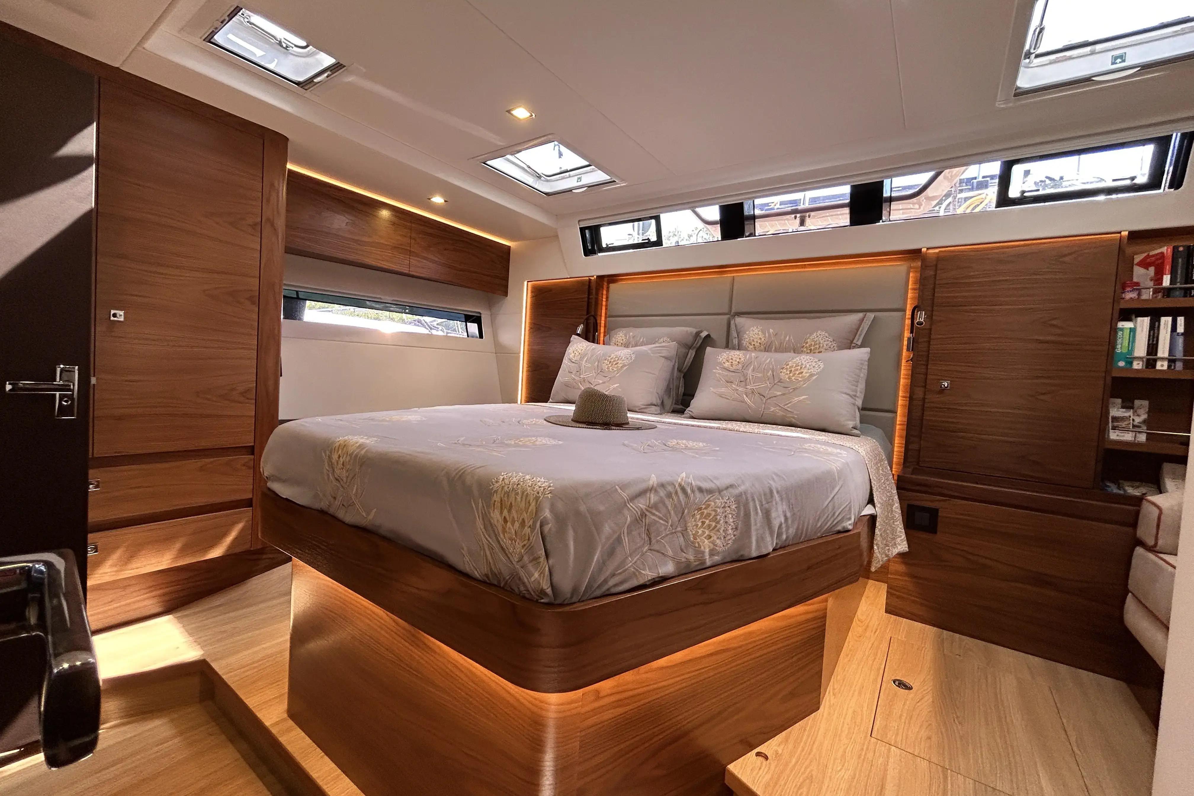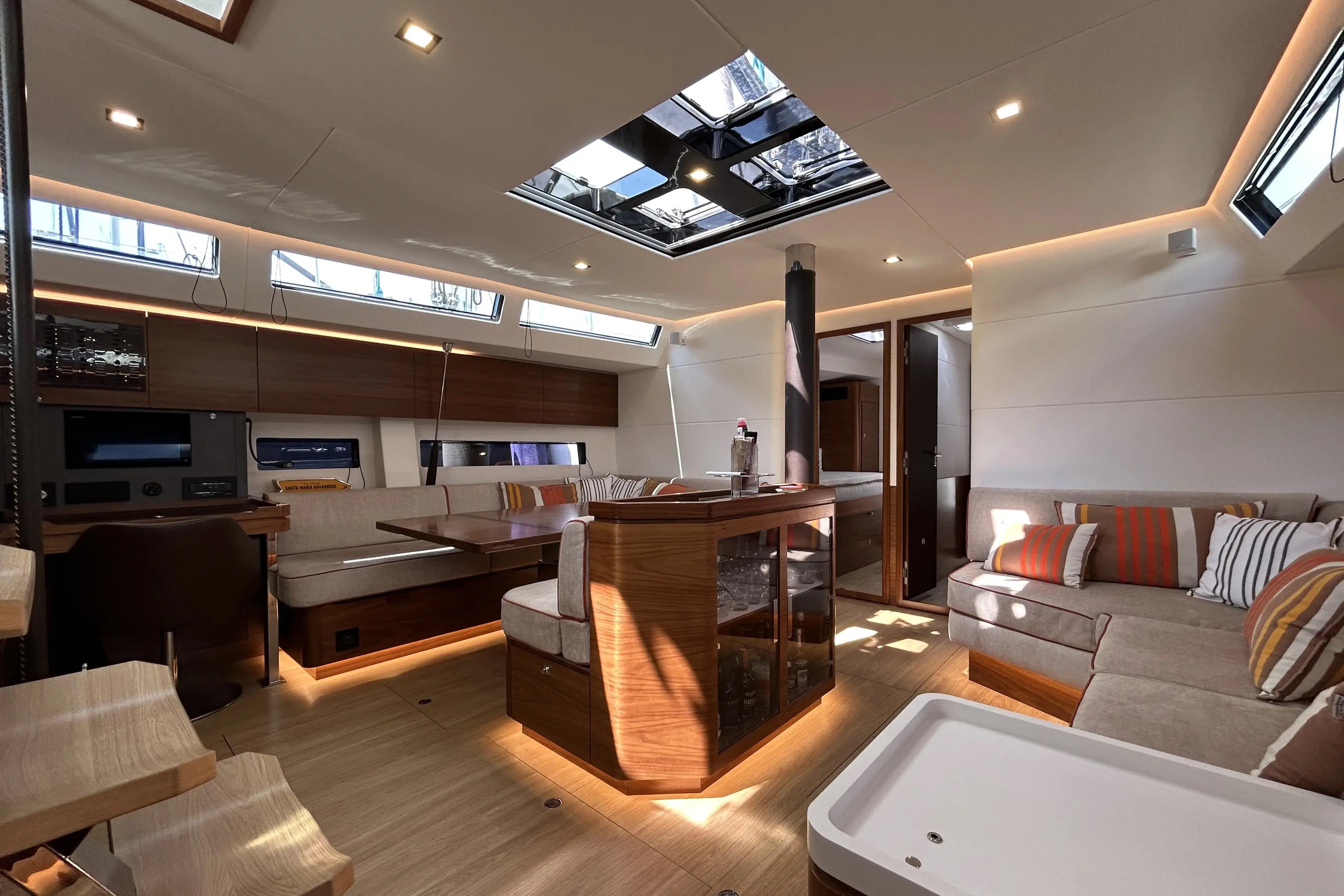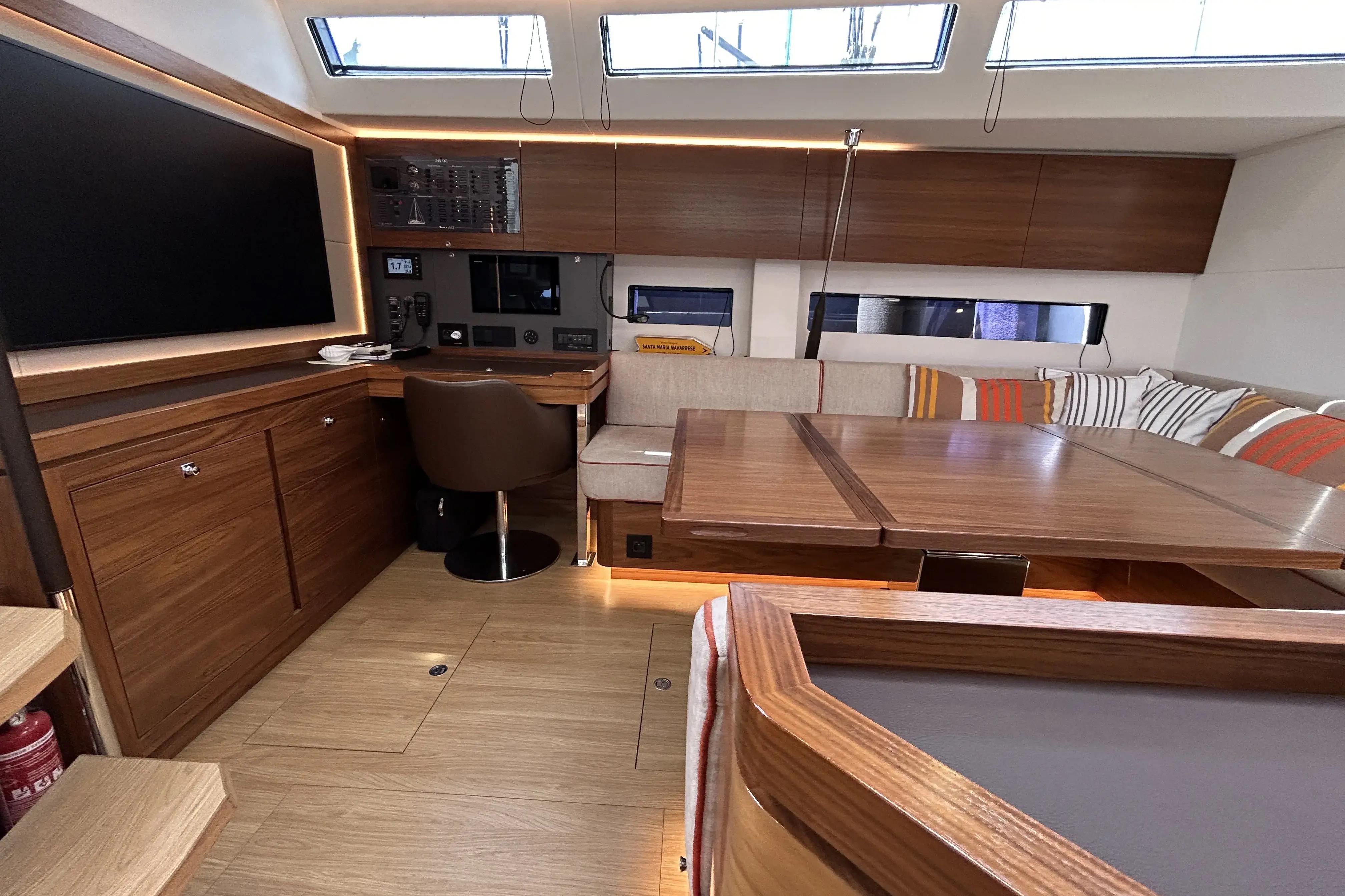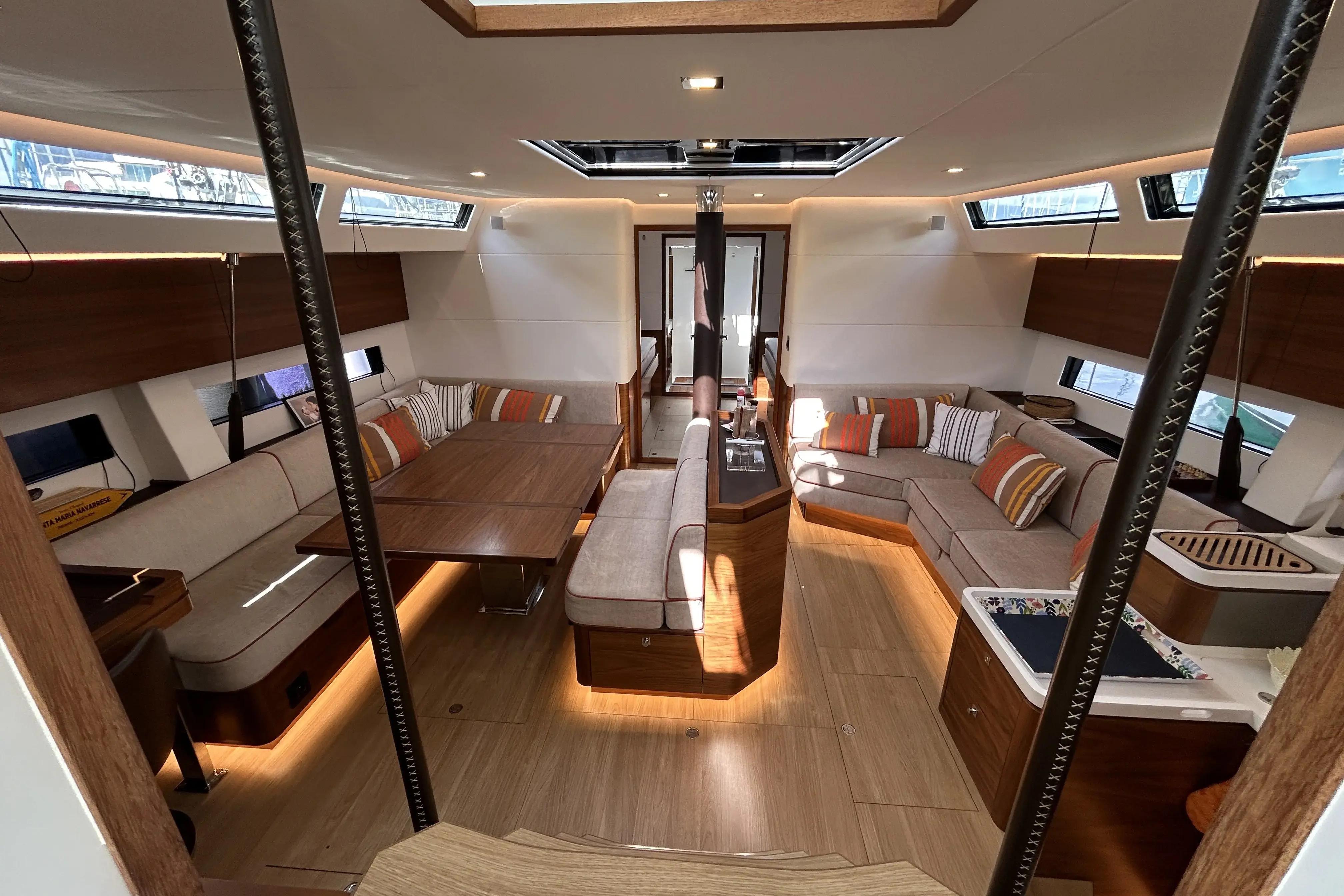Intérieur : noyer d’Amérique, finition mate Ensemble de climatisation/chauffage 230 V dans tout le bateau (Dometic, 48 000 BTU) Surmatelas Éclairage d’ambiance intérieur LED (plafonds et plinthes) Sellerie intérieure MACAN 02 (beige clair) avec passepoil MACAN 12 orange Écran TV 43? dans la cabine arrière Dessalinisateur Dessalator 230 V – 240 l/h, avec commande déportée dans la cuisine avec 19 heures Congélateur sous la banquette du carré Cave à vin 12 bouteilles Antenne TV en tête de mât Coussins de cockpit en Silvertex Skyline LINETEX LNT-3460 Bamboo Table du carré avec pied télescopique électrique et matelas supplémentaire