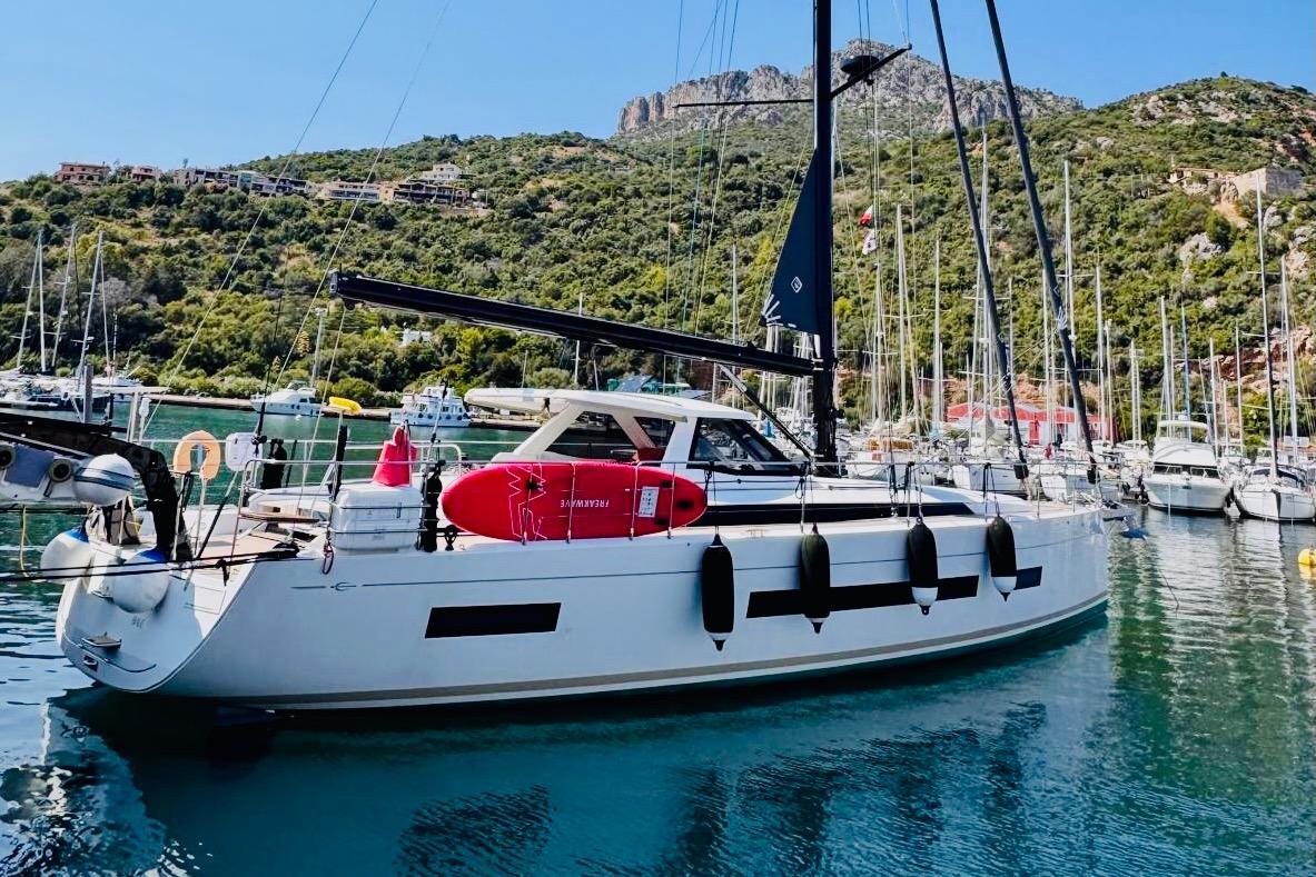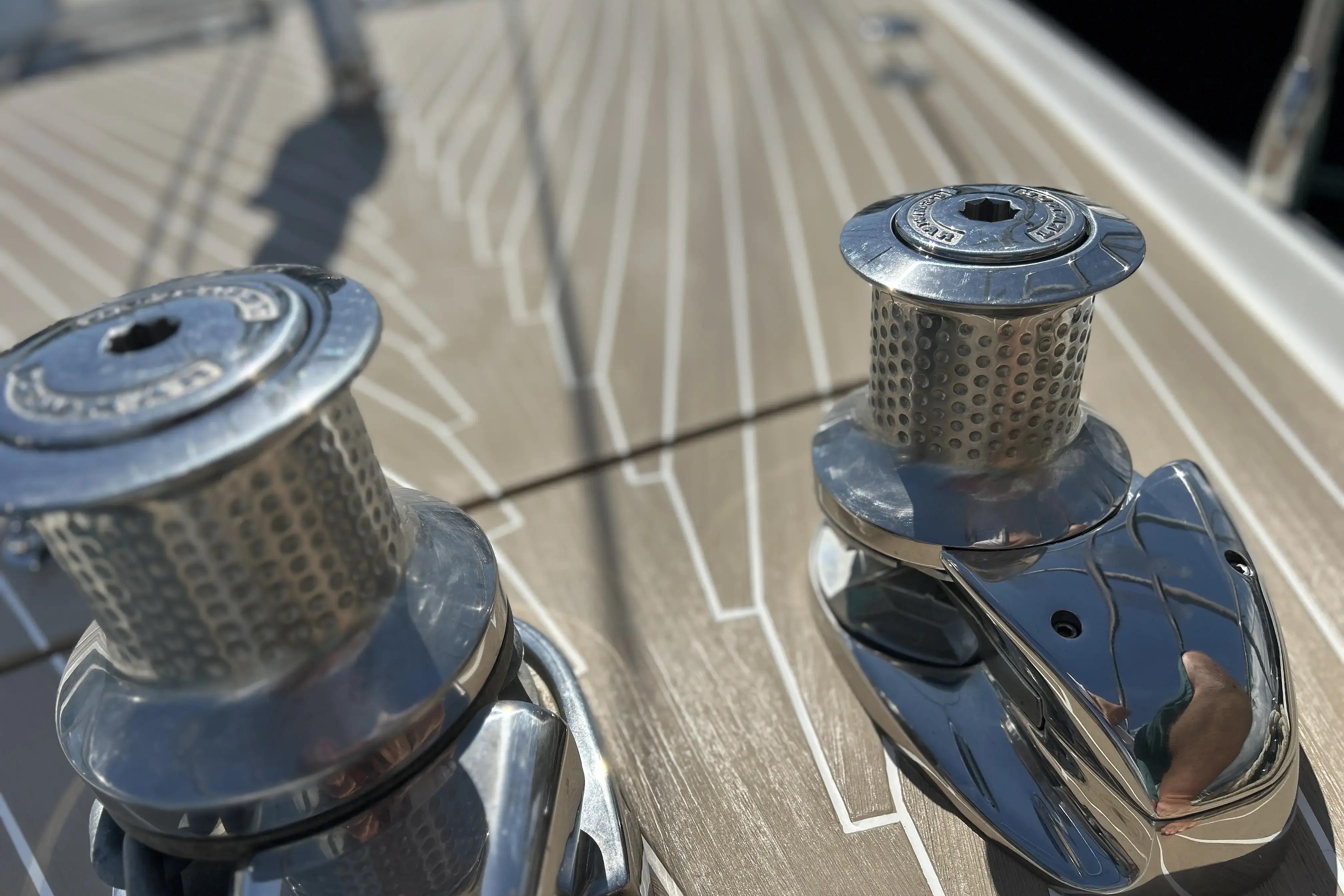 Supplément pour bôme en carbone Balcons rigides avant, arrière et latéraux en inox (ouvertures à l’arrière et sur les côtés pour un accès facile au quai). Filières en câble inox. Sièges en doussié dans les balcons avant et arrière. Lignes de vie installées, avec cadènes inox articulées pour fixation sur le pont, et 2 cadènes articulées dans le cockpit. Feux de navigation LED 8 taquets d’amarrage en acier inoxydable Support de radeau de survie dans le balcon Cadènes inox pour reprise de gréement Rails d’écoute avec chariots avale-tout Commandes de réglage et d’écoutes (manuelles et électriques) ramenées au cockpit, ainsi que les systèmes d’enroulement et de déroulement des voiles Réglage du chariot d’écoute de grand-voile électrique 2 winches électriques d’écoutes de génois (Harken Performa anodisé noir) 2 winches manuels pour chariots d’écoutes de génois (Harken Performa anodisé noir) 1 winch électrique d’écoute de grand-voile (Harken Performa anodisé noir) 2 winches manuels sur le mât (Harken Performa anodisé noir), 2 étaqueurs de drisse sur le mât 2 bloqueurs de drisse 12 panneaux de pont ouvrants, 3 hublots ouvrants Sur le pont se trouvent 5 coffres : À l’avant, une grande soute à voiles (séparée par une cloison d’abordage) avec accès facile au coffre à mouillage, au compartiment du propulseur d’étrave et à un grand volume de rangement pour défenses, amarres et voiles supplémentaires. Éclairage temporisé. Finition intérieure en gelcoat clair. Verrouillage depuis l’intérieur du bateau. À l’arrière du pont : un vaste coffre pour ranger l’annexe, l’équipement de plongée, les défenses, etc. Prise 230 V, éclairage temporisé. Finition intérieure en gelcoat clair. Disjoncteur 230 V de prise de quai, câble d’alimentation 230 V quai, isolateur galvanique. Accès au système de barre et au pilote. Ouverture du capot sur vérins à gaz. Alarme d’envahissement. Compartiment du propulseur de poupe (option). Coffre sur passavant bâbord avec nables gasoil et eau. Verrouillage depuis l’intérieur du bateau. 2 coffres longs sur le roof arrière. Grande surface de bain de soleil sur le roof arrière. Le tableau arrière se transforme en plateforme de bain, articulée par un système hydraulique télécommandé. Échelle de bain à poste avec rangement dédié sur l’arrière de la plateforme. Douchette avec mitigeur. Rangements dans les marches du tableau. 2 taquets rabattables. Échelle de secours dans la jupe. Passerelle en carbone. Mât carbone à enrouleur électrique. Bôme en aluminium avec réglage de point d’écoute hydraulique. Finition mât et bôme en laque polyuréthane bi-composants. 3 étages de barres de flèches Hale-bas de bôme rigide réglable Projecteurs de pont LED : 3 sur le mât et 1 en bout de bôme Feu tricolore et feu de hune LED Gréement dormant inox Dyform Ensemble de drisses en Vectran et Dyneema Enrouleur de génois électrique 2 drisses libres dans le mât Extension de bôme amovible pour manutention (moteur HB, etc.)