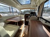 Saloon area with teak wood effect flooring throughout Inc cabins, LED cabin lights, convertible seating area/ dinette area to another double berth, dinette converts to forward travelling seat, faux leather upholstery, large sliding roof hatch, large sliding window, full curtain pack including rear door