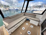 Aft cockpit with full cockpit enclosure, sliding rear bench seat which converts to large sun pad, cockpit table and access to engine bay and storage area
