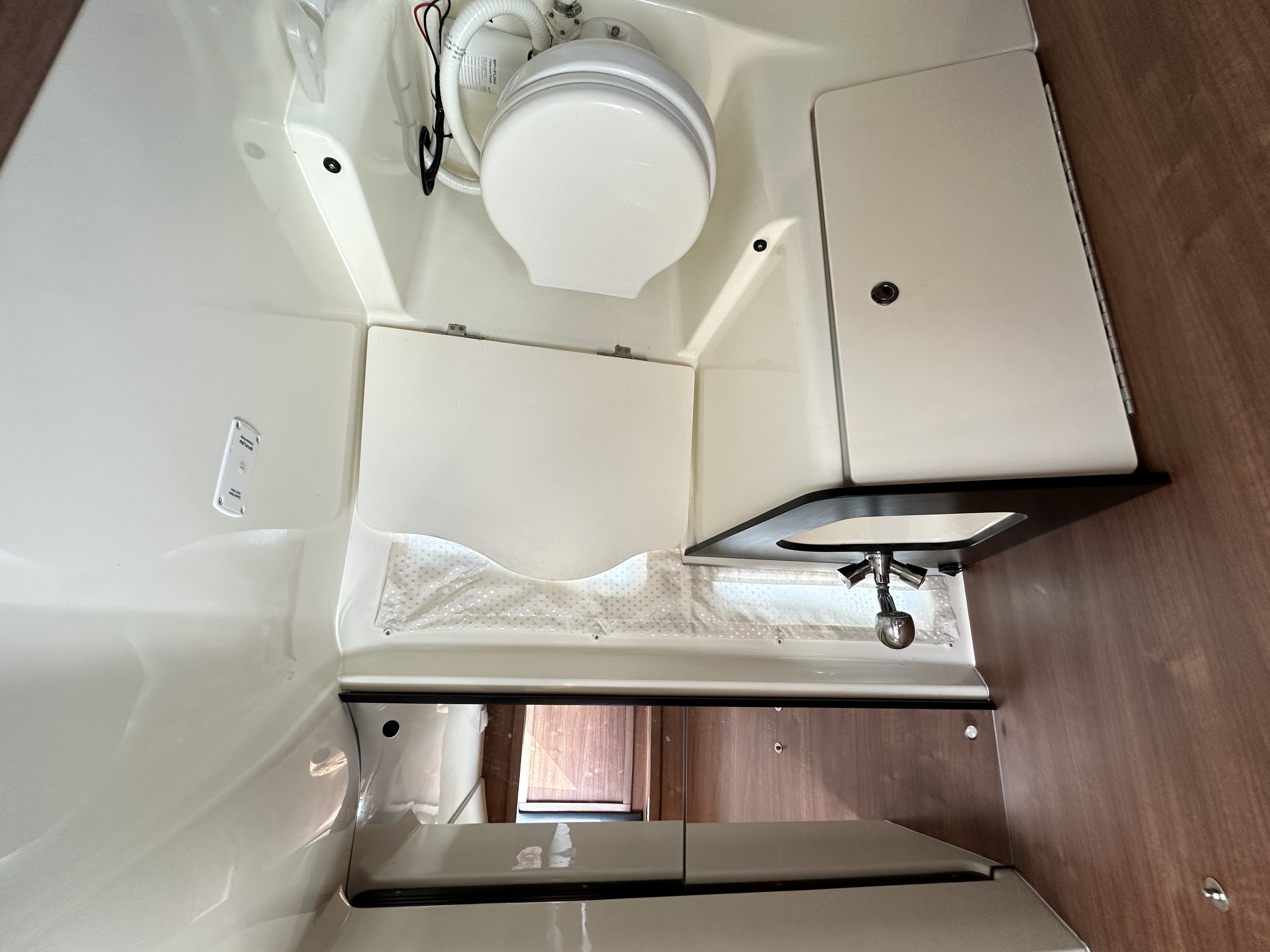 Separate Heads compartment with electric W/C, shower, sink and mirror, storage and opening portlight