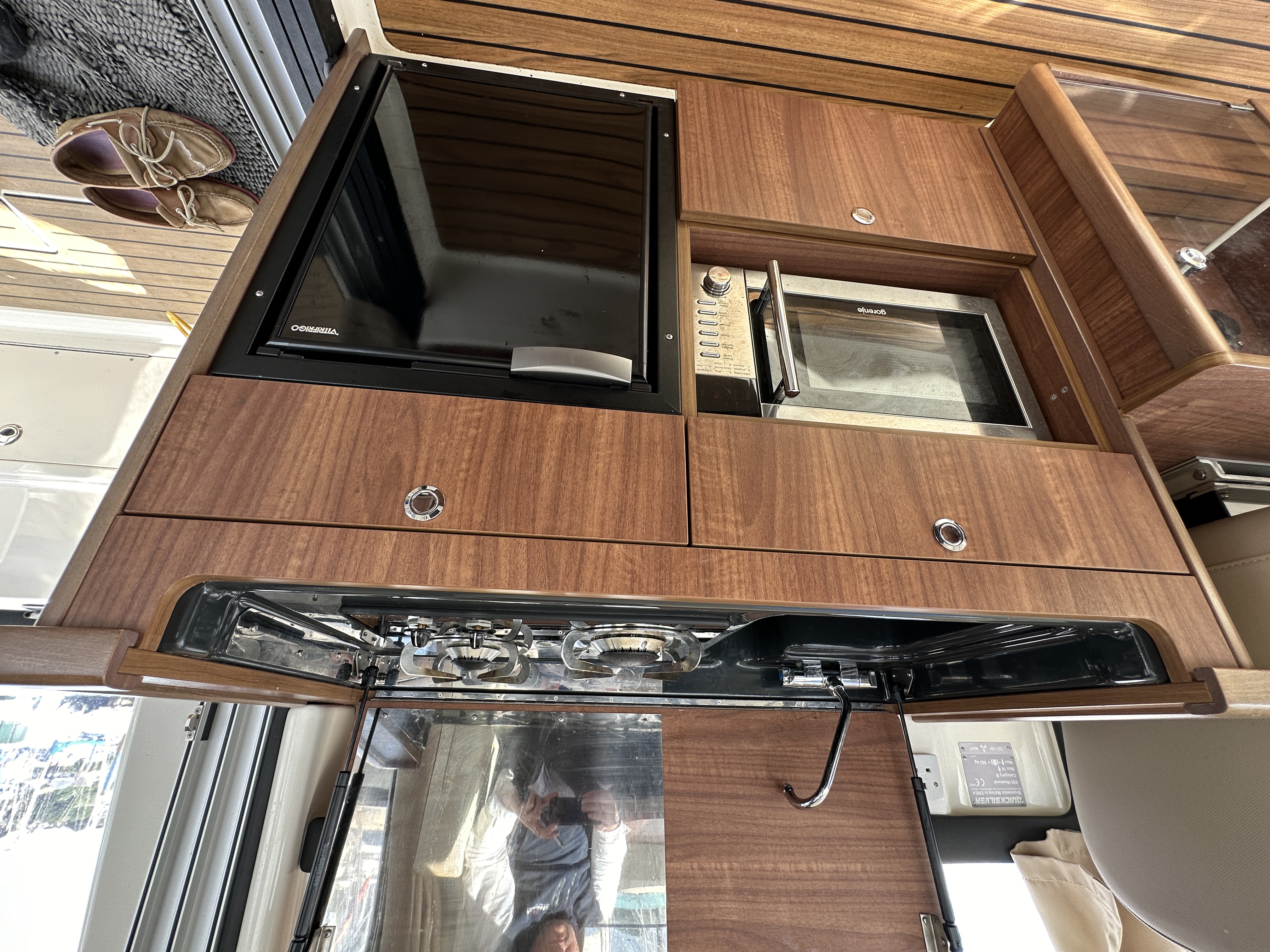 Galley area with twin burner gas stove, Gorenje microwave, sink with hot and cold pressurised water, Vitrifrigo 12v Fridge with ice compartment,