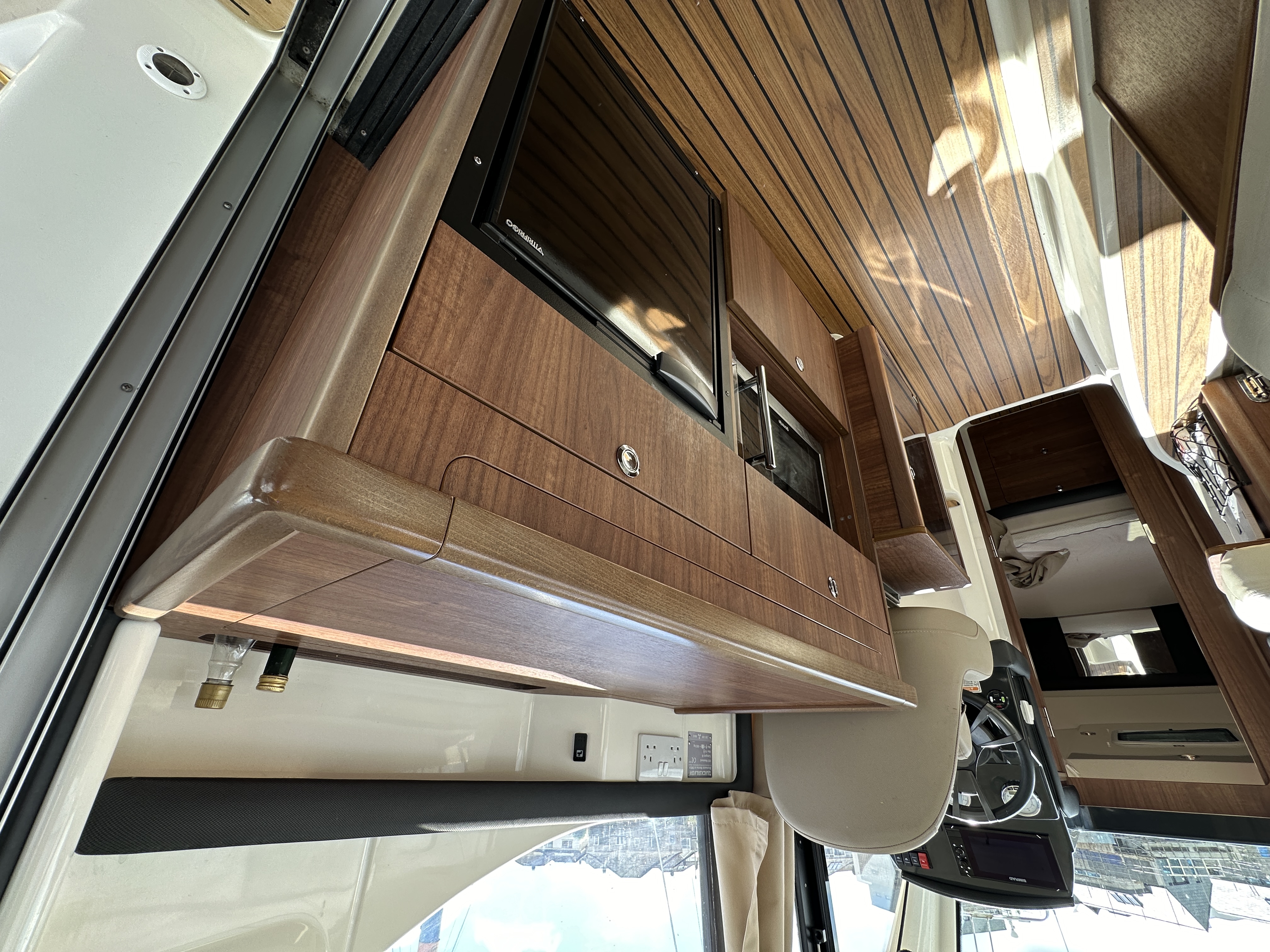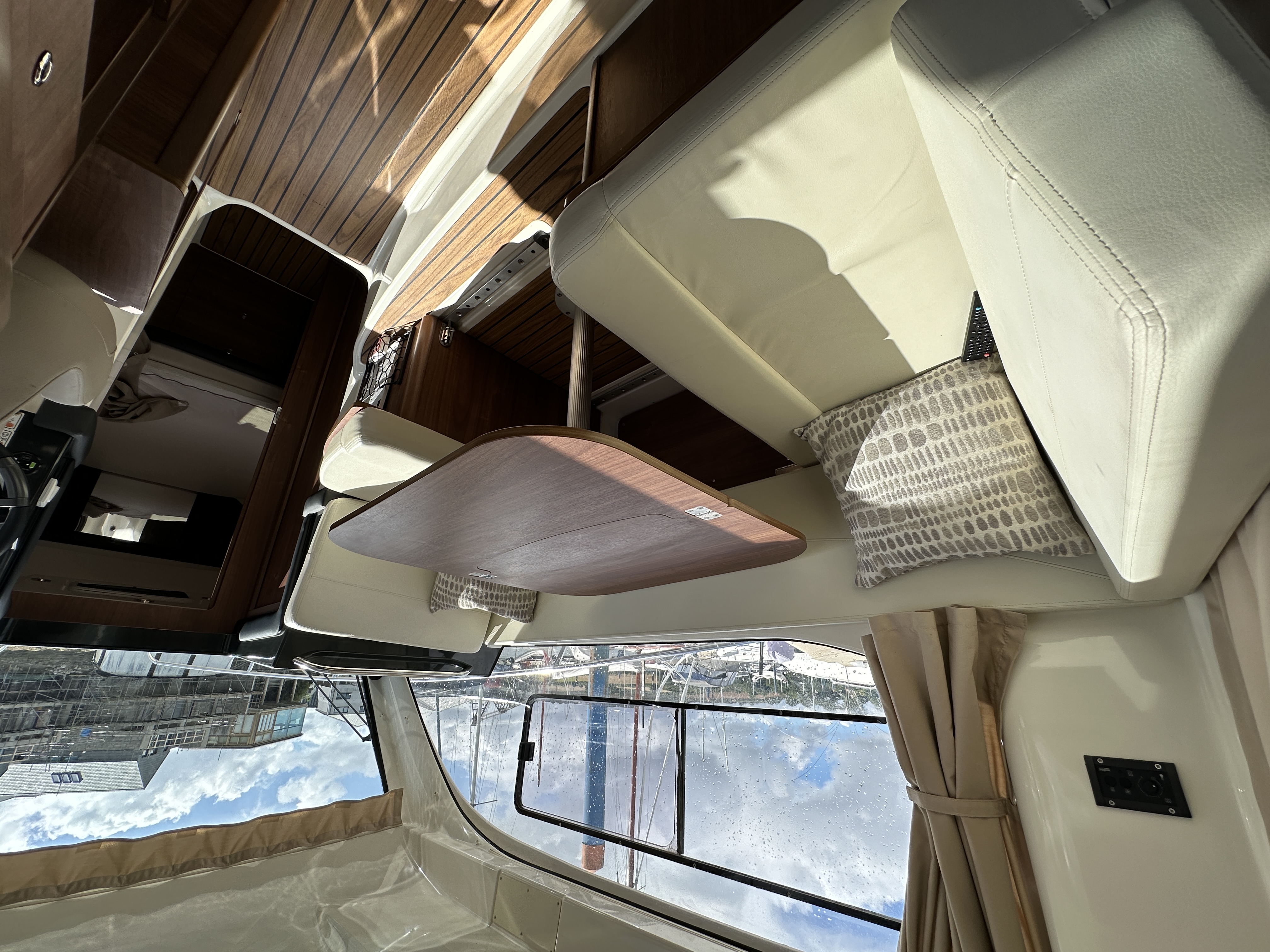 Saloon area with teak wood effect flooring throughout Inc cabins, LED cabin lights, convertible seating area/ dinette area to another double berth, dinette converts to forward travelling seat, faux leather upholstery, large sliding roof hatch, large sliding window, full curtain pack including rear door