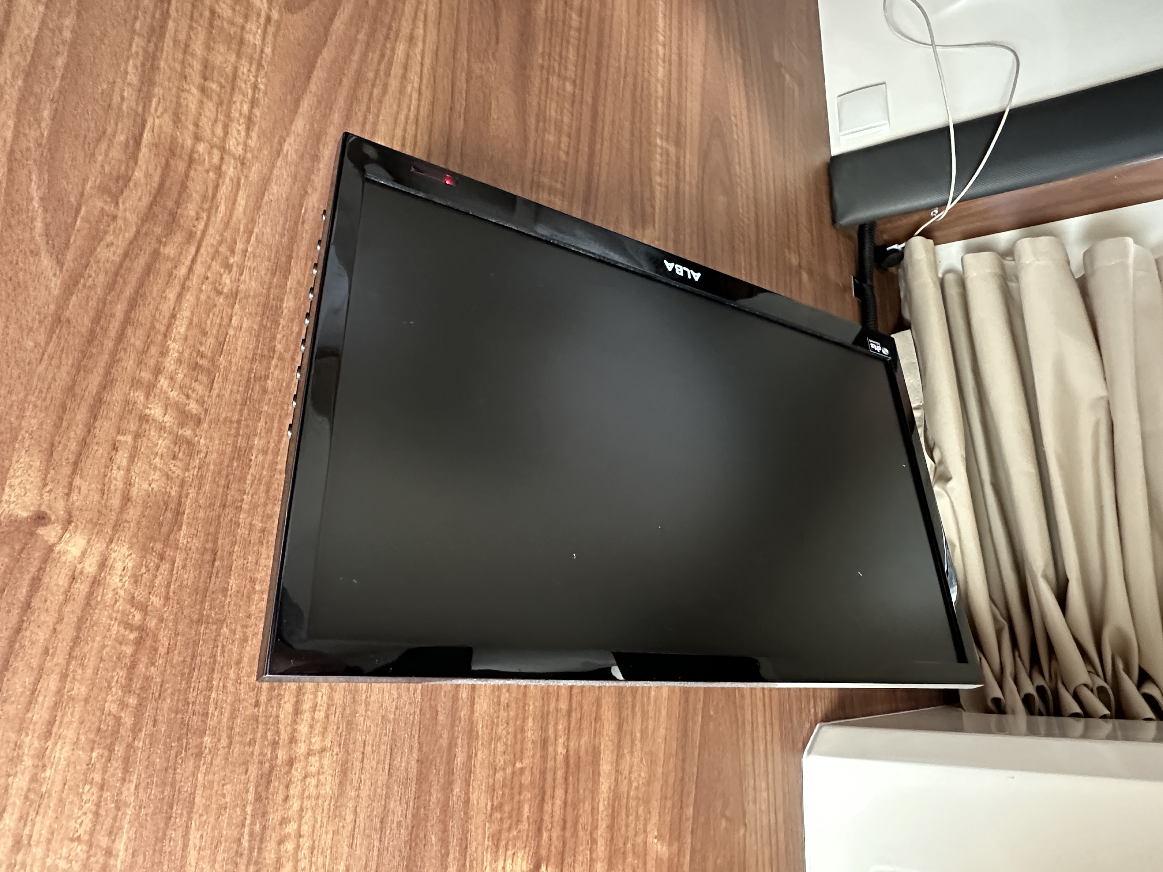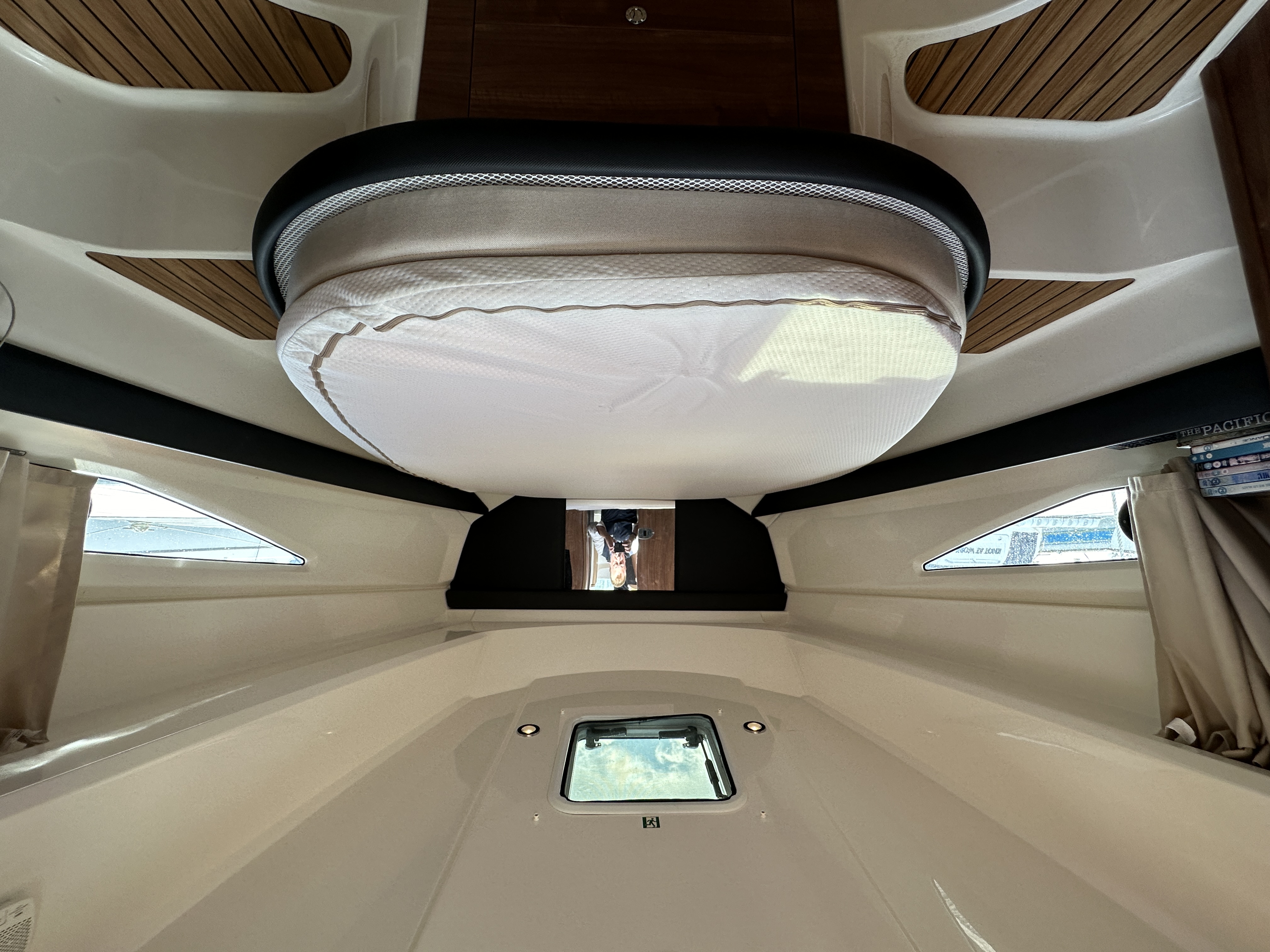 Master cabin forward with double berth, hanging locker and storage under bed, shelving with fiddles, 240v socket, Fusion stereo speakers, Alba TV, opening deck hatch, opening port lights, sun shades and curtains
