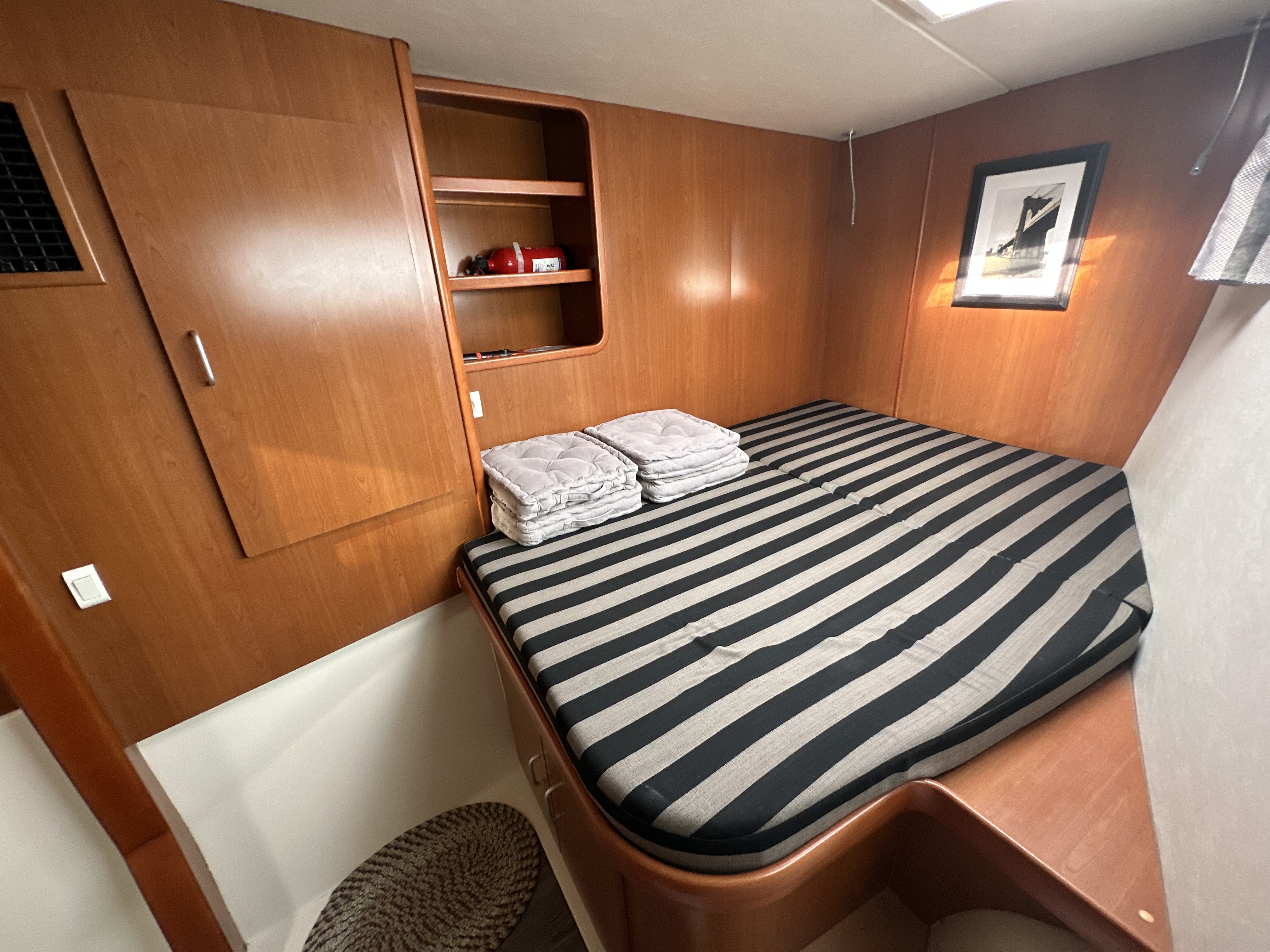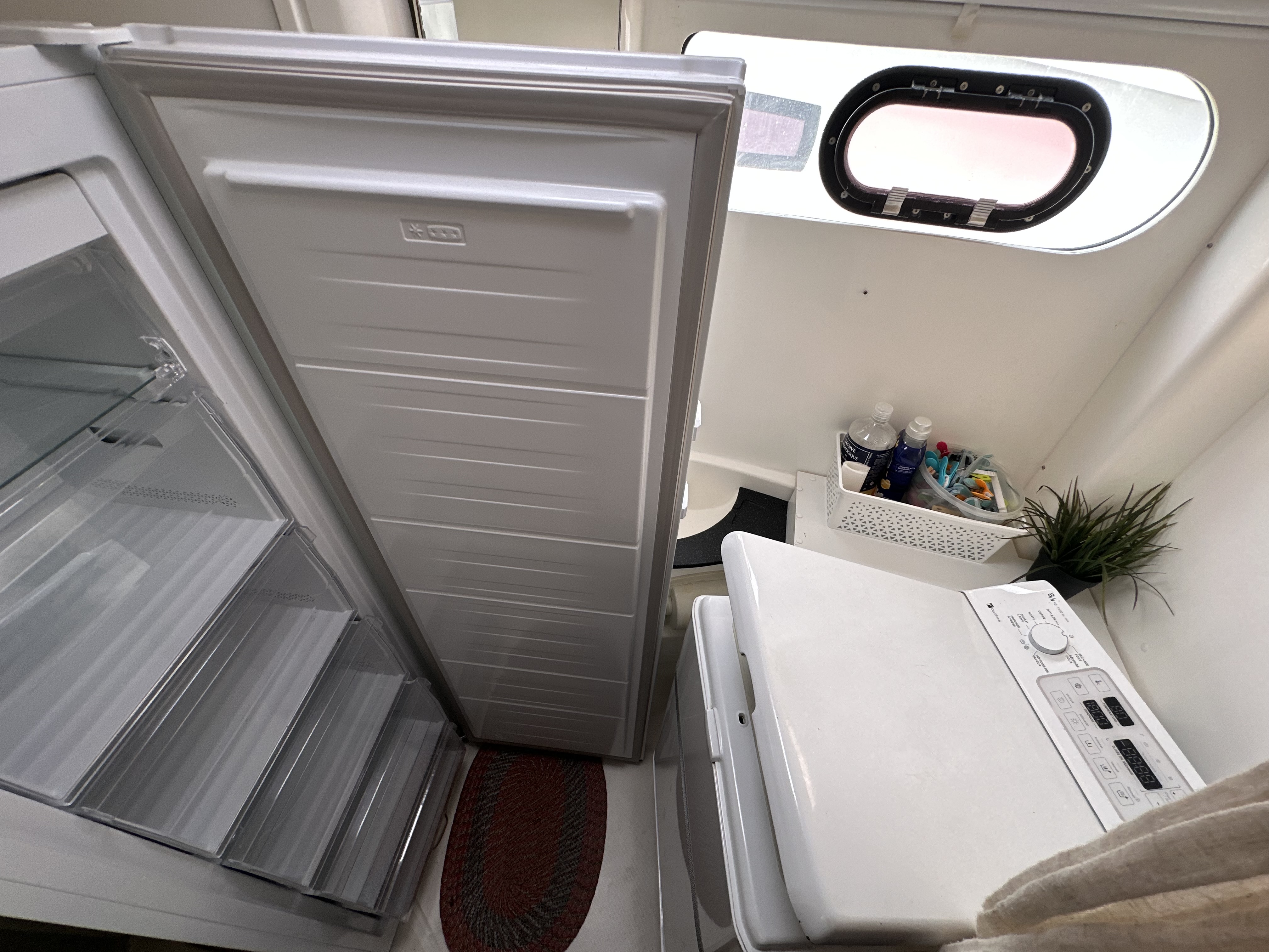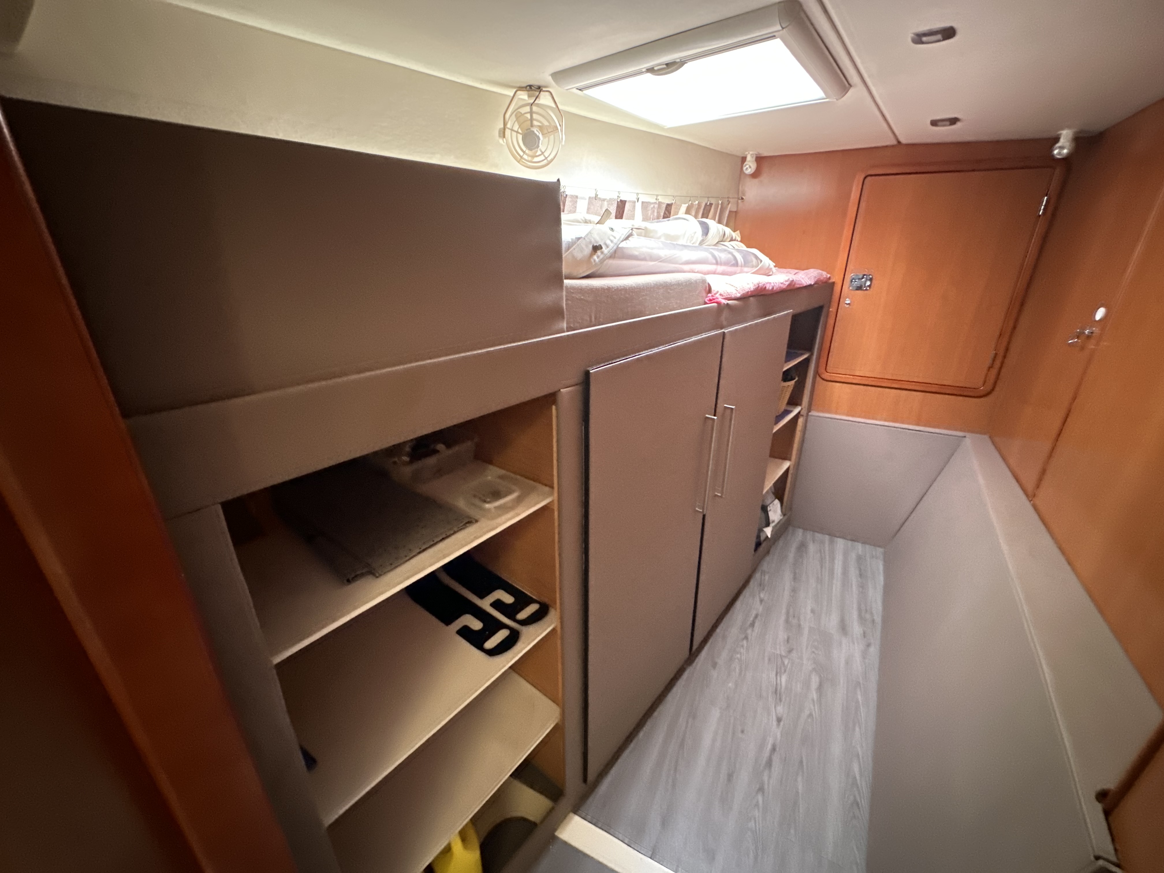 Converted forward port cabin to a utility room with storage racks and a berth. The ensuite head from this cabin is used as a laundry room with a washing machine dryer and a freezer with 5 drawers.