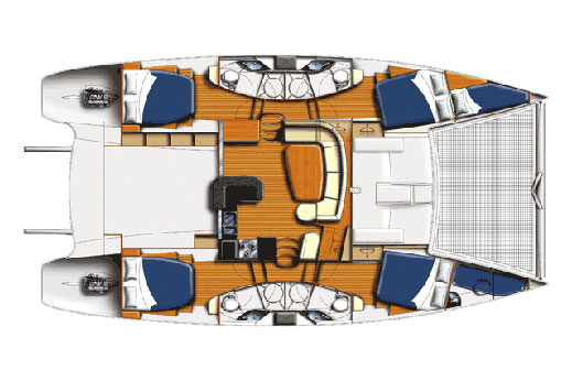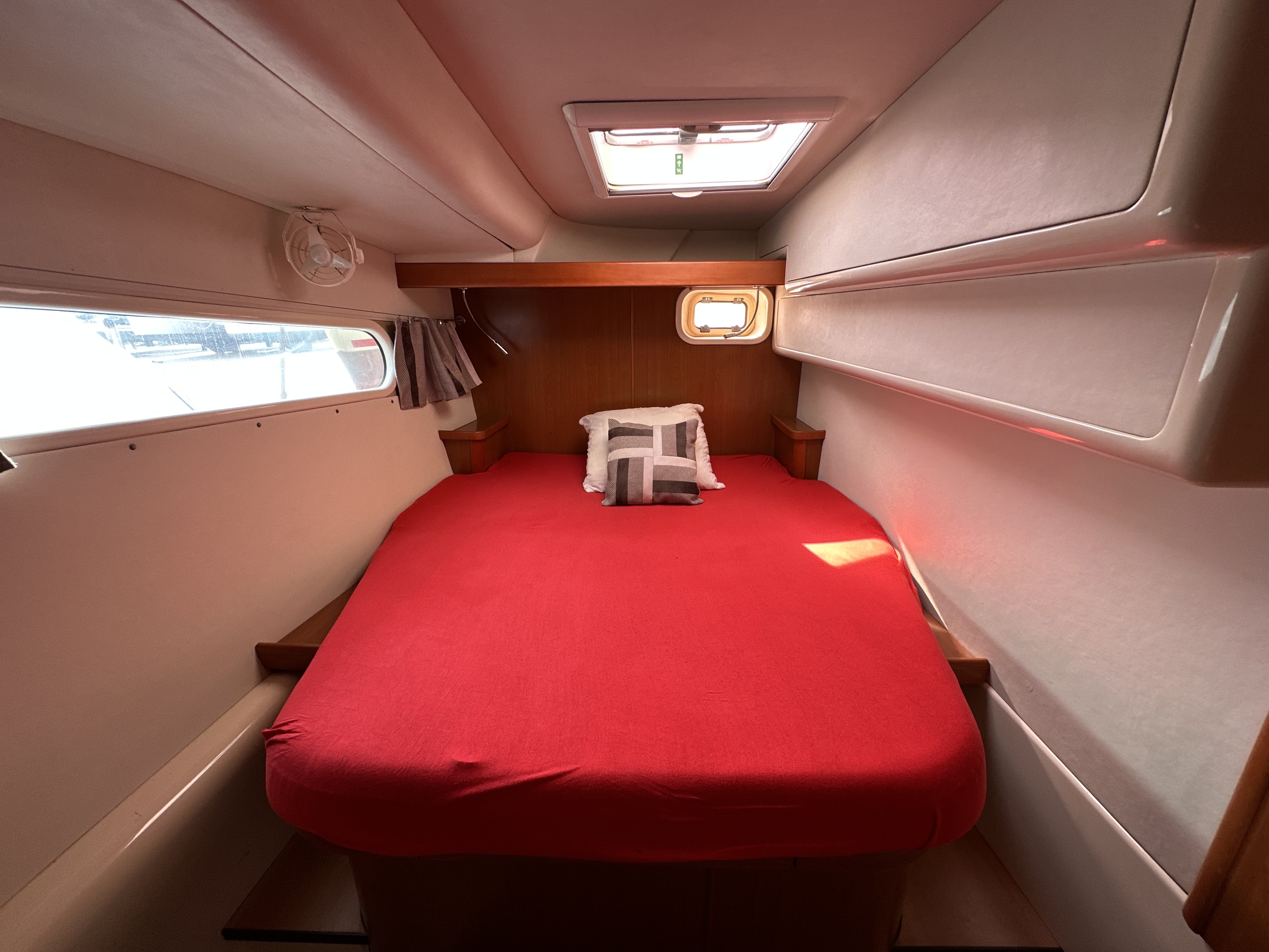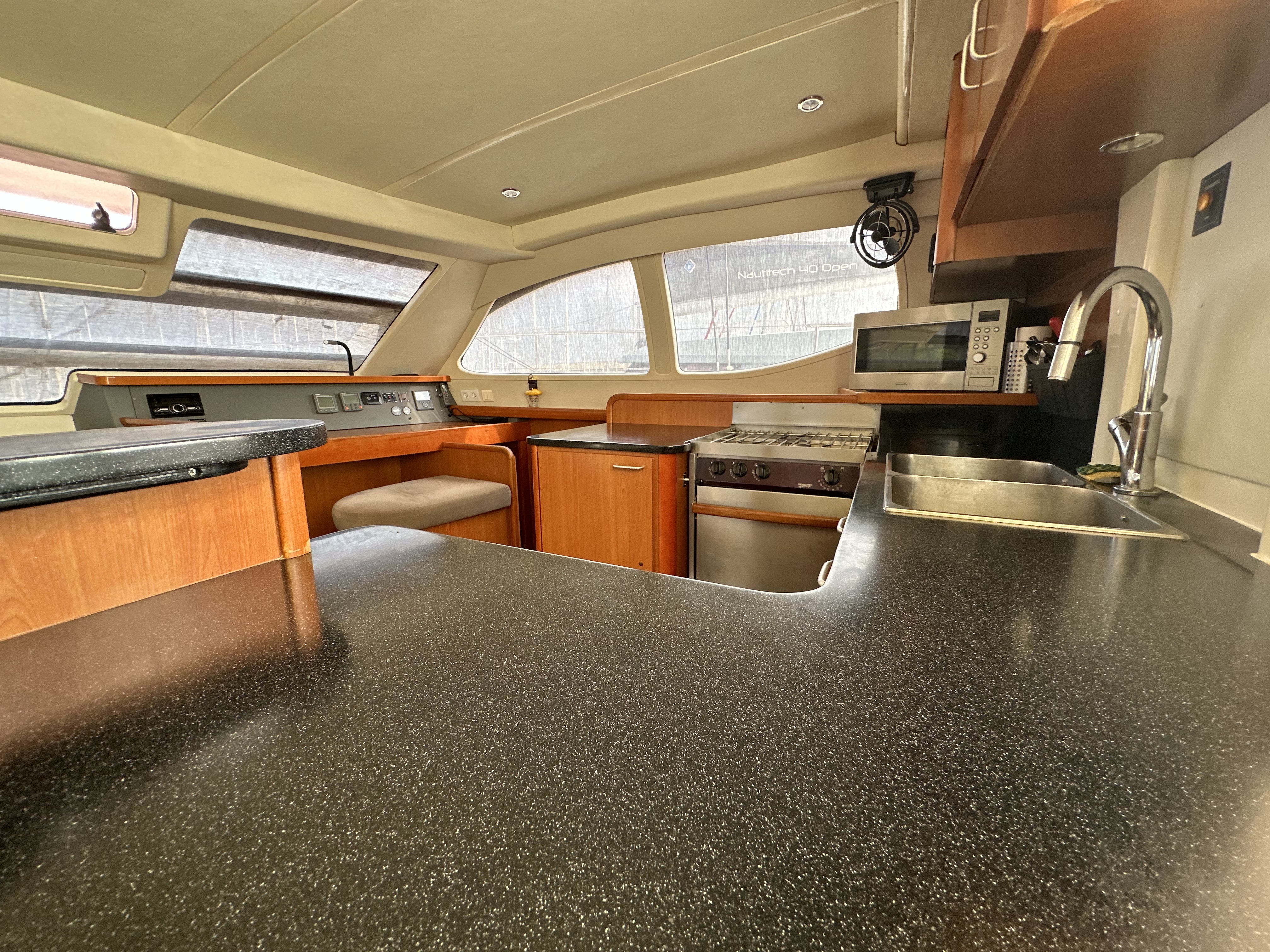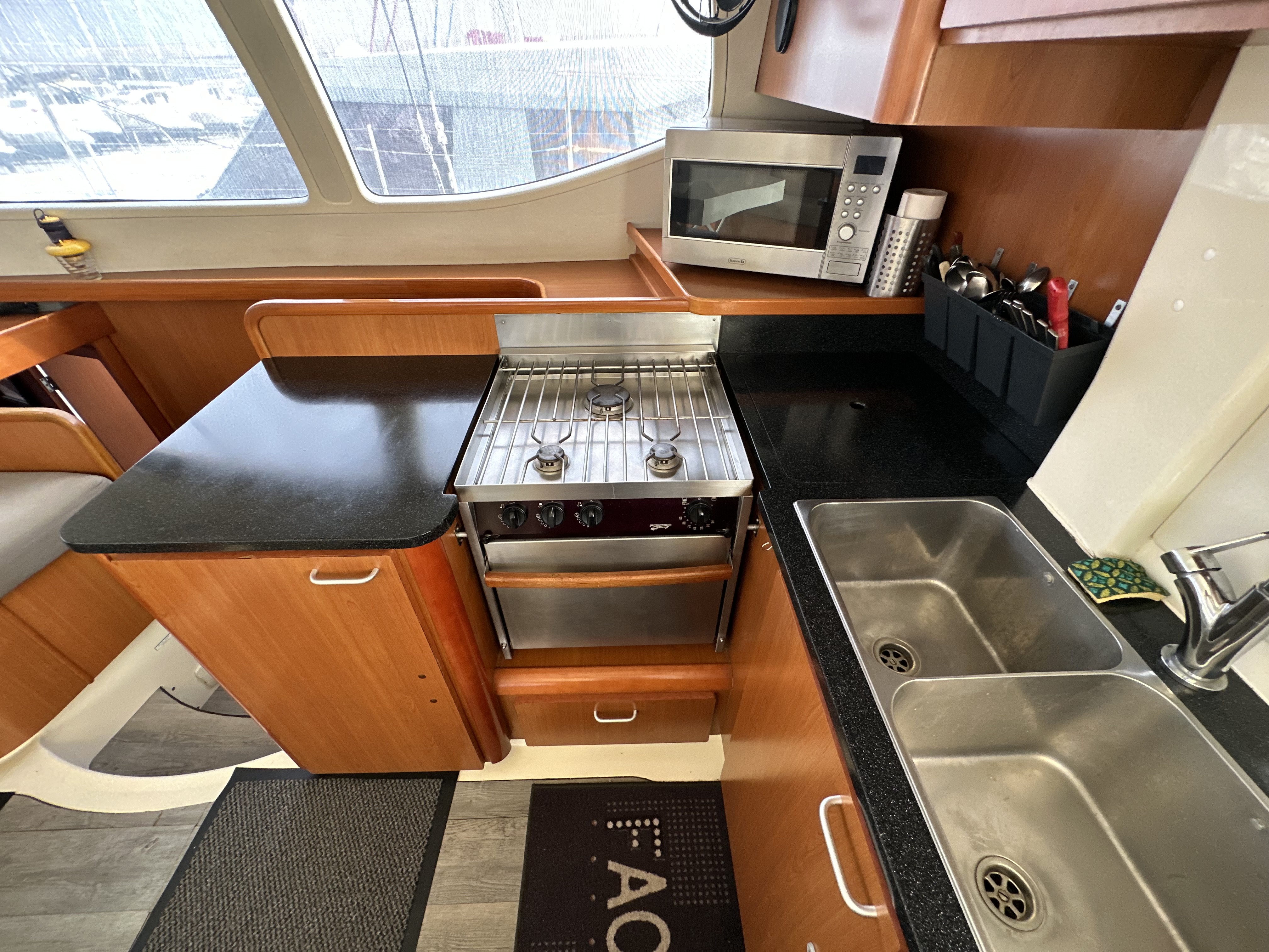 The galley to starboard is very well equipped and practical and comes with an FORCE 10 three-burner stainless stell stove with grill, double fridge below the electrical panel, microwave oven ESSENTIEL B, twin stainless steel sinks with mixer tape and plenty of work surfaces.