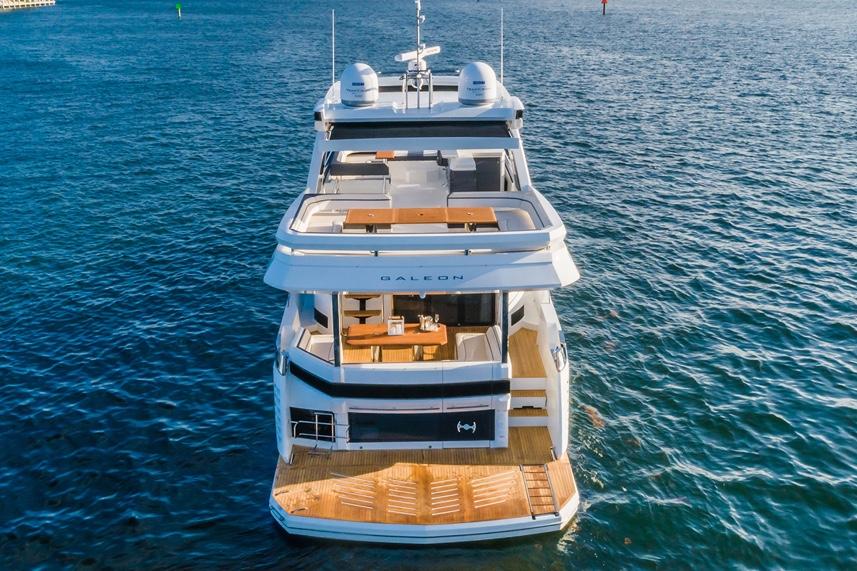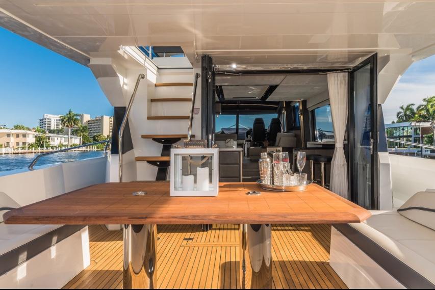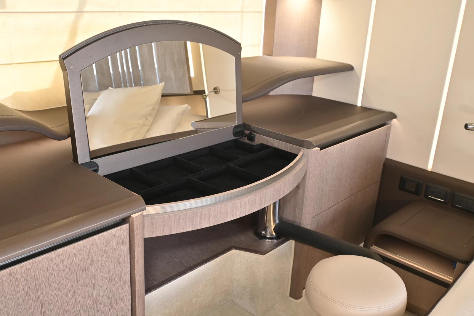 The foredeck can be transformed into an expansive seating area with a touch of a button for sunning or sunset cruising. The vast Flybridge is most impressive with plentiful seating, wet bar entertaining, and a carbon hardtop and the opening windows in the salon allow cool breezes to sinuously blend inside and outside spaces. With 4 cabins, 30+ knot performance, and amazing innovation the 680 FLY sets new benchmarks.