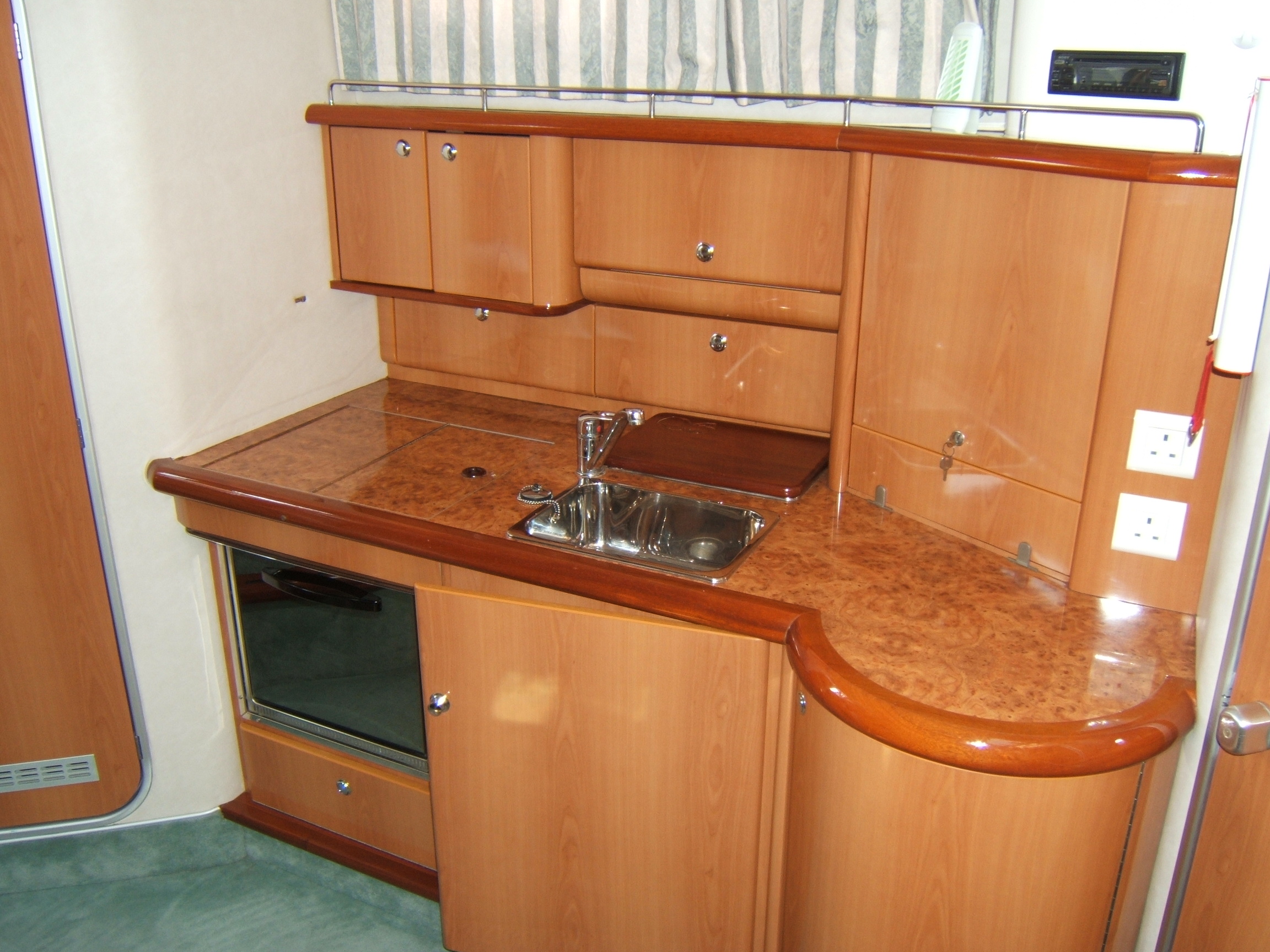 Galley with SMEV three-burner gas hob with oven and grill, 12/240v fridge, icebox and double sink