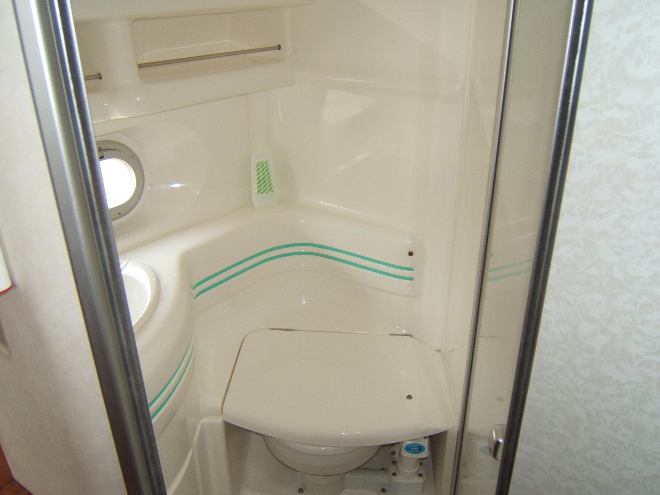 Heads compartment to port with Jabsco marine toilet and hand basin