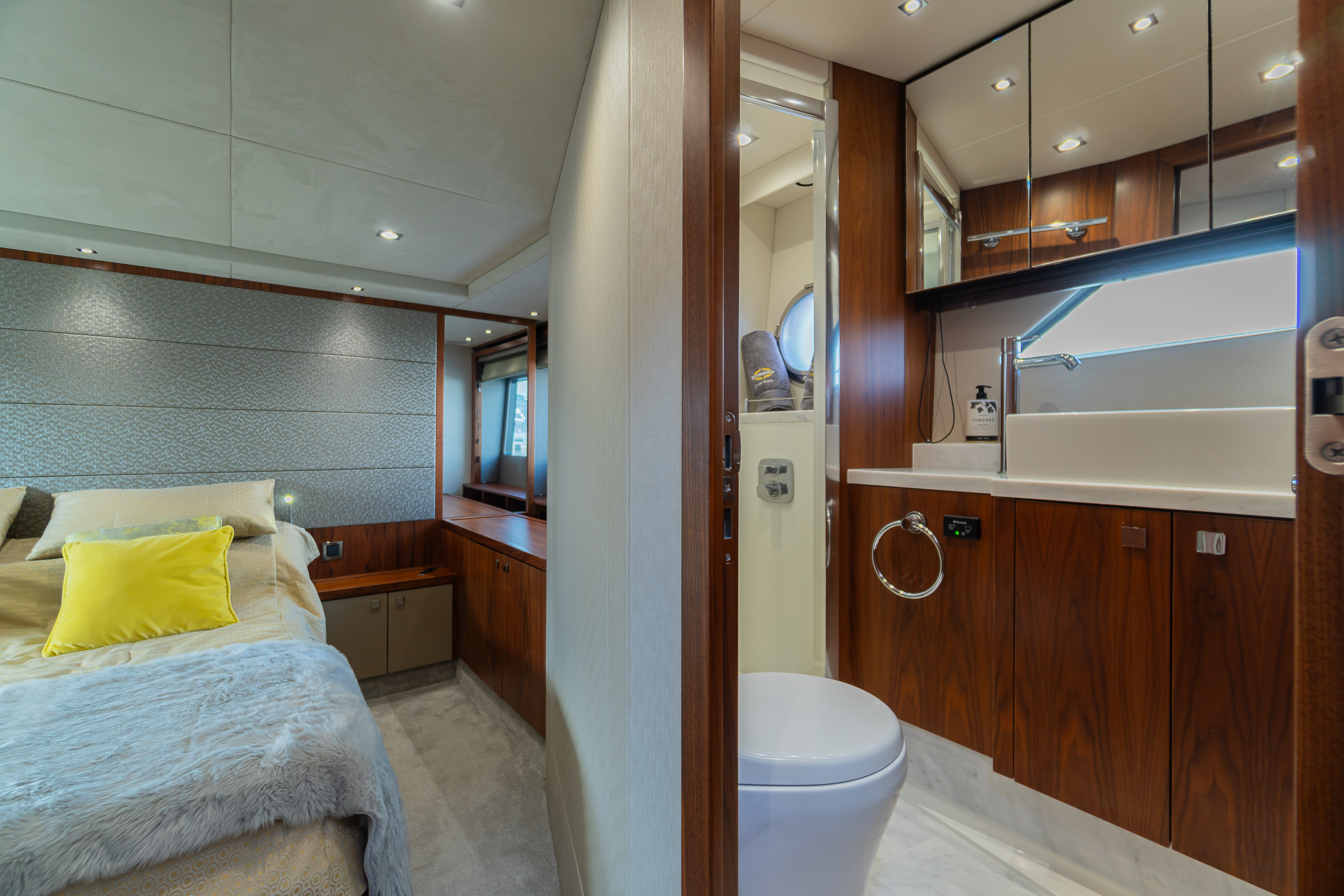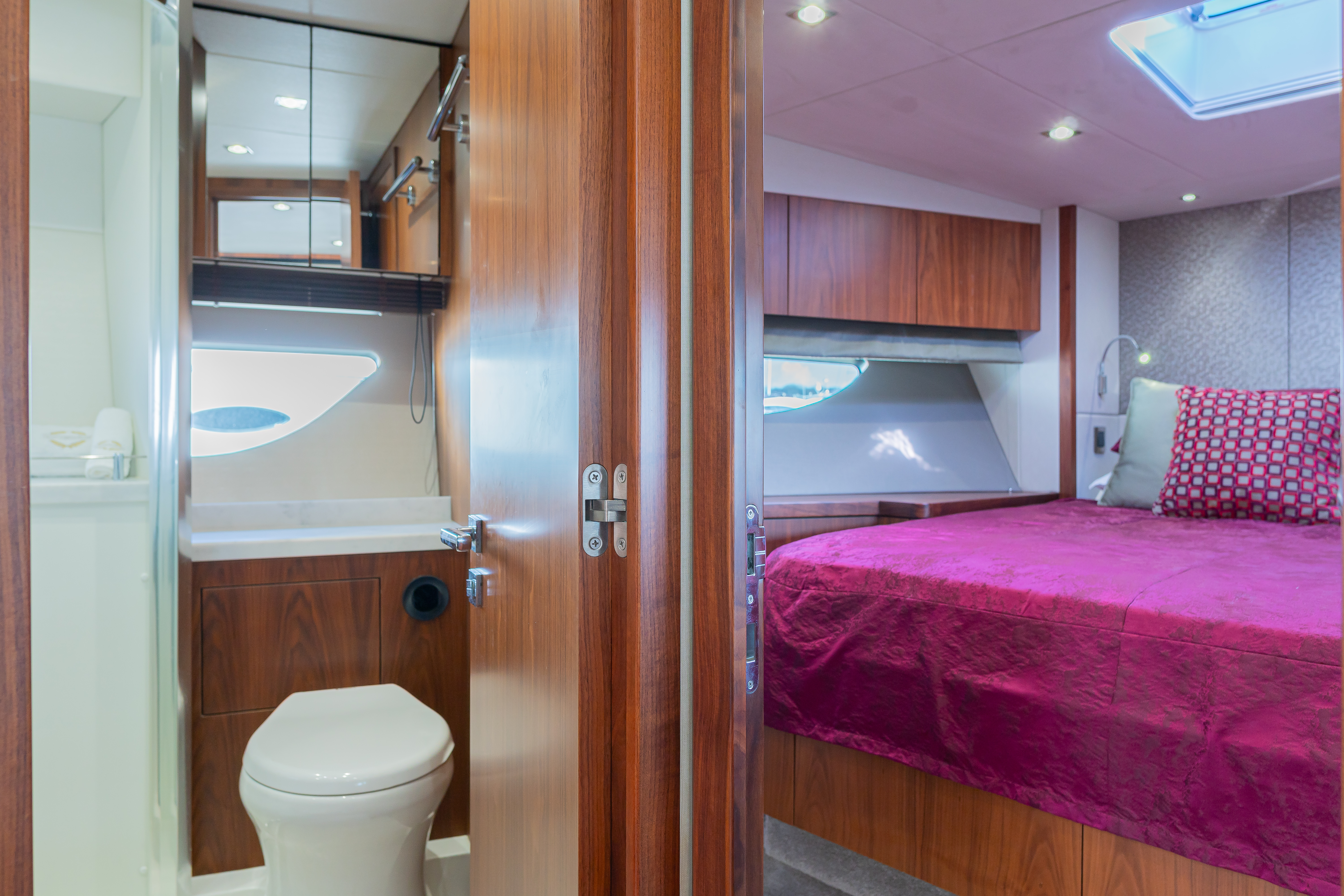 En-suite heads with access to galley (acting as day heads) with separate walk-in shower, electric vacu-flush toilet and wash basin.