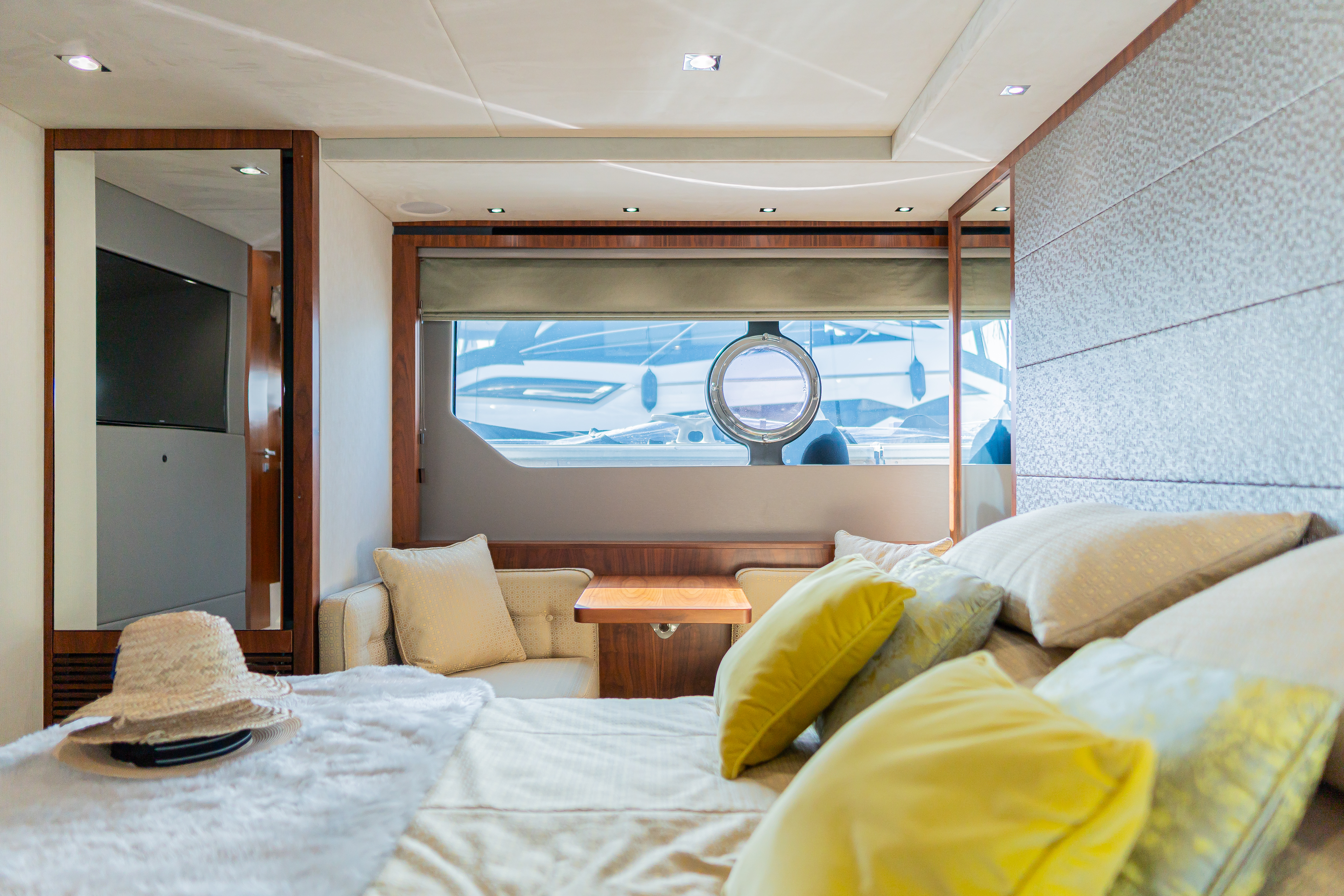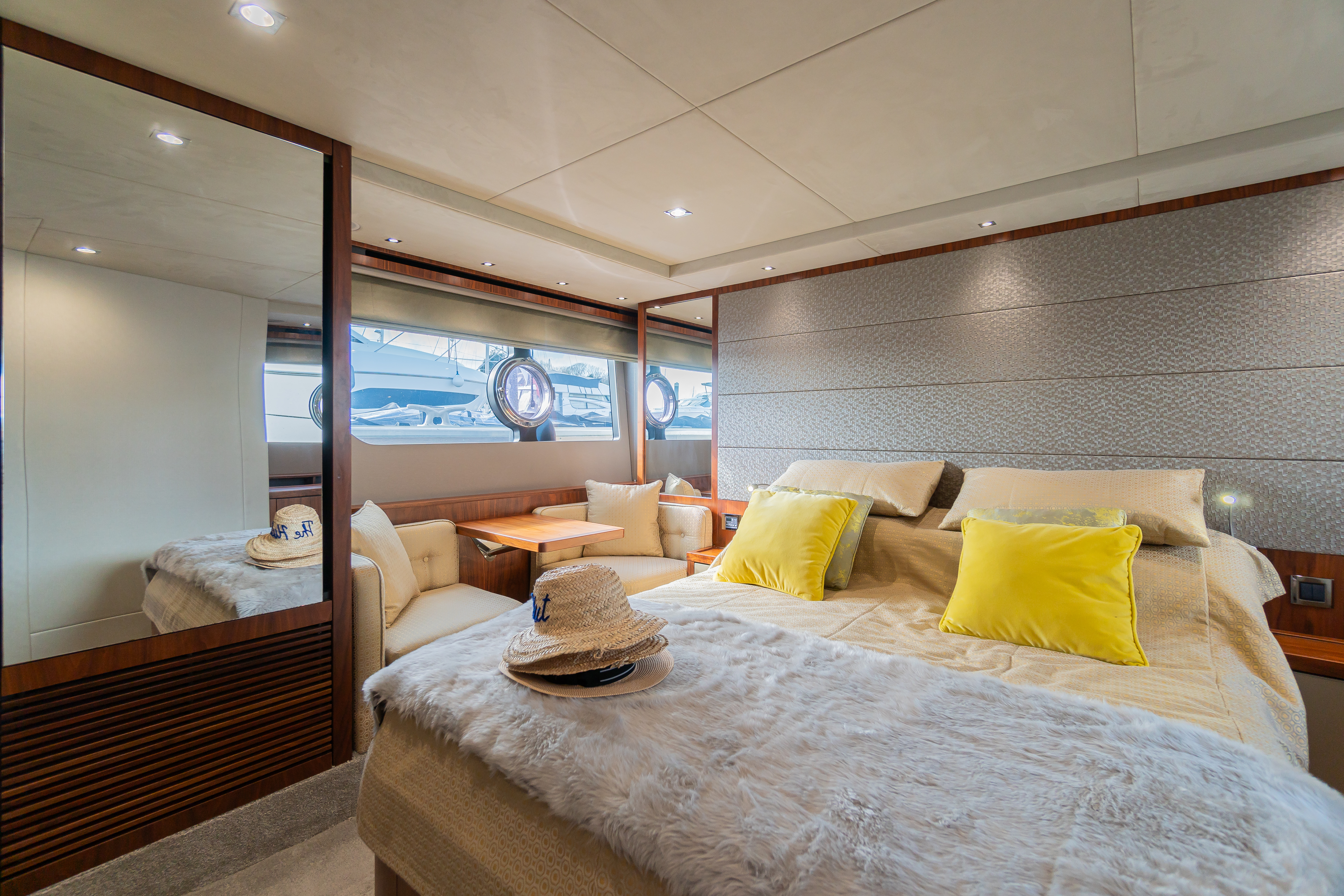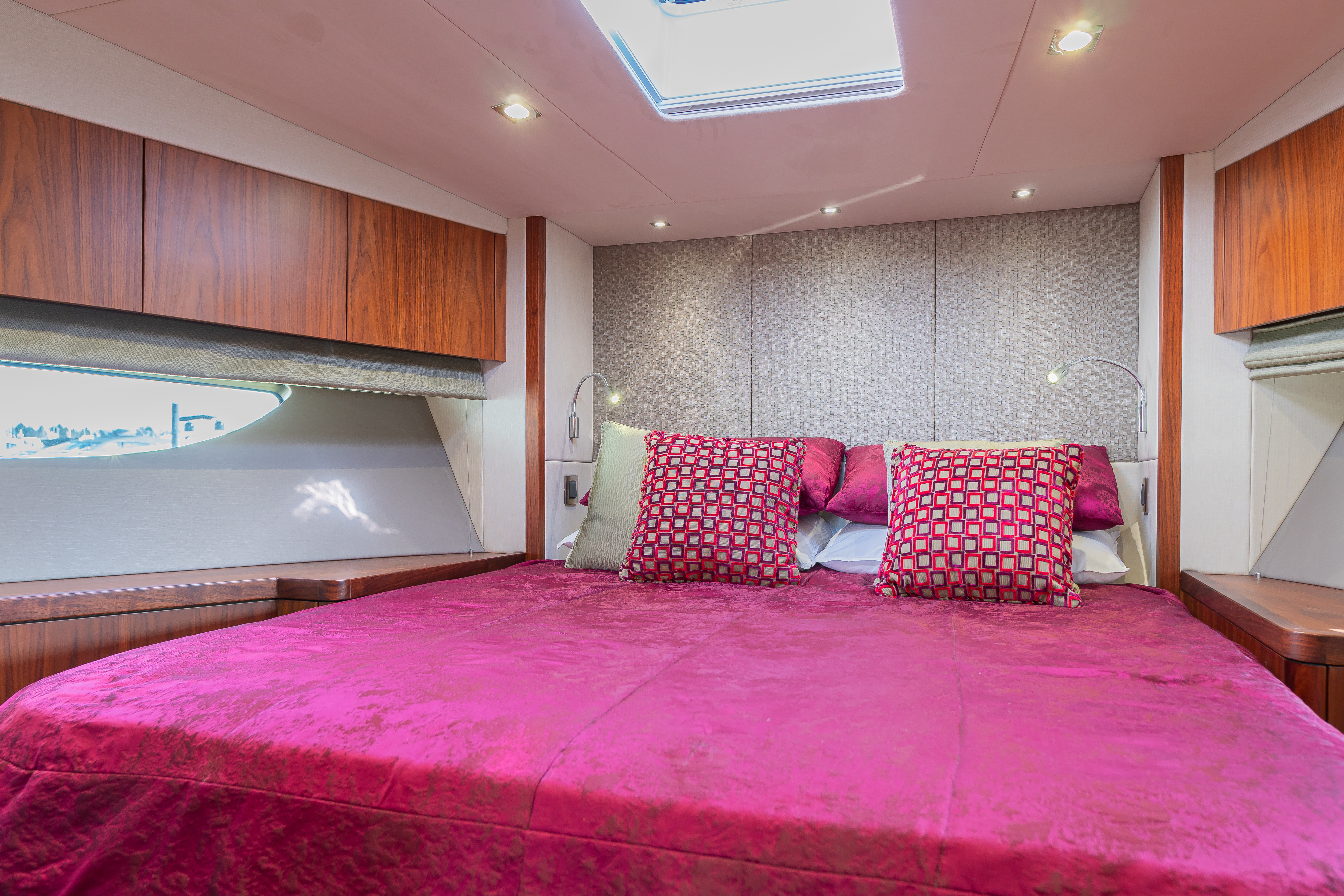 Master cabin with double island berth, ample storage, hanging locker and seating area with small table