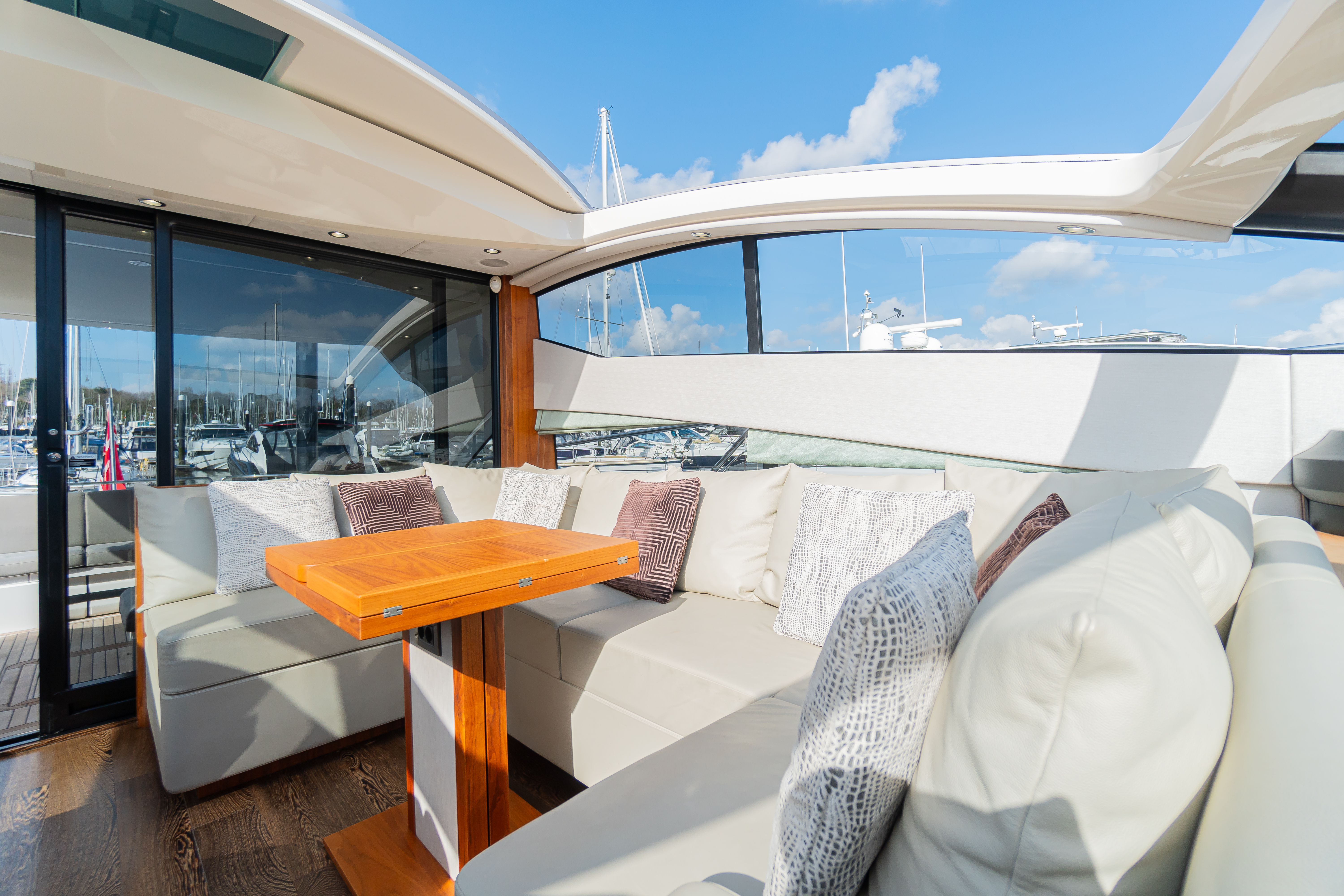 Deck Saloon with generous U-shaped cream leather seating area, extending table and storage to starboard with drinks cabinet, coolbox and lifting TV system.
