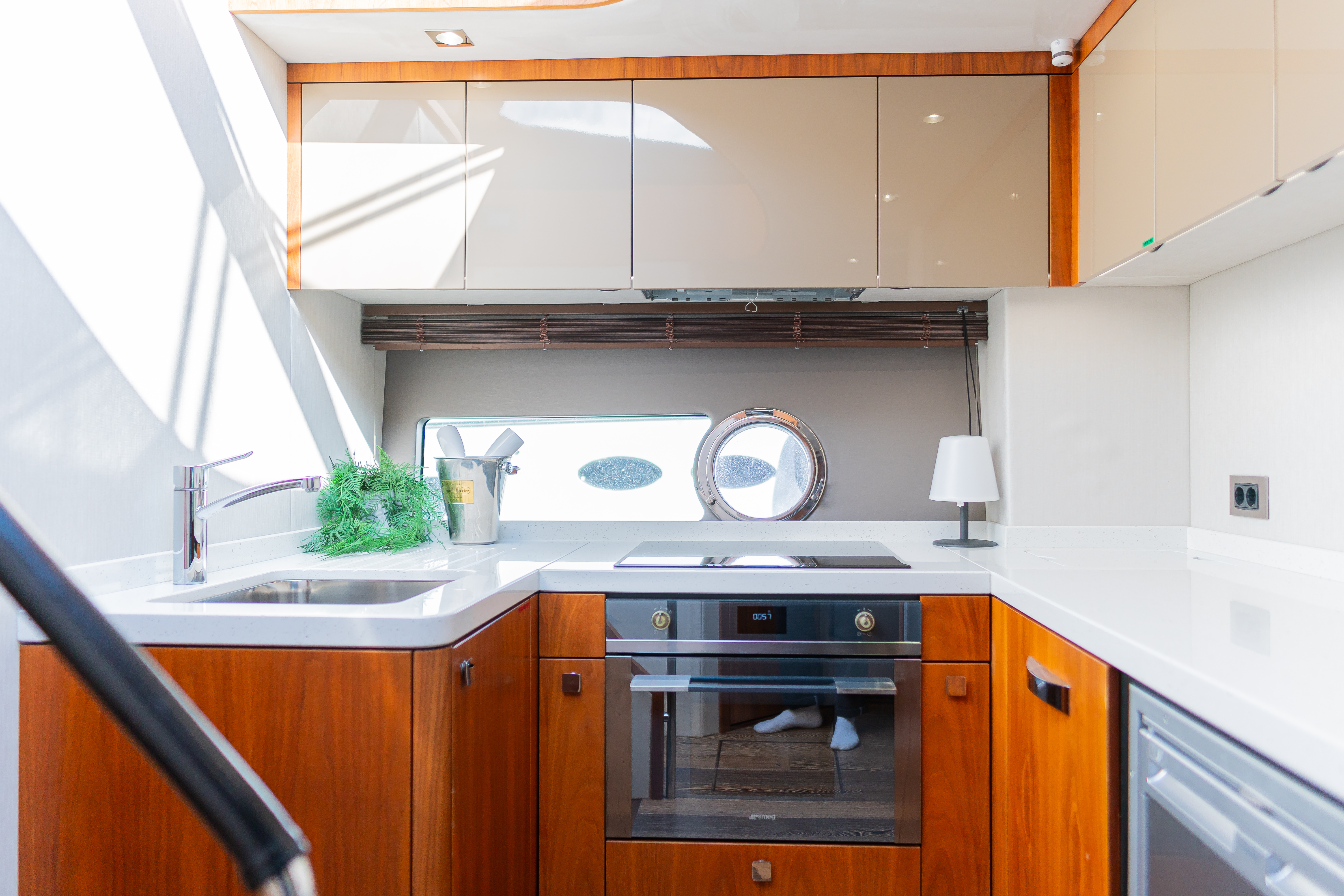 C-shaped galley with large stainless steel sink, electric oven, induction hob, Miele 220V slimline dishwasher, fridge/freezer with white stone counter top and gloss finish high-level storage cabinets