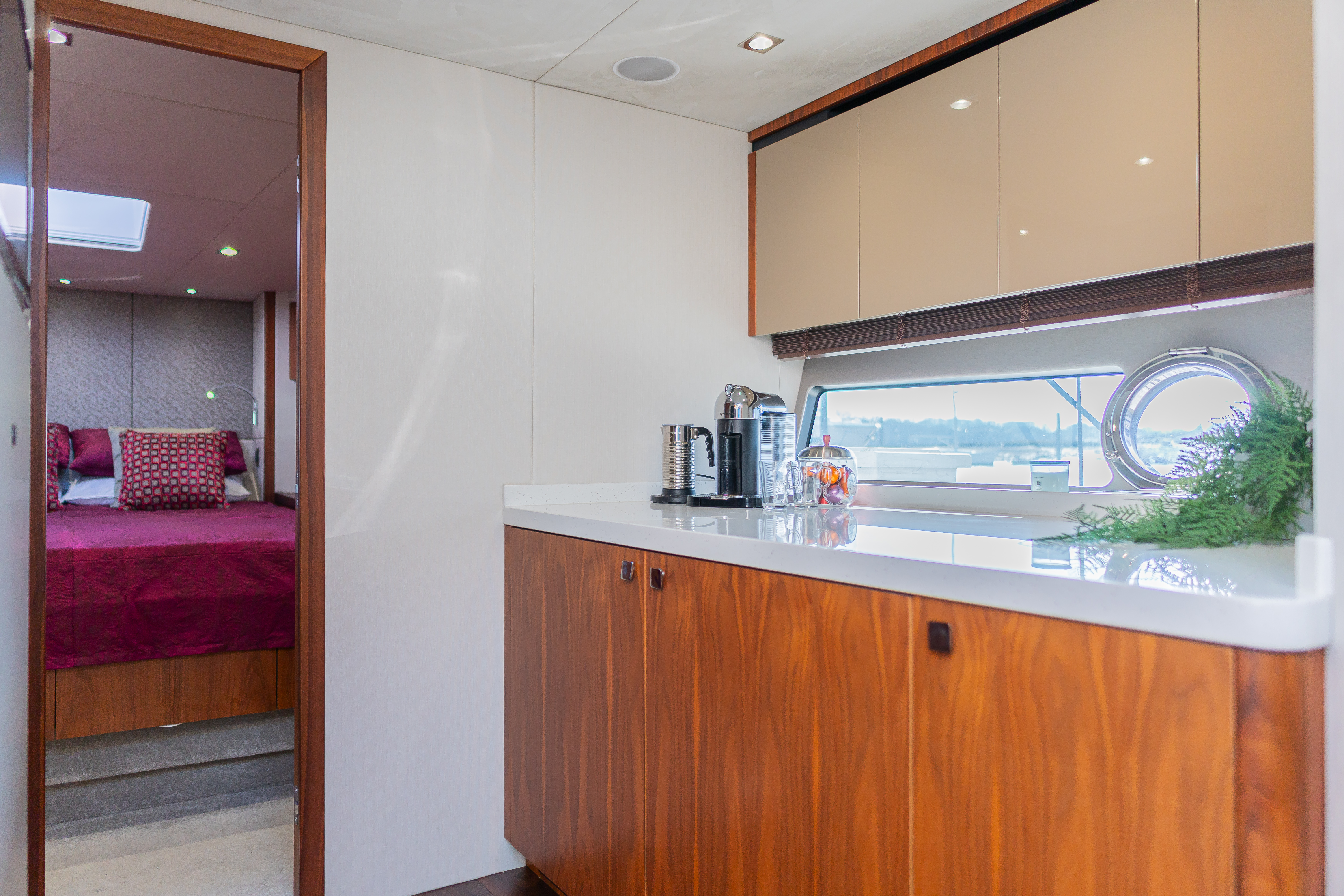 Custom worktop/bar areas to starboard in lieu of dinette. With additional storage, Miele washer/dryer and wine cooler.