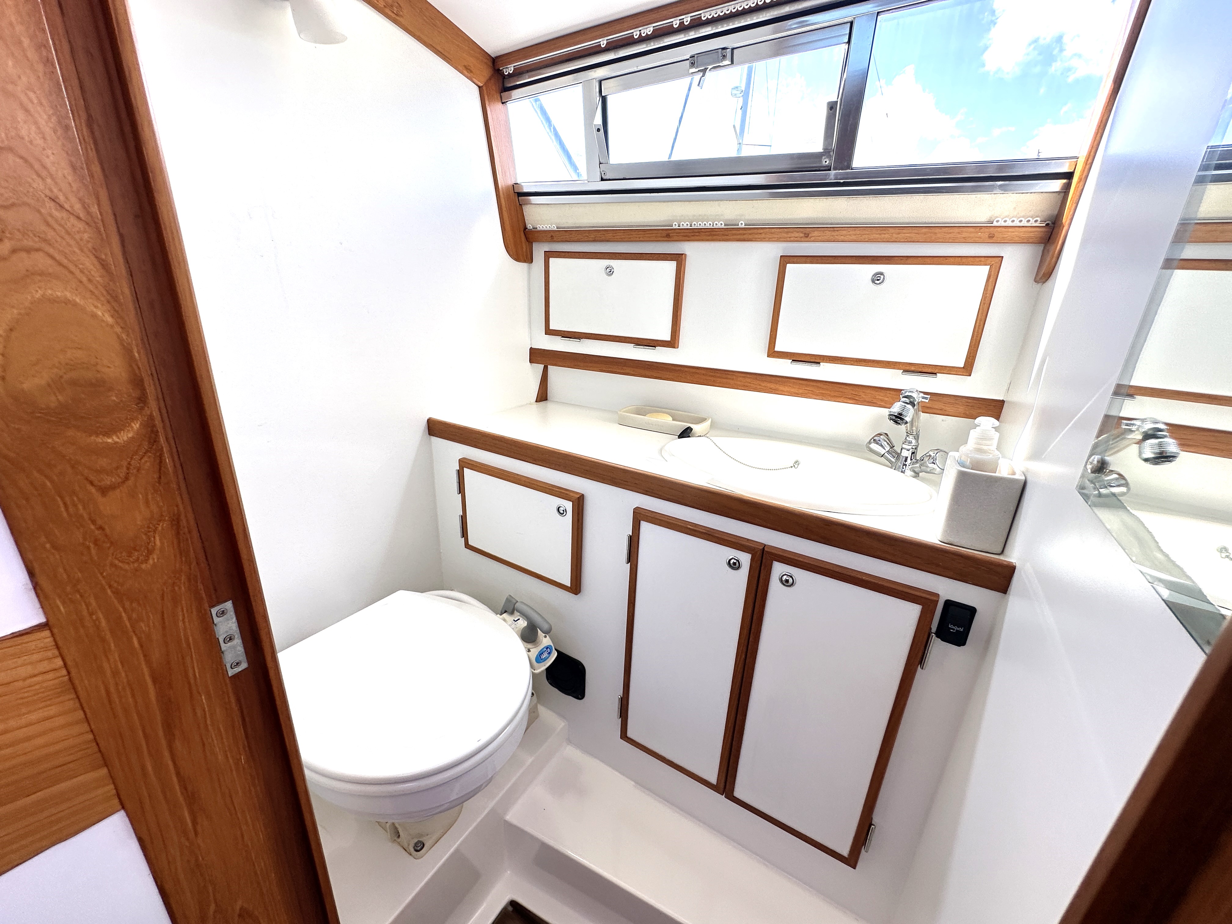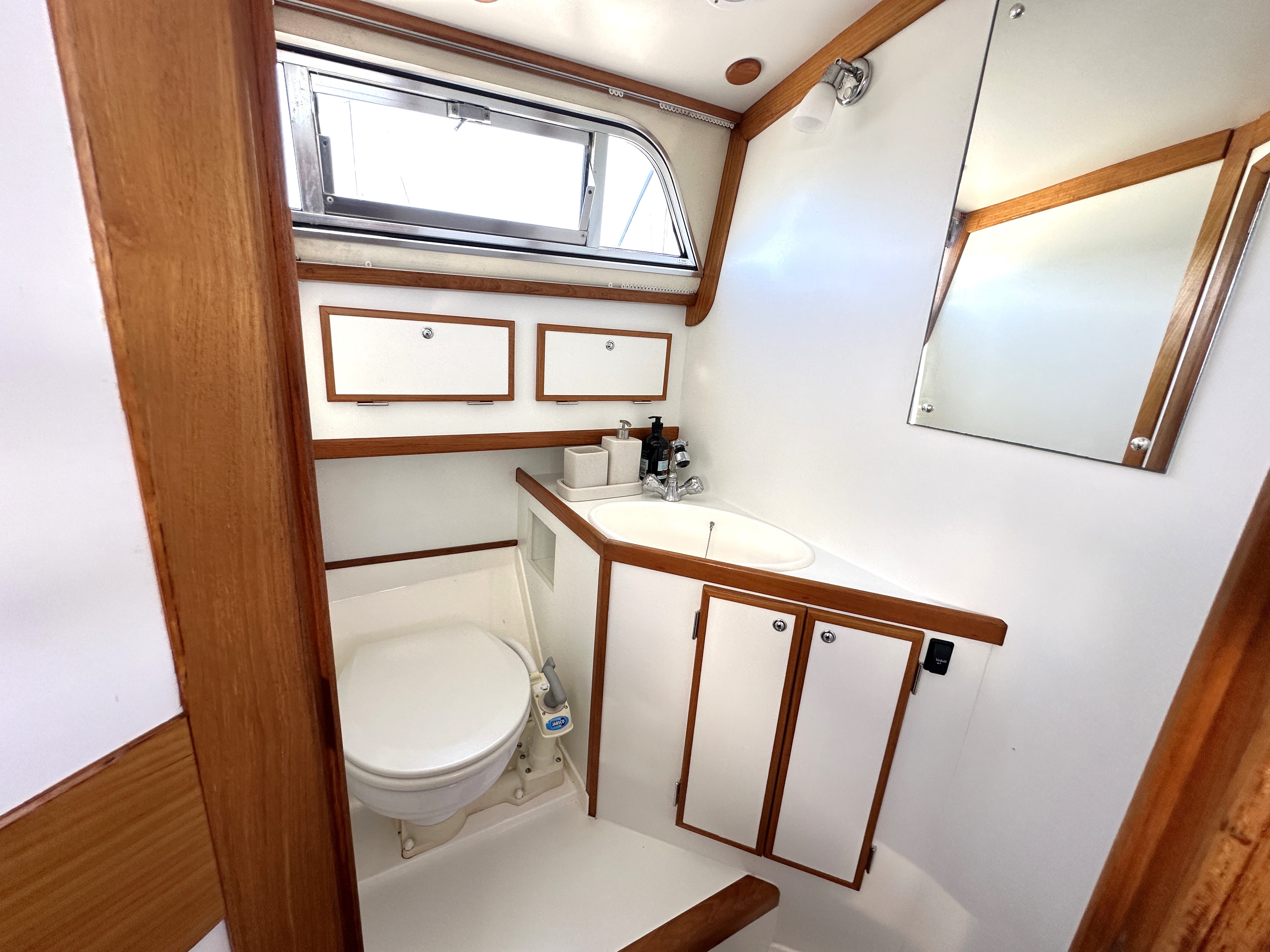 Separate compartment with Jabsco marine WC, washbasin, shoer with pump out and stowage