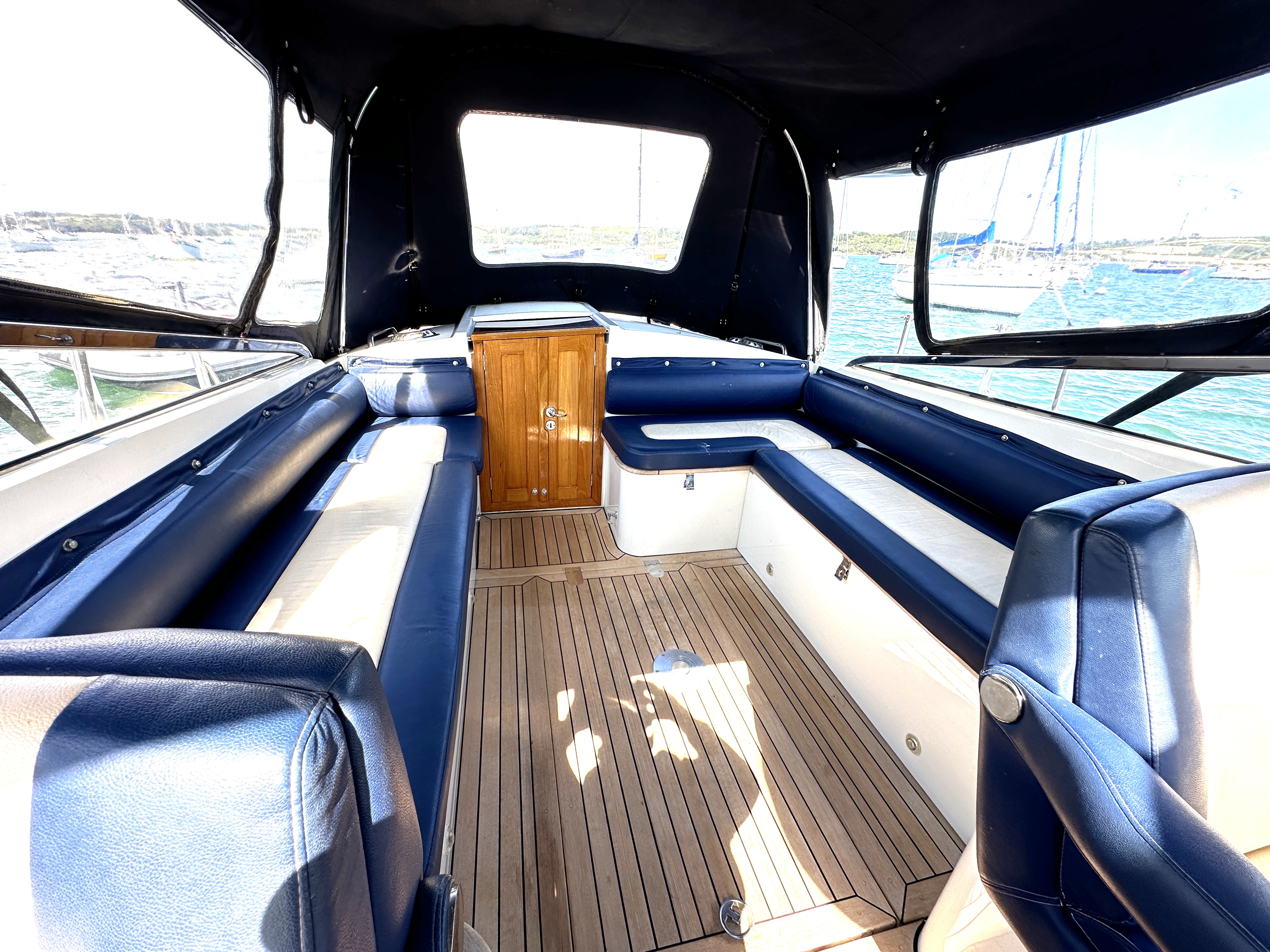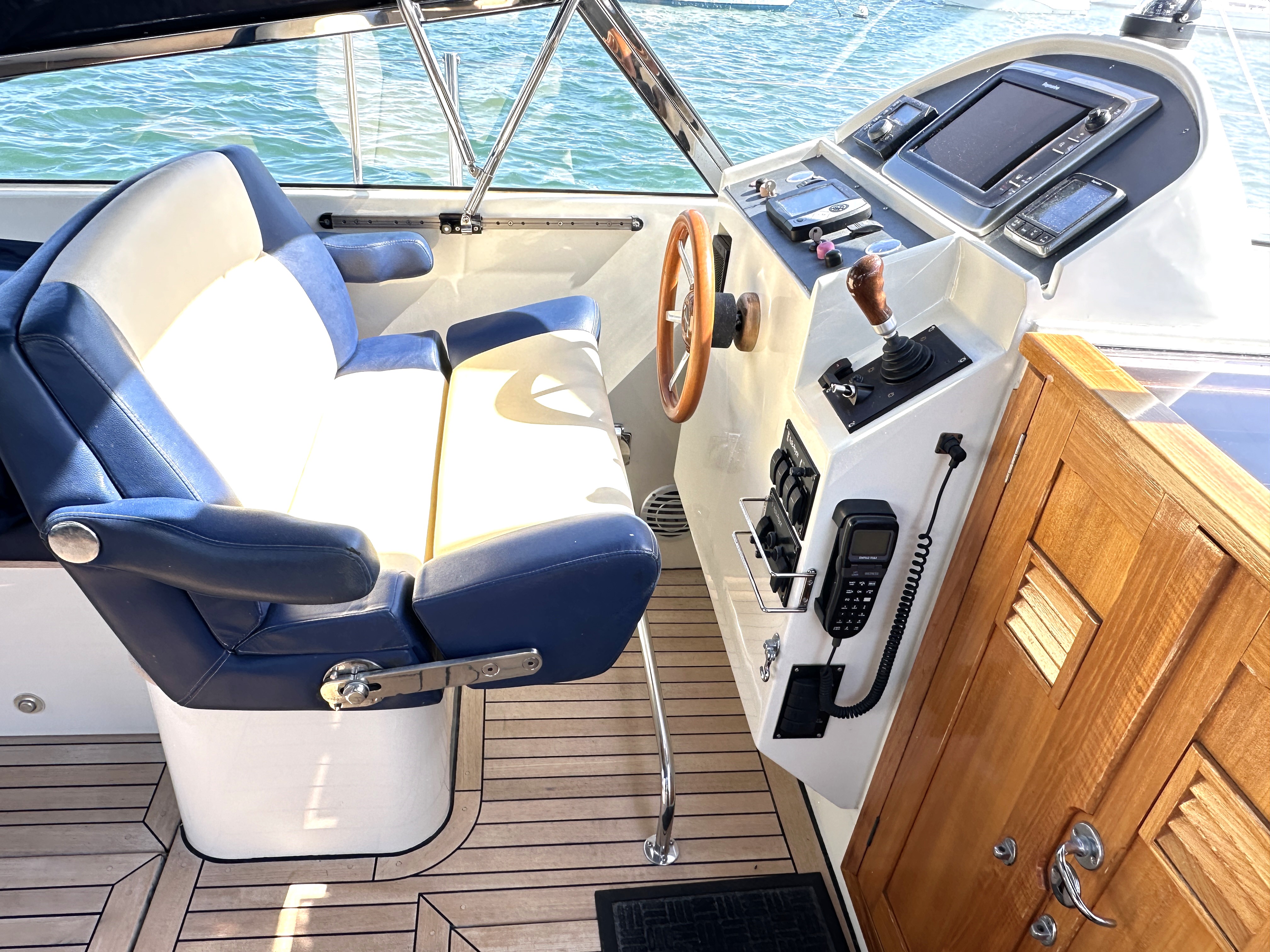 Large central cockpit with pilot & co pilot seats, sociable seating either side for up to eight surrounding a teak table