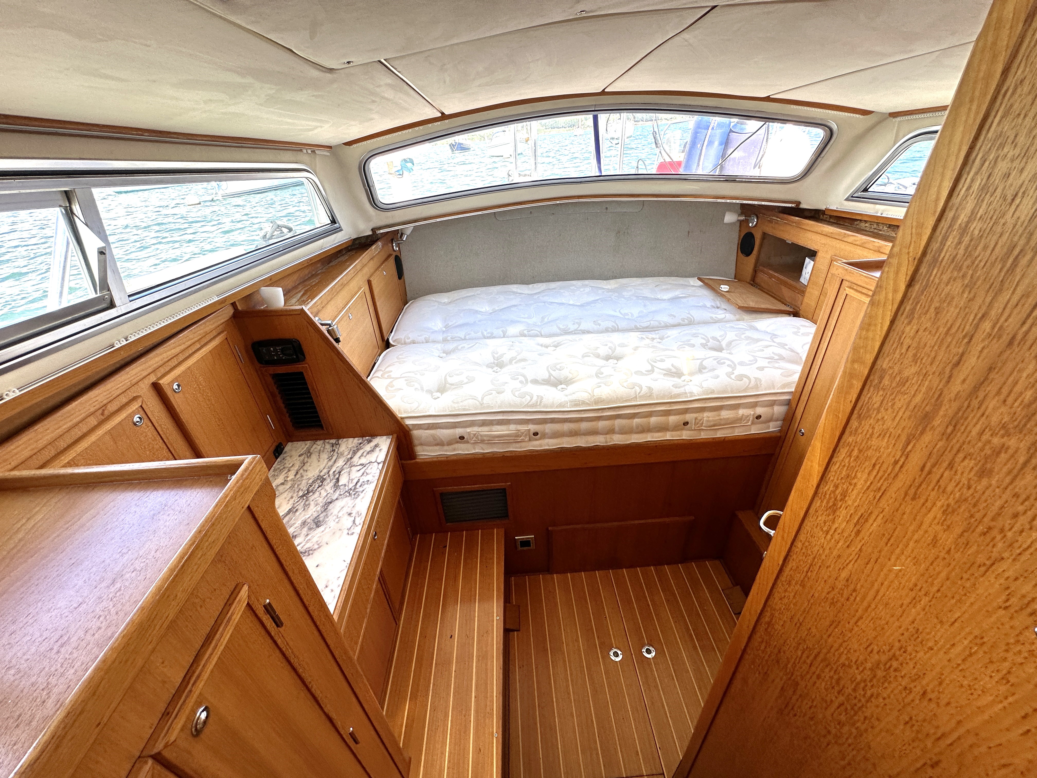 LArge double berth, dressing table, plenty of storage with hanging lickers, drawers and dressing table. Large windows, hatch to aft deck and access to En Suite