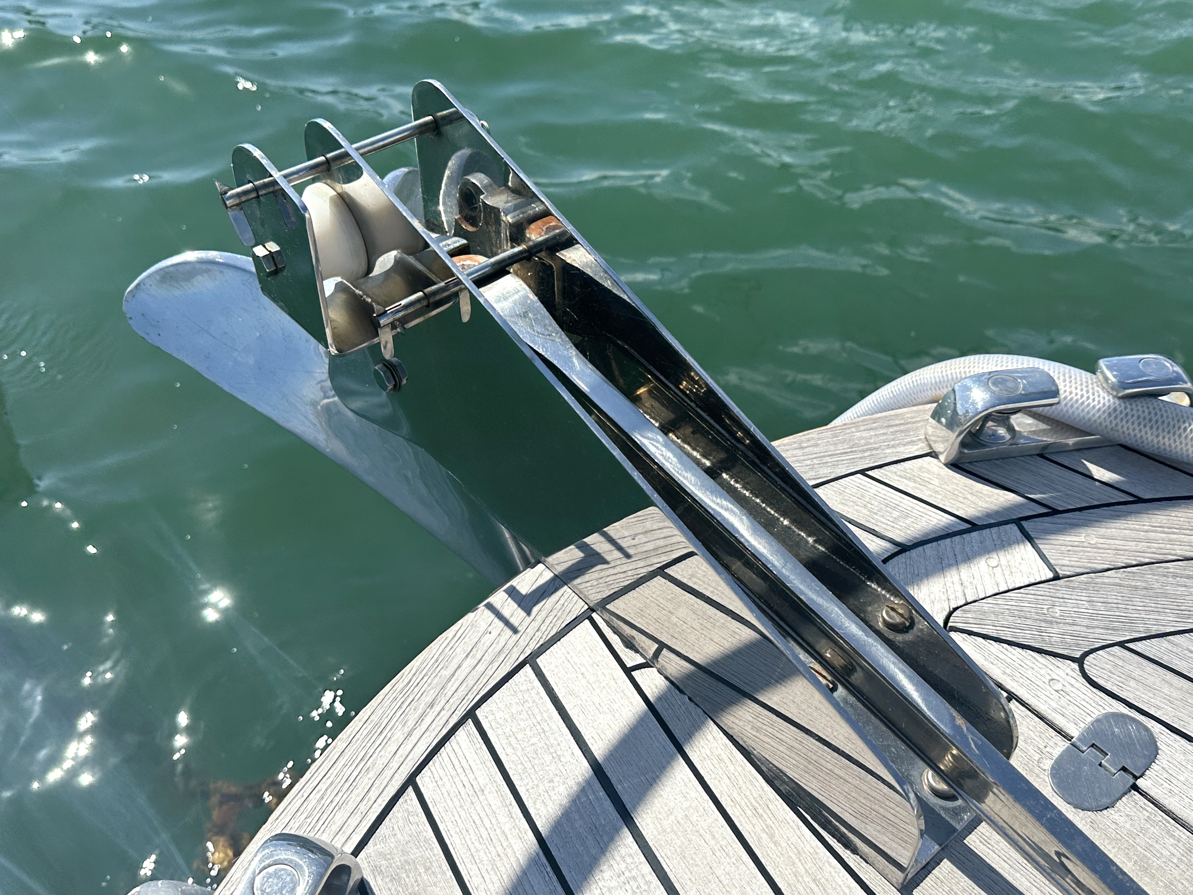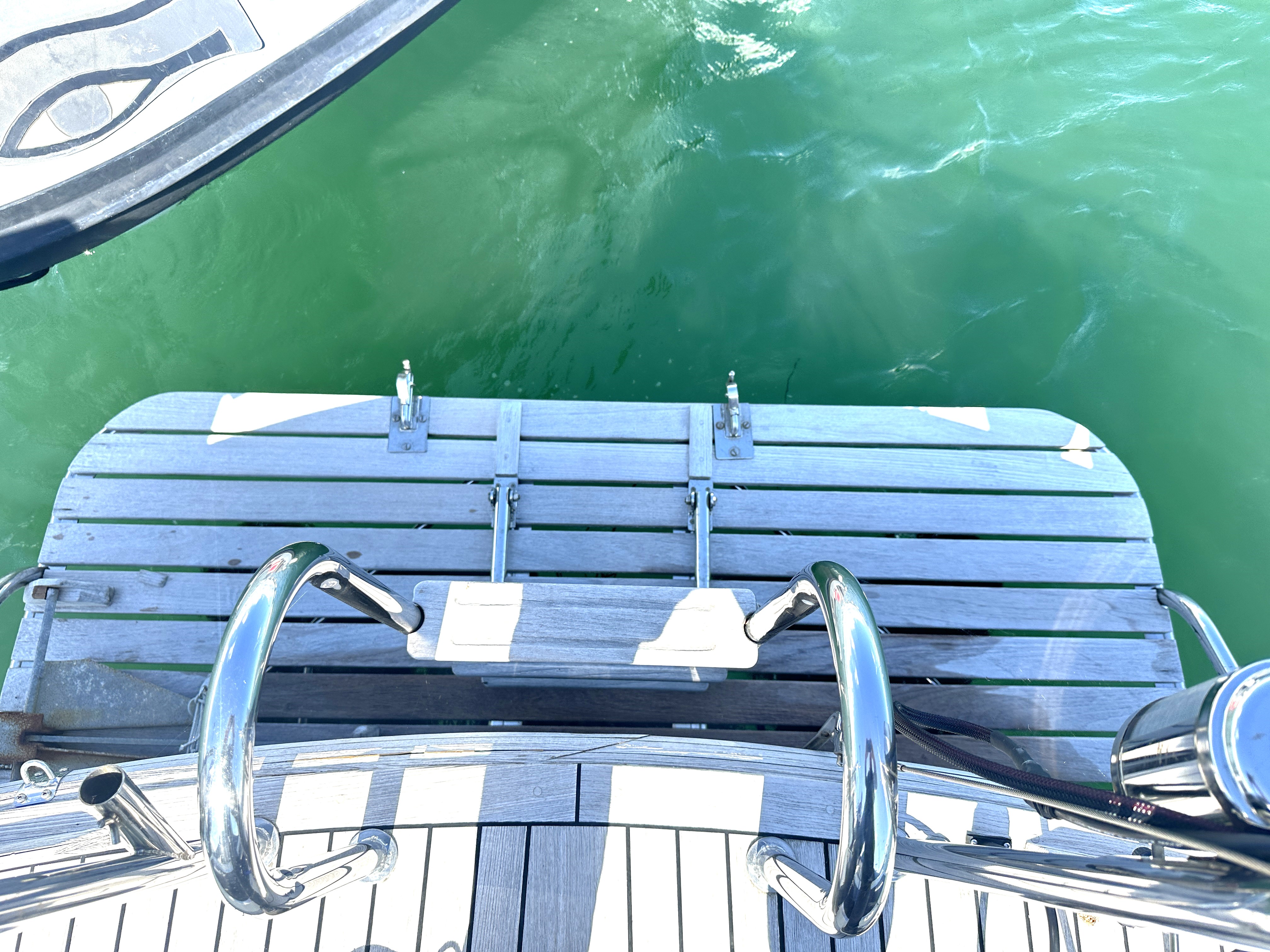 Teak laid stainless steel bathing platform with fold down ladder