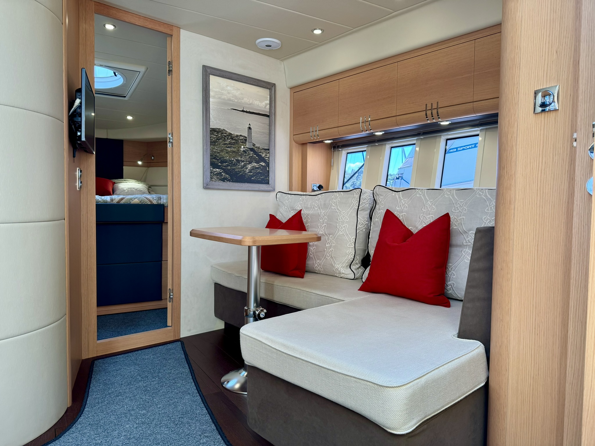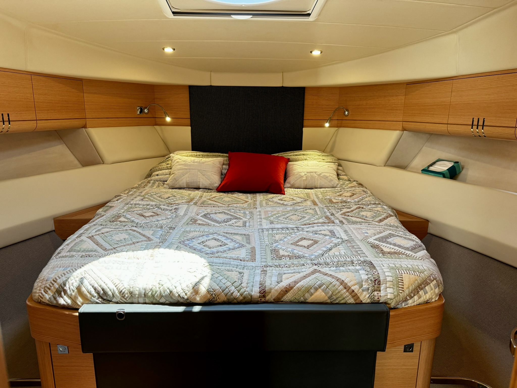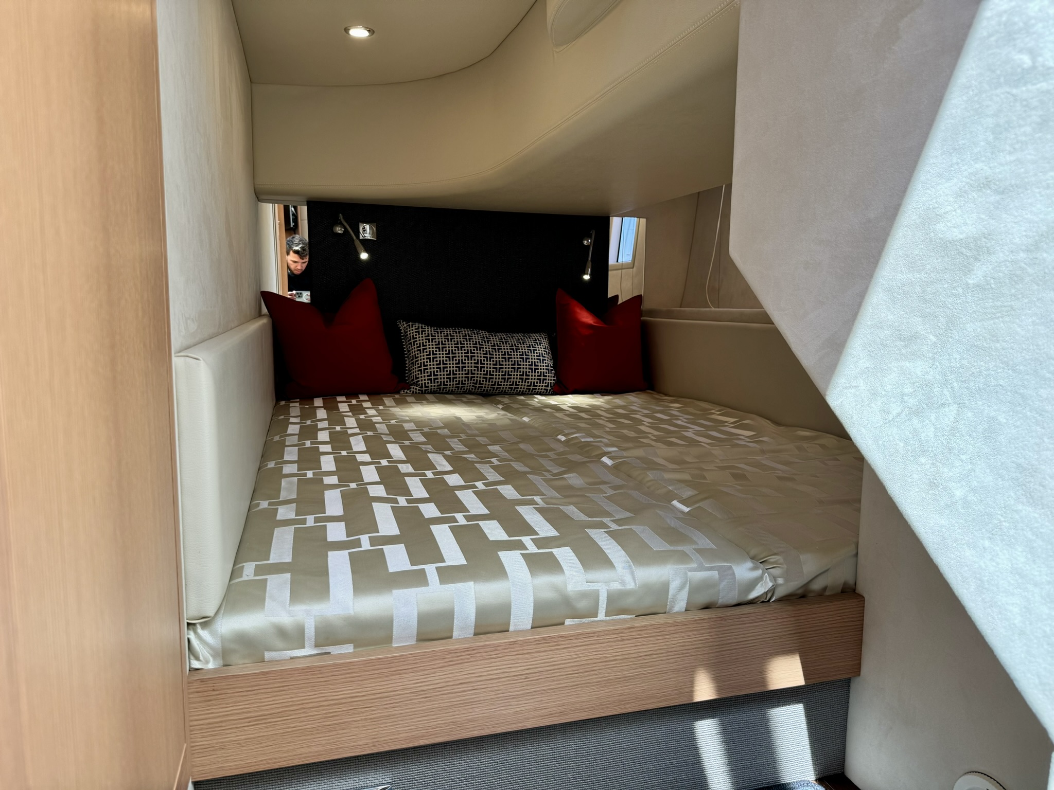 Forward owners cabin with centreline double berth, hanging wardrobe, overhead lockers, storage drawers, 2 x opening portlights, 2 x reading lights and UK mains sockets with USB ports