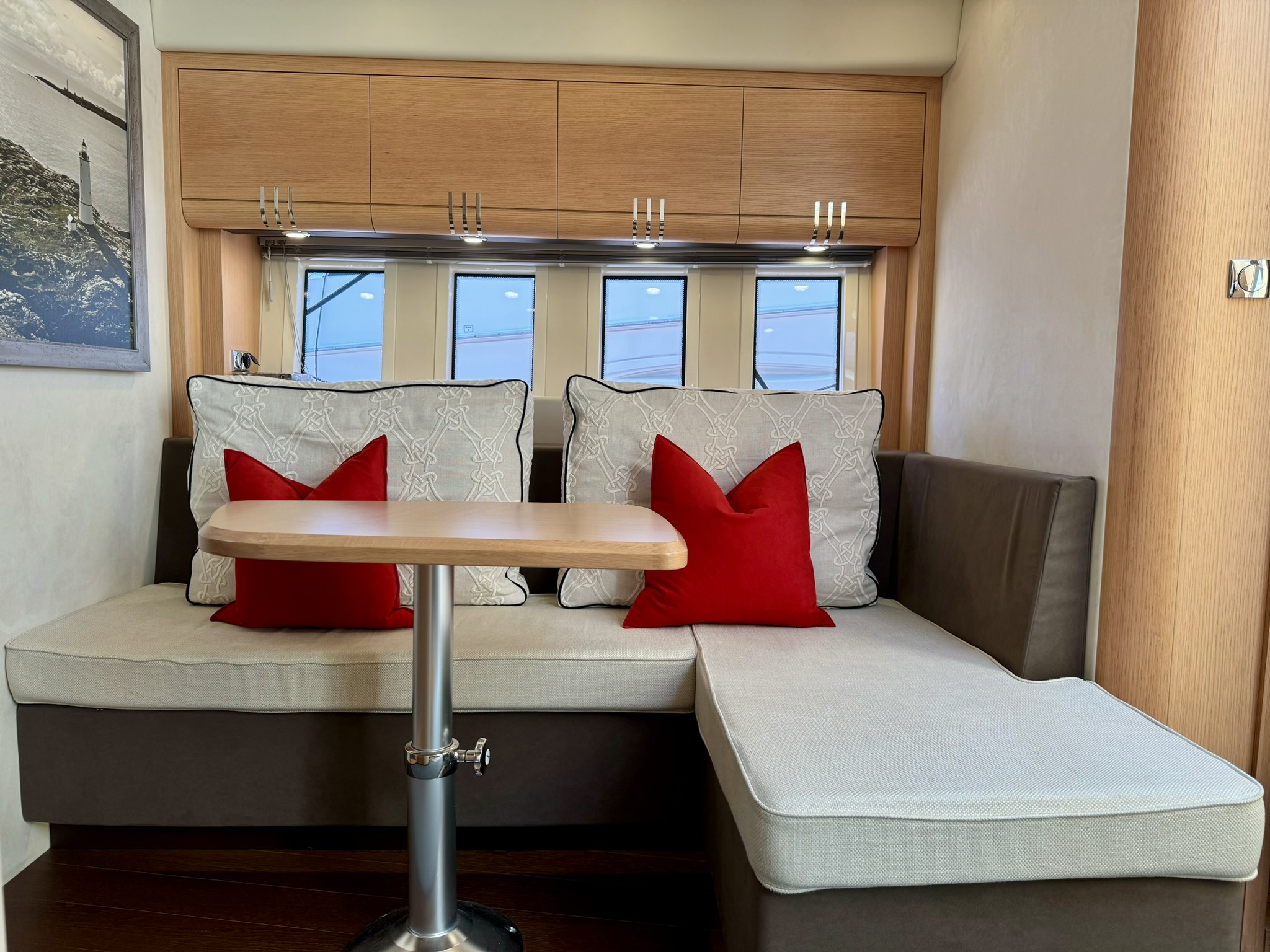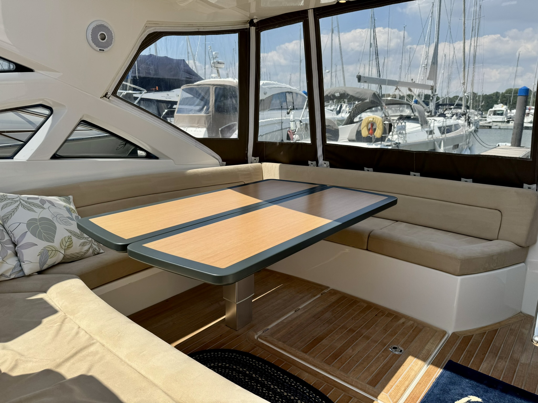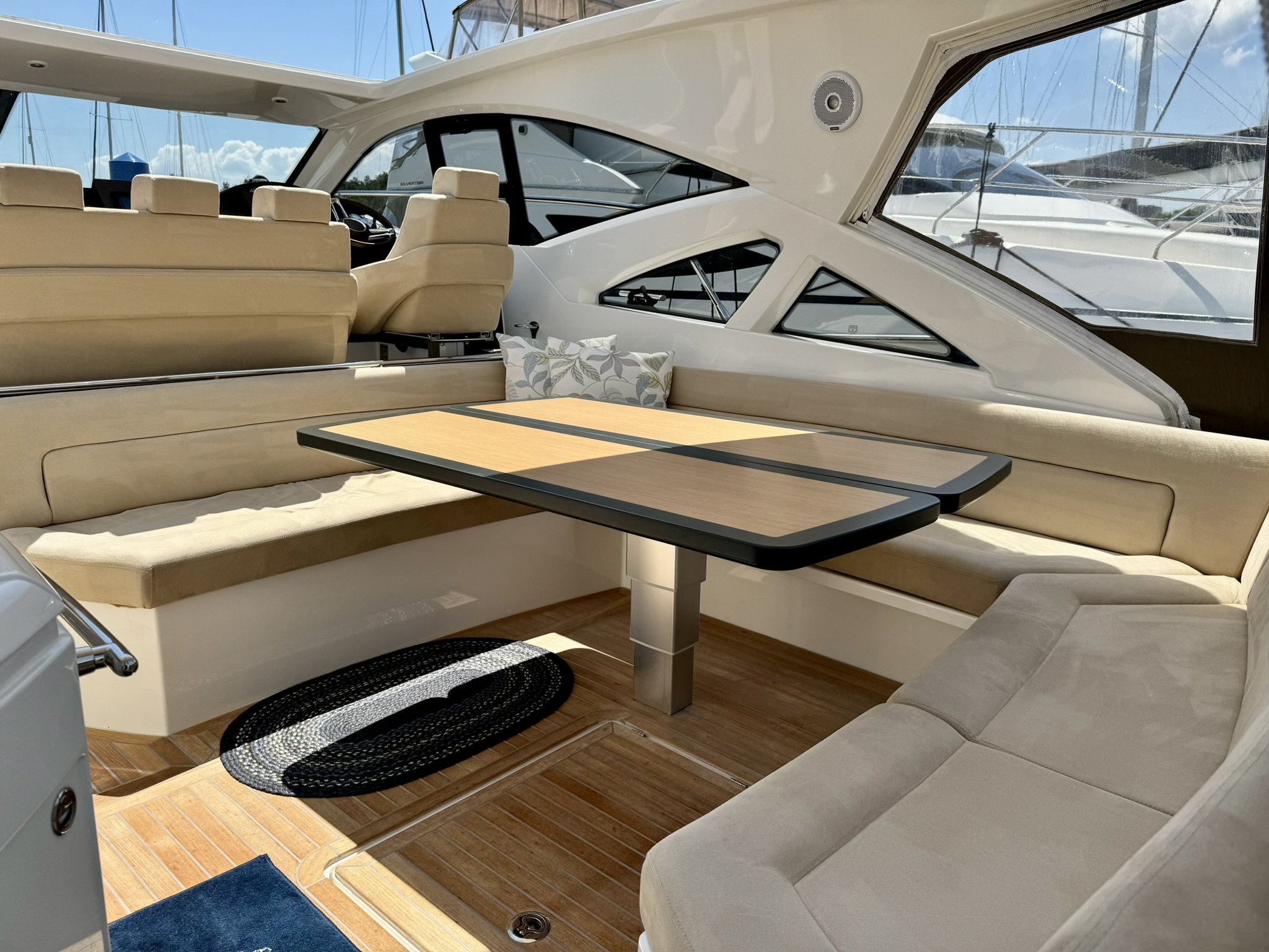 Cockpit seating aft for up to seven around folding leaf table with electric hi/low adjustment
