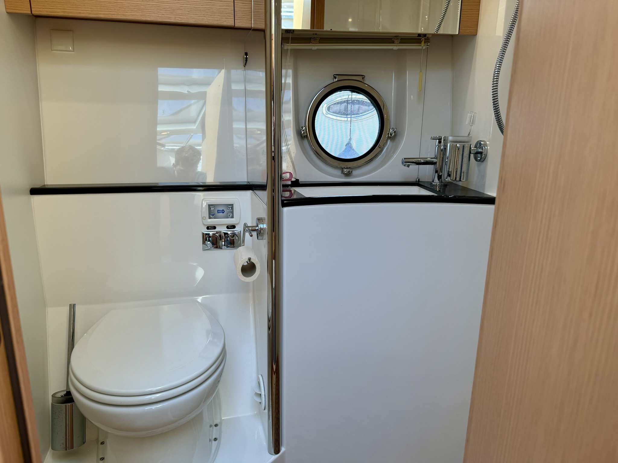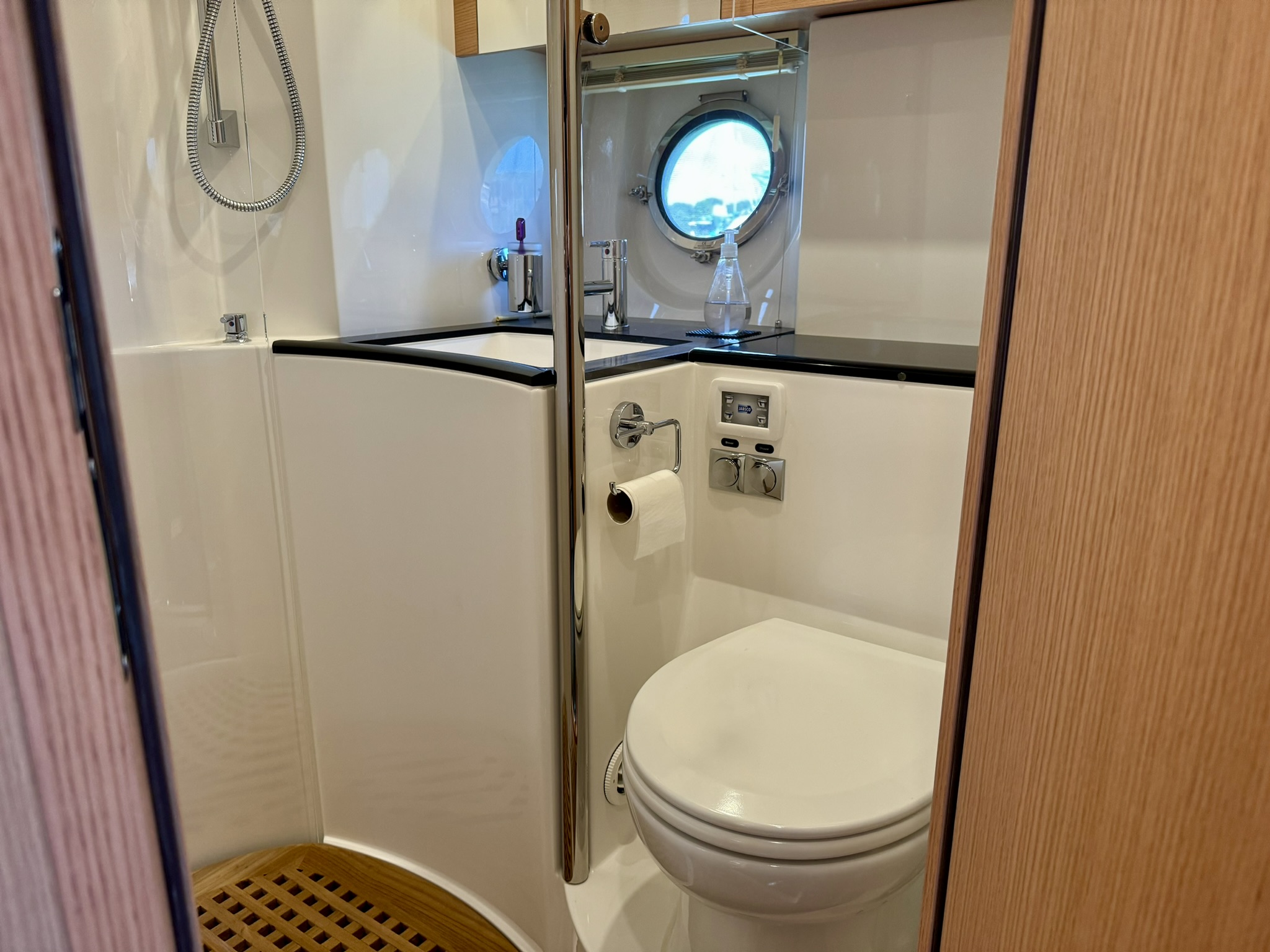 Day heads aft to starboard with separate shower, electric toilet, washbasin, mirror and overhead lockers