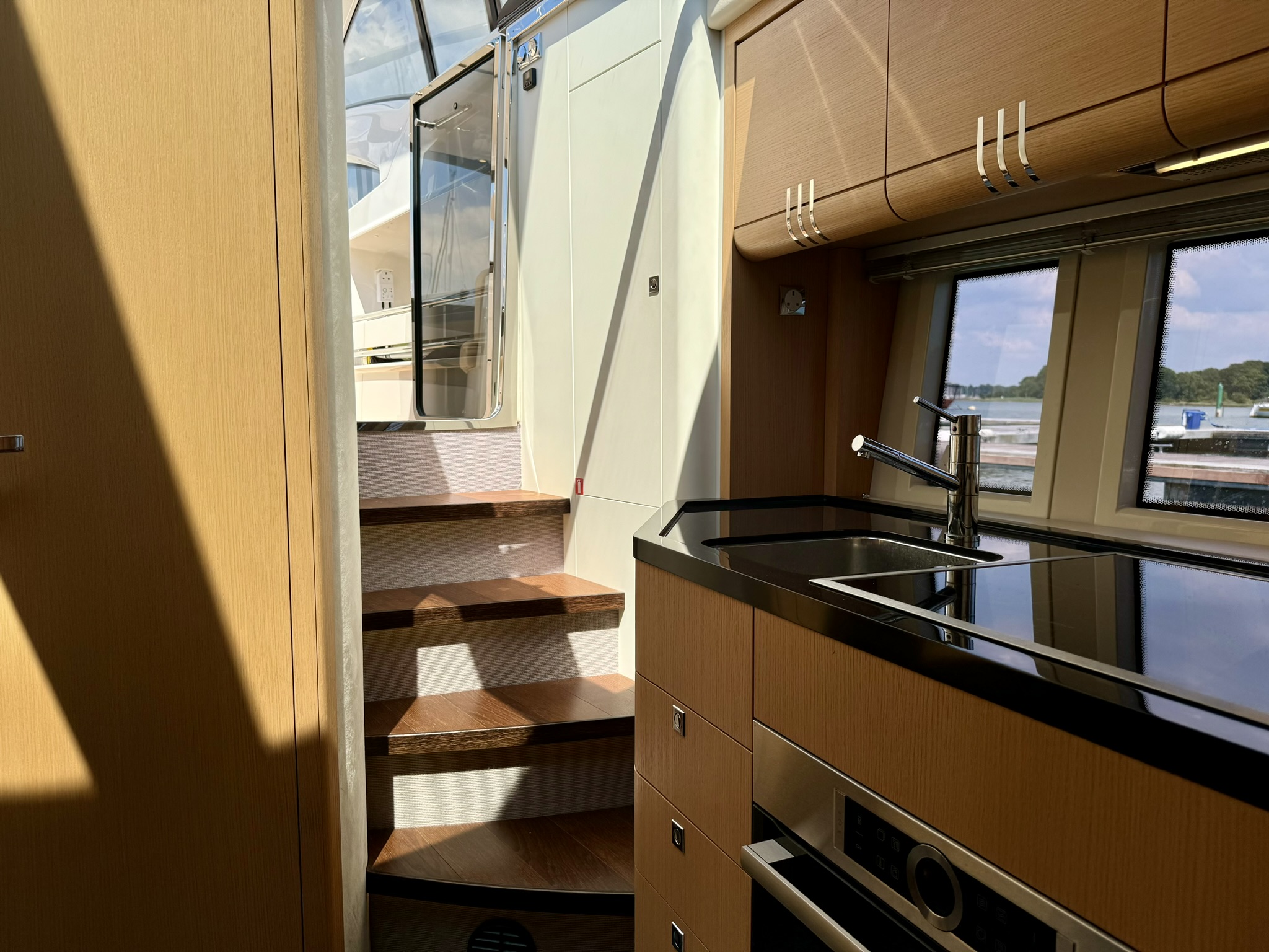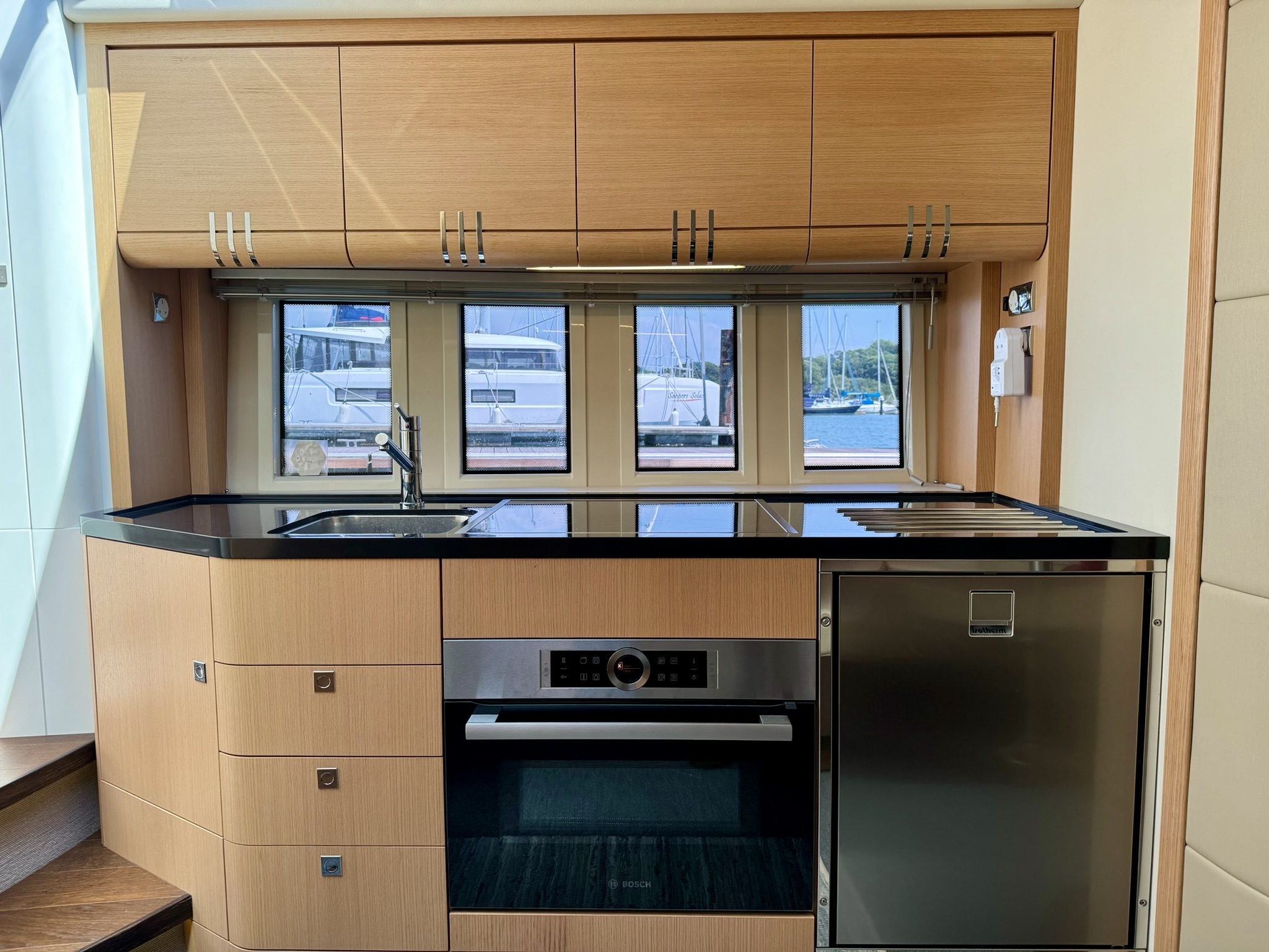 Galley to port with Bosch 4-burner induction hob, Bosch combi oven with grill, 85 litre Isotherm fridge and stainless steel sink with mixer tap