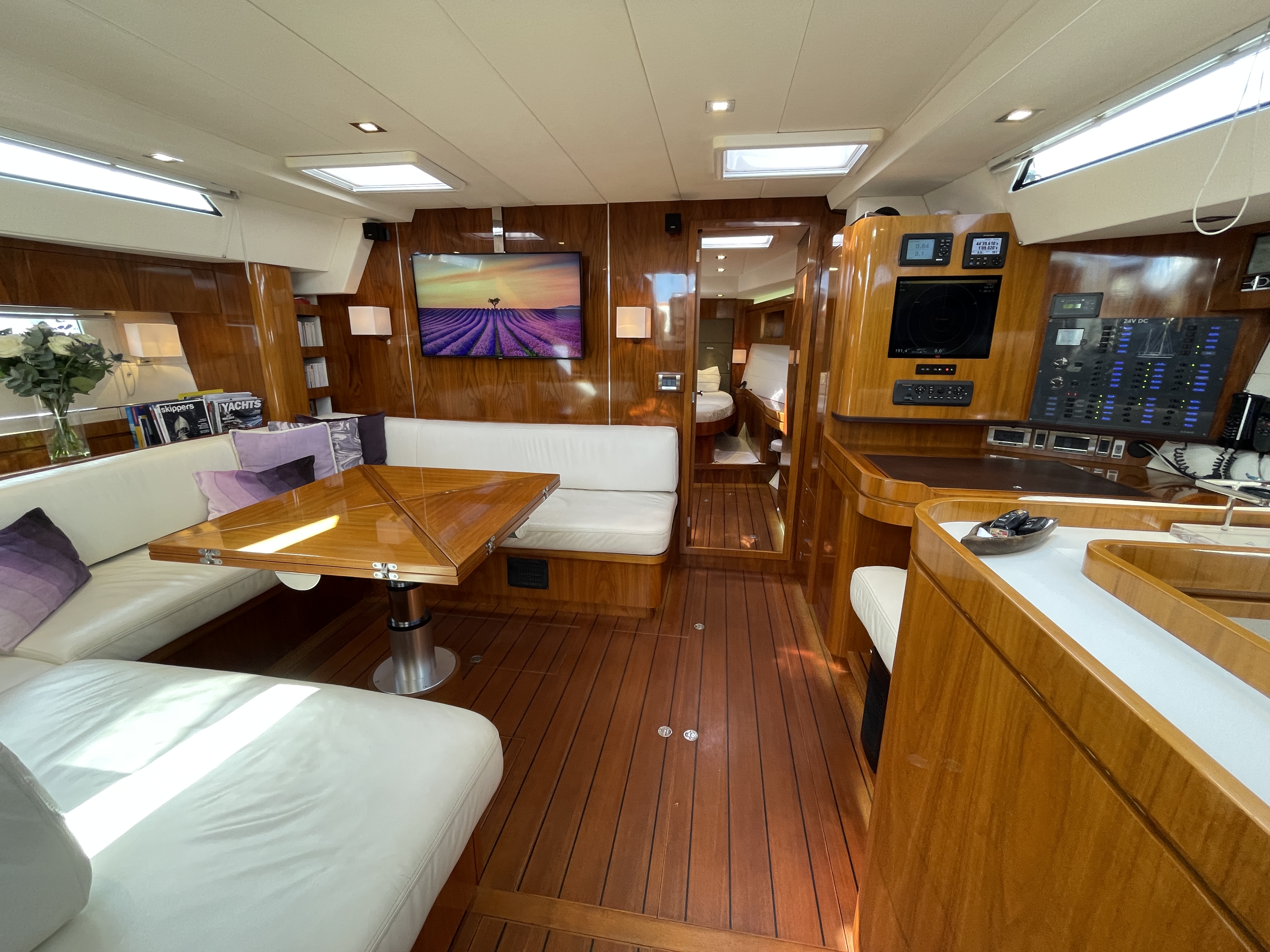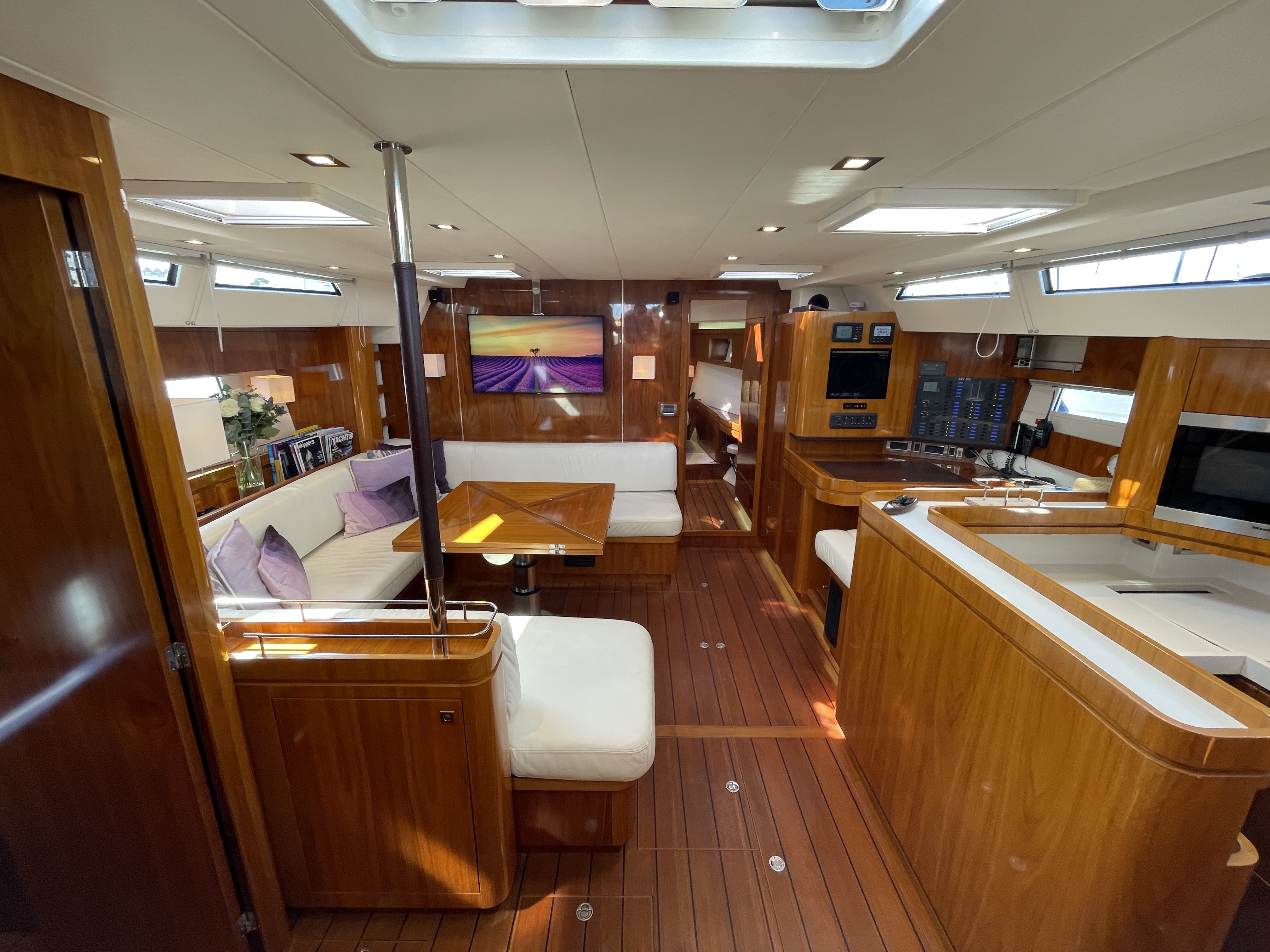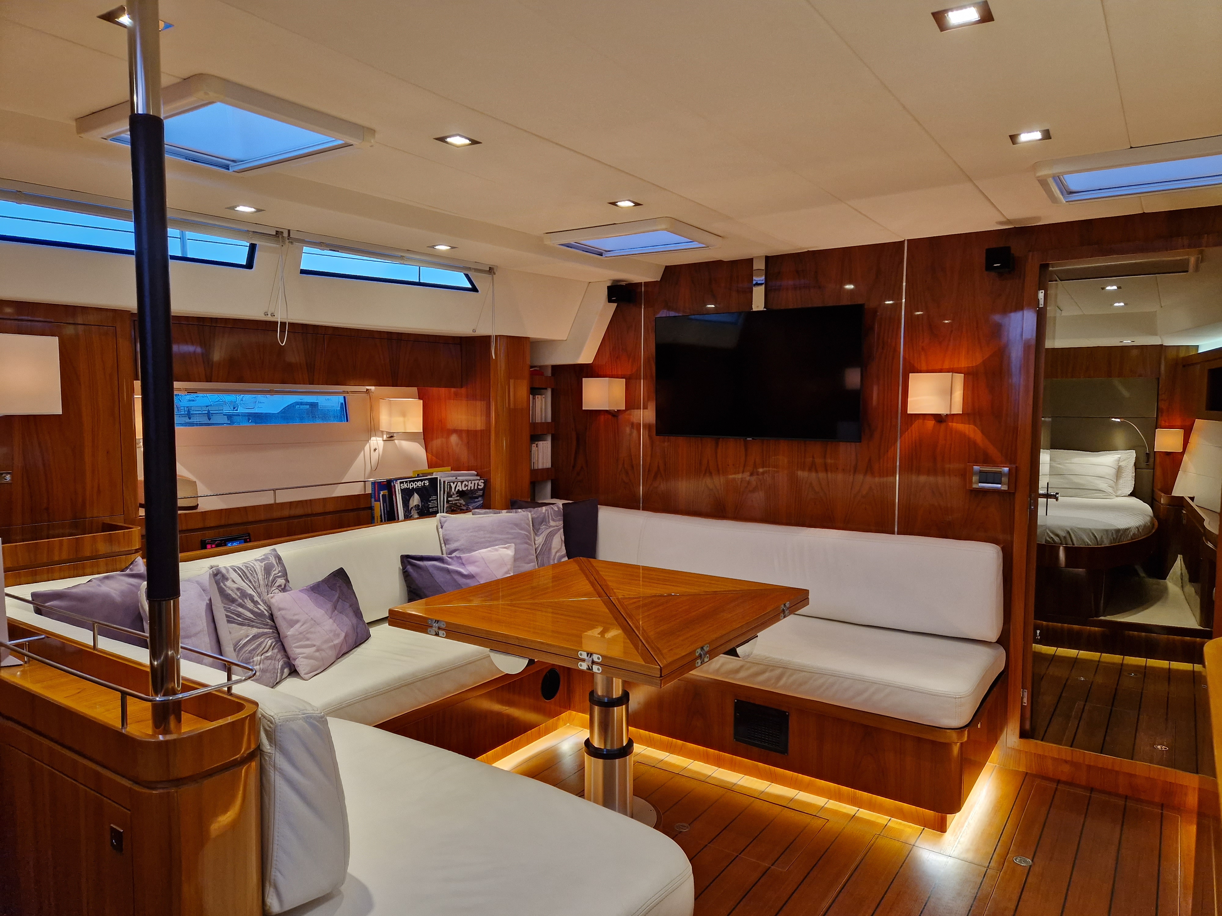 AC, Heating Webasto, Garage, dinghy & HB, Swimming plateform, Bow and Stern Thruster, 240 L H Watermaker instead 150 LH, Recent batteries and upgraded for electrical system (charger, inverter) two mooring with two windlass, full electronics, full set of sails in good condition including Gennaker, full set of covers and sun covers, sun matress, cushions in good shape etc.