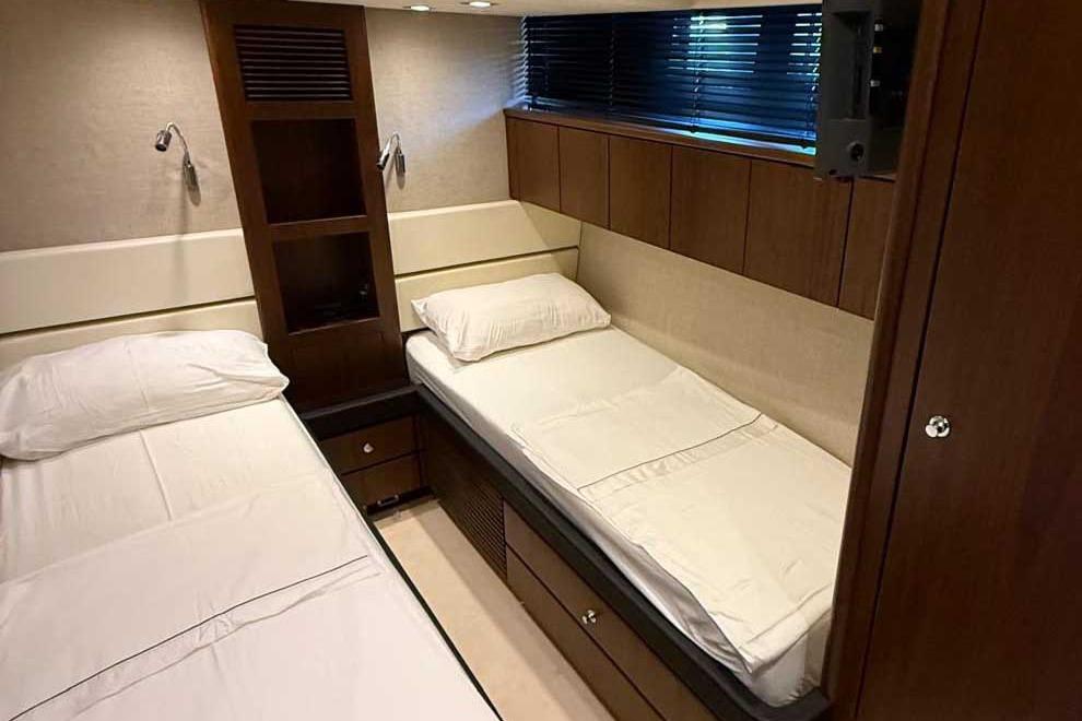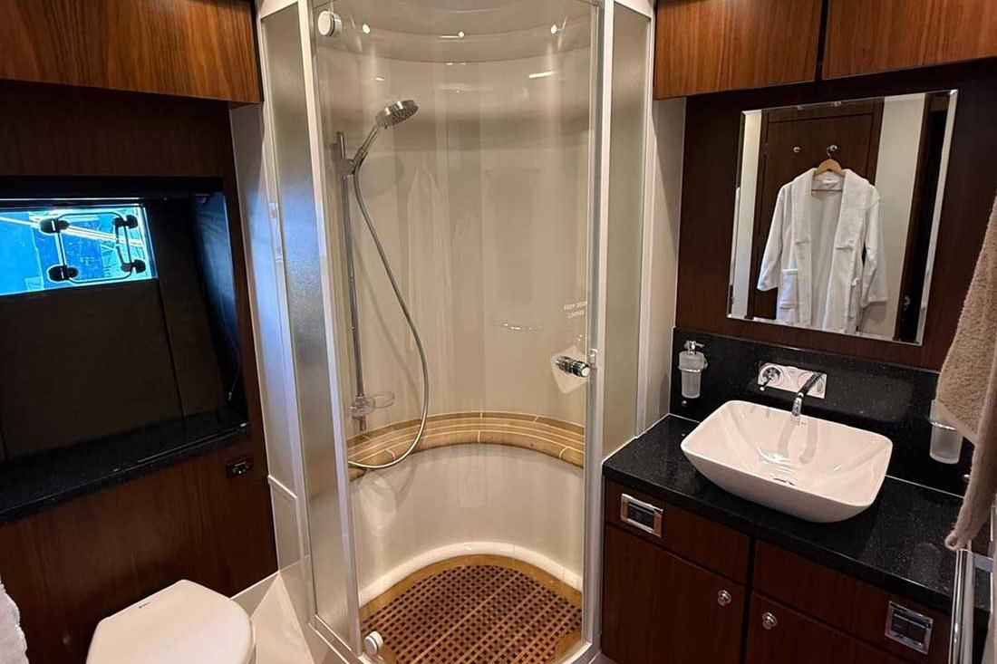 The spacious flybridge, featuring comfortable seating and a bar area, is perfect for entertaining guests, while the bright and airy interior, finished with high-quality materials, offers the comfort of home. With 4 generously sized guest cabins and a separate crew area, the layout is ideal for both family cruising and long-distance voyages.