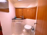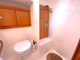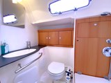 Day head to port aft of galley with sink, mixer tap, manual toilet, shower compartment, cupboards and mirror