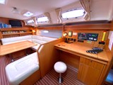 Nav station to starboard aft of saloon seating with chart table, stool and shelf