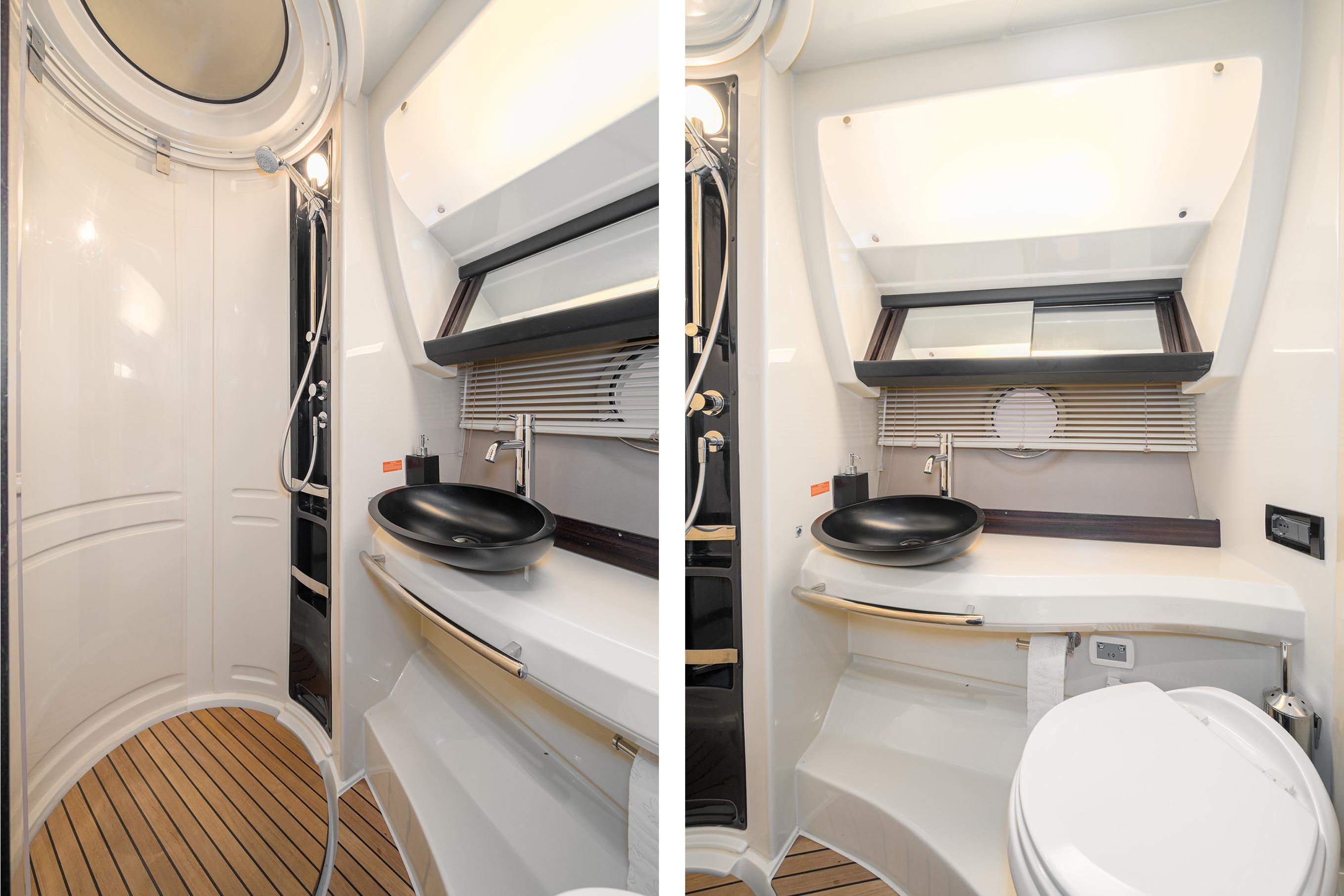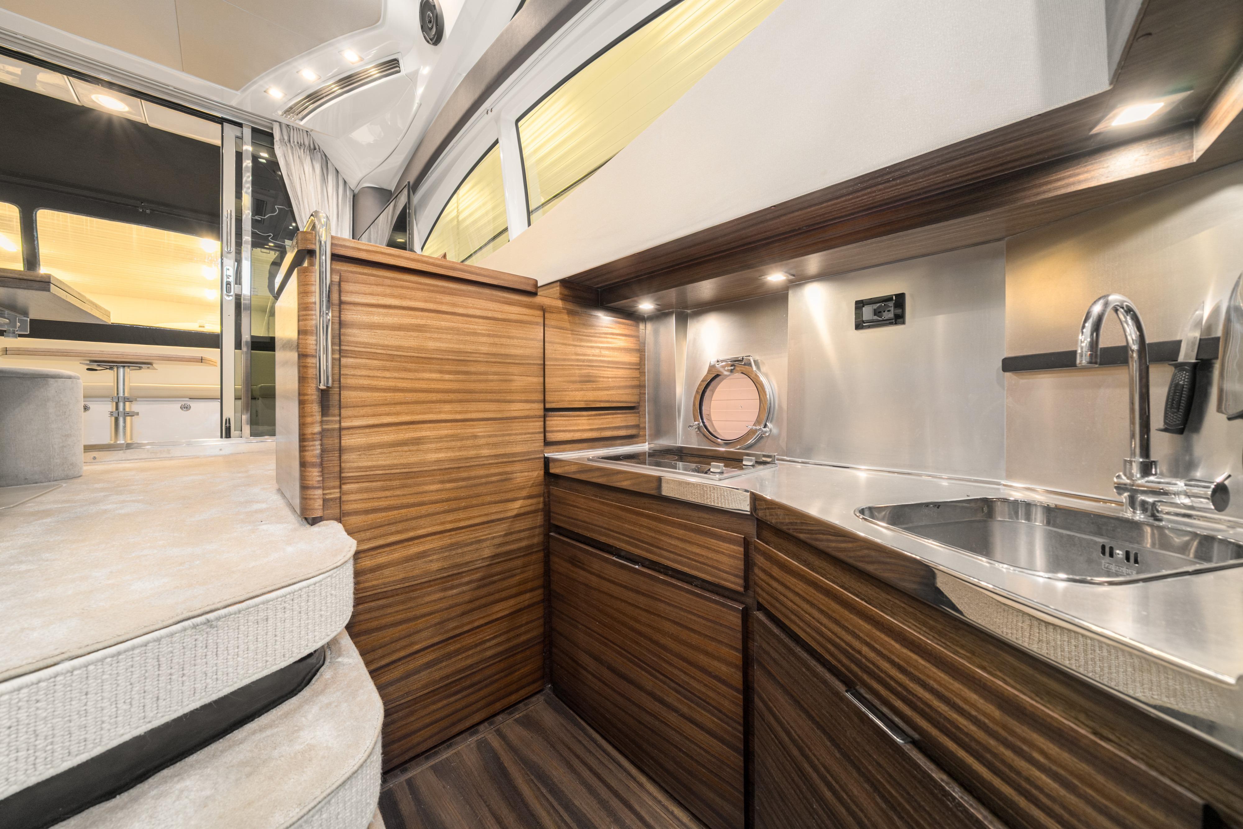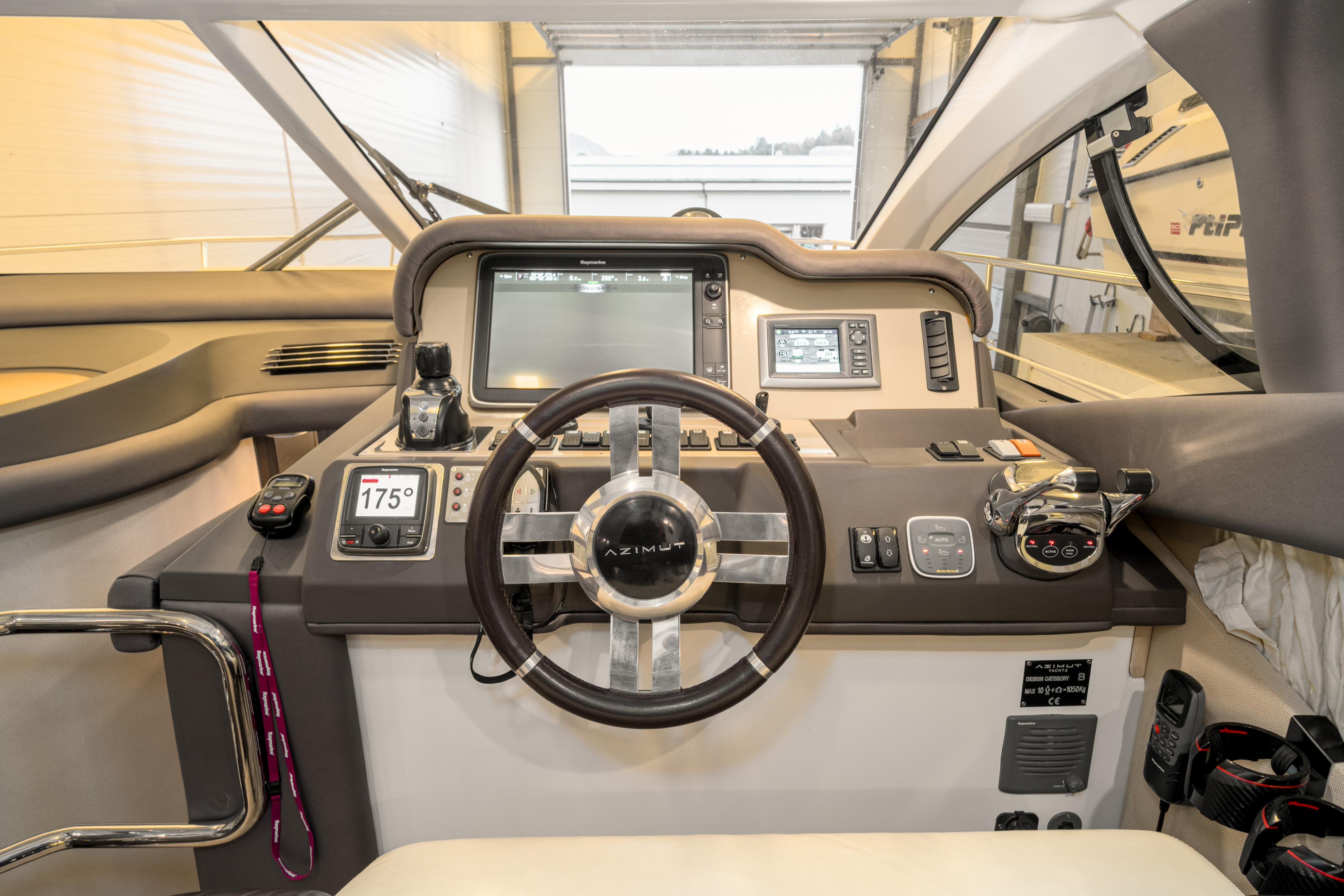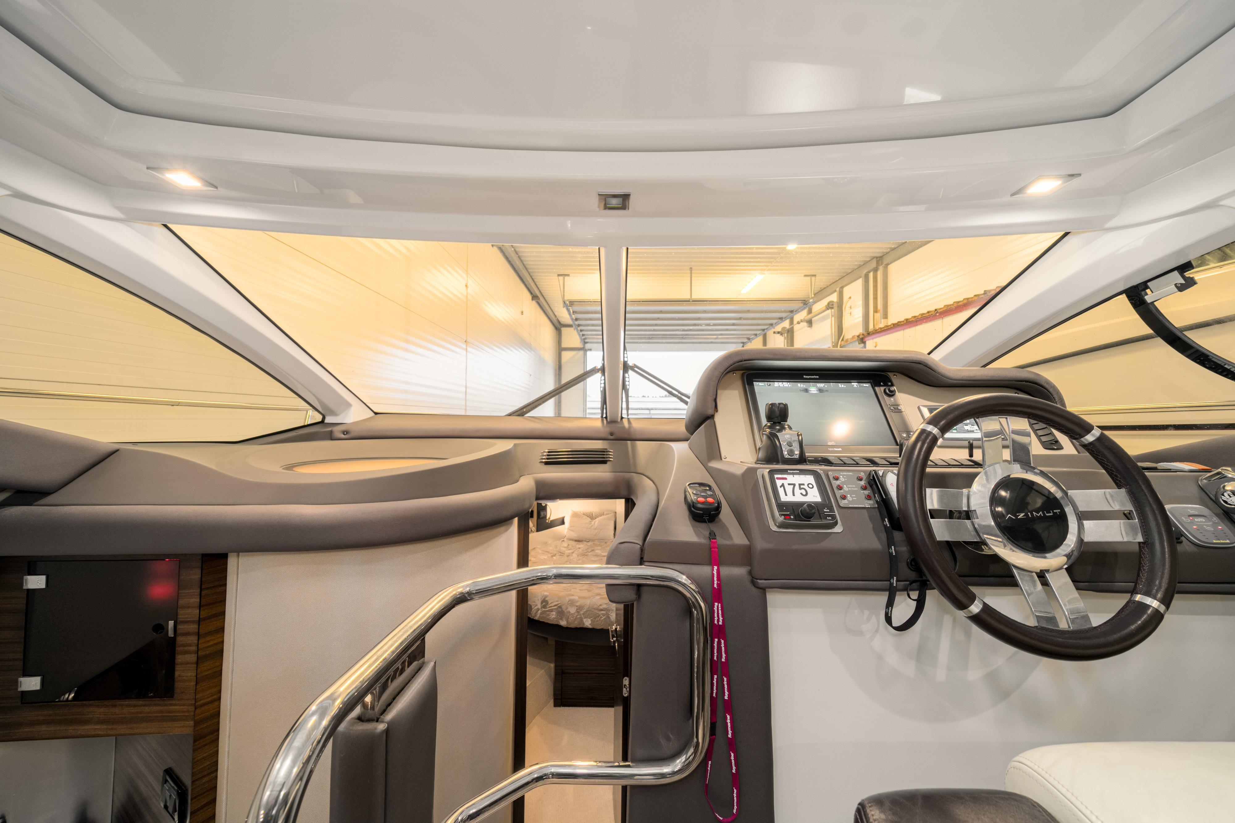 Inside the main saloon, the premium feel continues — warm, inviting materials with contrasting leathers, beautifully crafted woodwork and large surrounding windows. The signature curved side windows of the Azimut S-series provide excellent natural light and visibility for both the helmsman and guests. The compact but well-equipped galley on port includes a sink, stove, microwave and refrigerator with freezer. The helm station to starboard is elevated, ergonomic and offers very good visibility. Twin engines, thruster and joystick make the 40S remarkably easy to handle for its size.